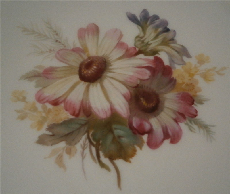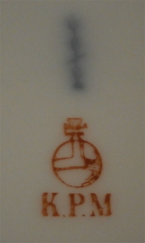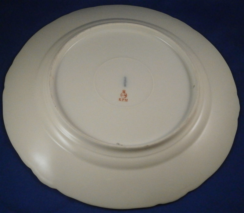 This is another superb dinner plate made by KPM in the early 20th century. It is hand painted with a superb flower design in the center that is just amazingly detailed! The Weichmalerei colors KPM used during this period are just amazing! Not sure what flowers these are but they include pink, yellow and purple ones including some leaves. The rim itself is painted with gold on a raised design. The plate is in great condition with very minimal use marks. It is the rare dinner plate size which is very very hard to find unlike the smaller versions of these plates! The piece is 10 inches in diameter and 1 inch tall. The plate is marked underneath with the underglaze blue scepter, the red orb mark, some black numbers and letters, a painter's as well as gilder's mark and the usual impressed marks of this period. Please email me for more information or other pictures.