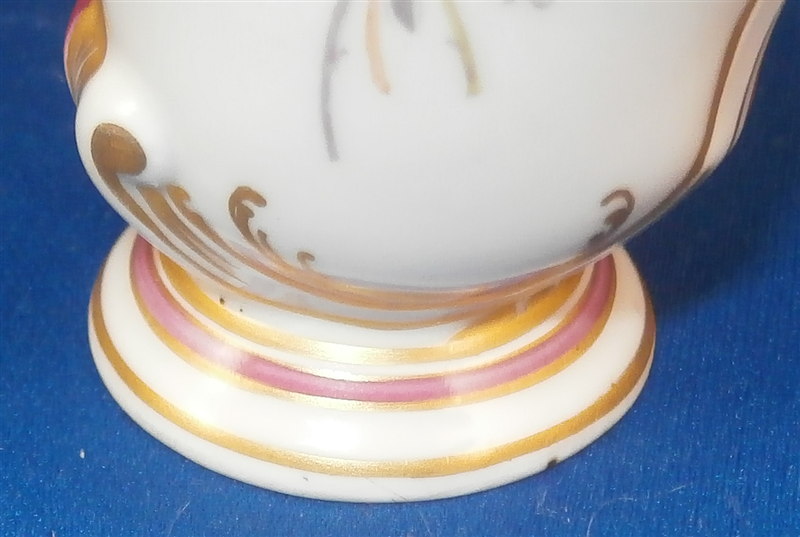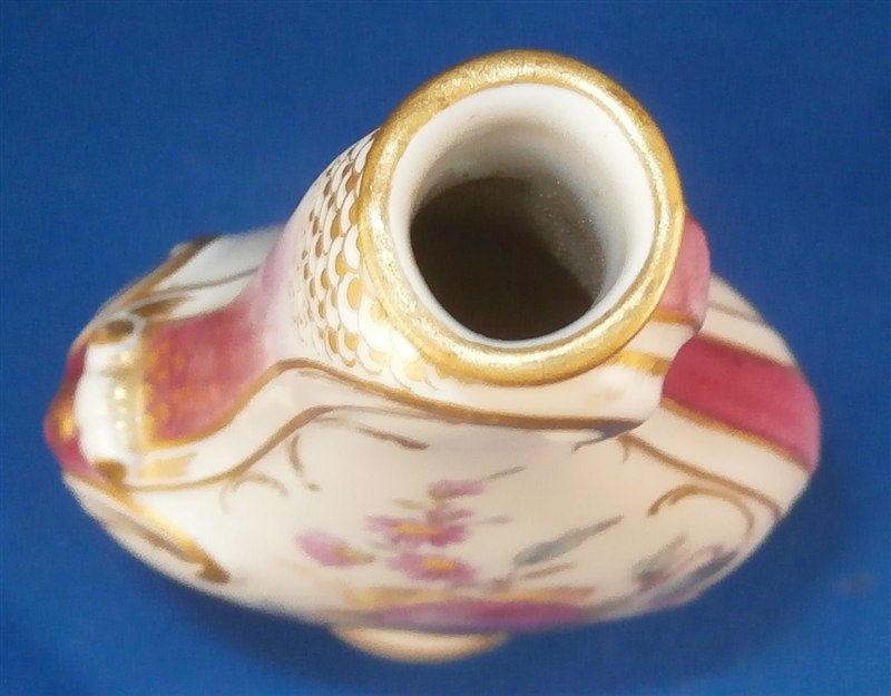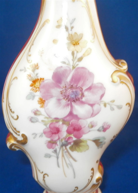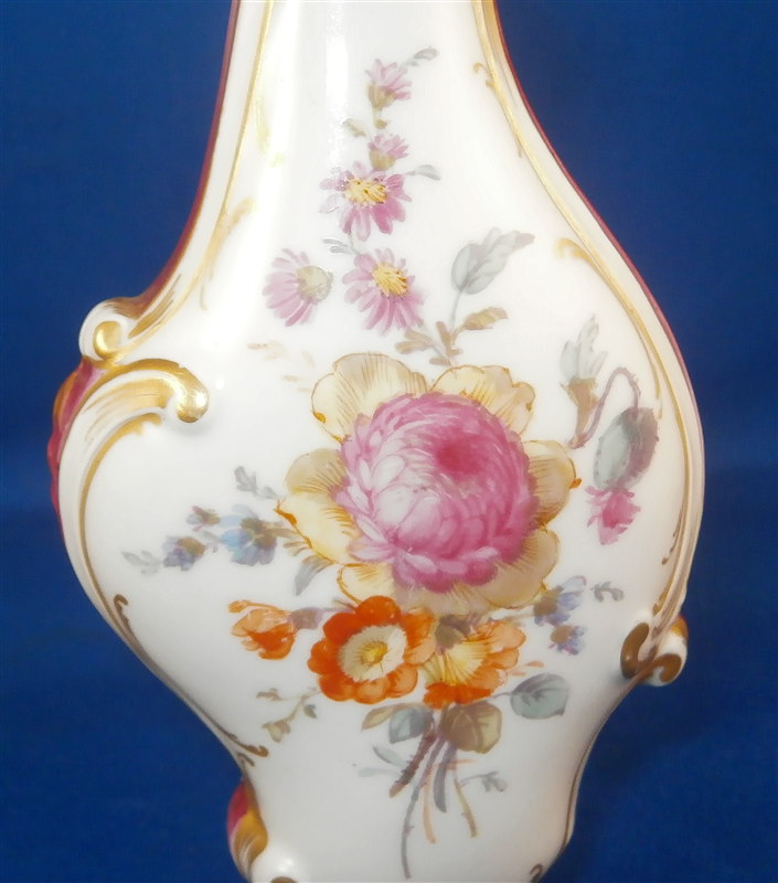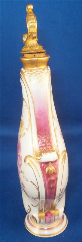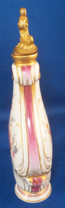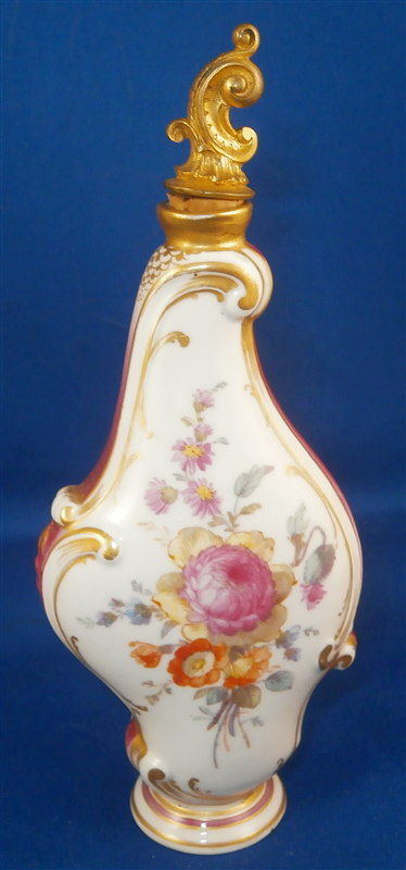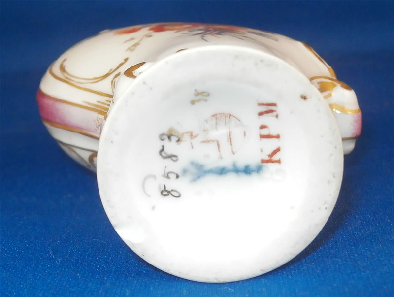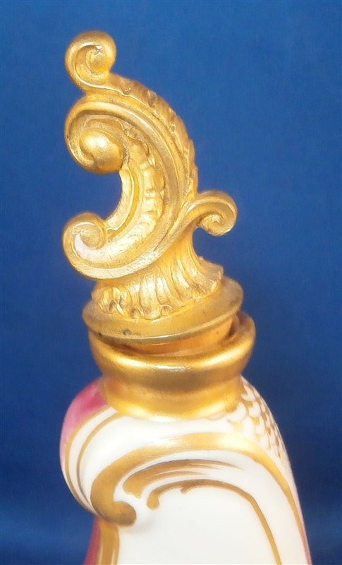 This is a superb perfume bottle made by KPM in the early 20th century. It is handpainted very nicely with two floral arrangements, lots of gold highlights around the sides which have a fading (on purpose) puce ground color with a gold scale deisng on that. It still has its nicely shaped original metal stopper as well as the original cork on it. It is a bit loose since the cork is old and has been openend so many times over all these years but that is normal! The piece is marked underneath with the underglaze blue scepter mark, the red orb as well as some black numbers, etc. The perfume bottle is 5.5 inches tall with the stopper, 2.25 inches wide and 1.25 inches deep. The piece is in great condition with jsut a shallow flake to the underside rim which doesn't show when on display. Please email me for more information or other pictures.