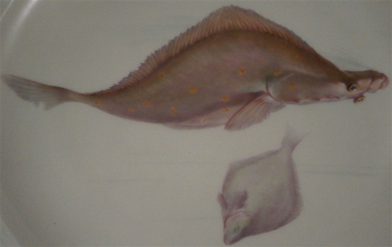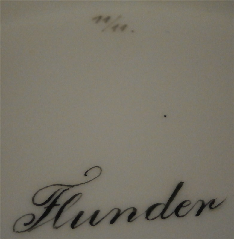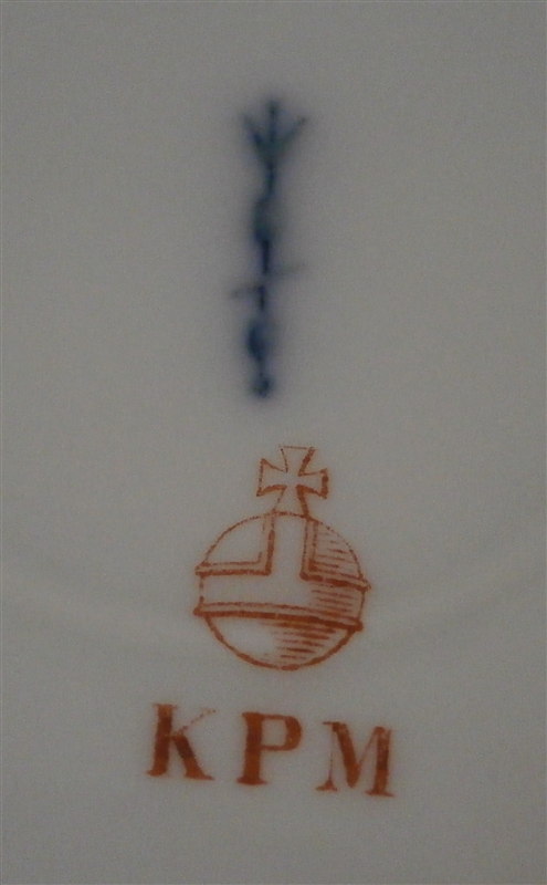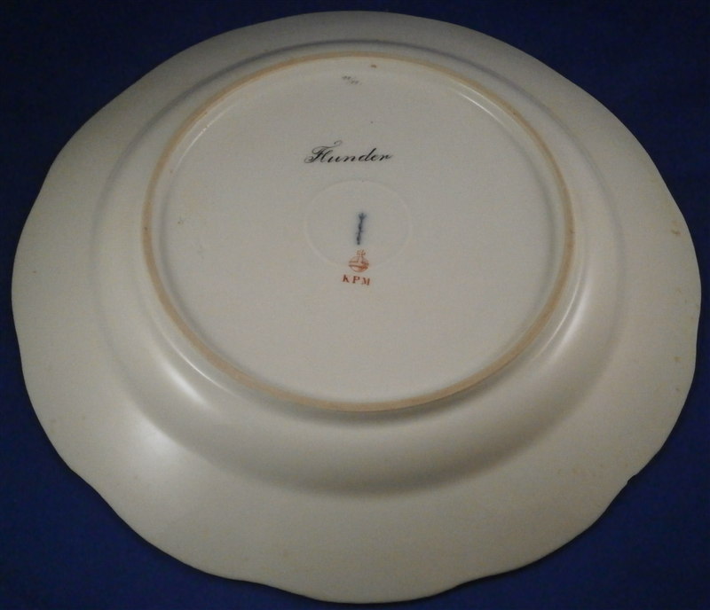 This is a superb plate made by KPM in the early 20th century. The plate is hand painted with a fish design in the center including a large flounder as well as a smaller one with a slight blue tint and water lines filling the rest of the well of the plate. The rim has a nice raised basket weave design to it with a gold trim to the nicely shaped edge. The piece displays perfectly but has a thin chip off the very edge of the palte as shown. The plate is 1.25 inches tall and 9.625 inches in diameter. It is marked underneath with the underglaze blue scepter as well as the red orb mark and the usual impressed marks, a painter's mark, a black 11/11 as well as the name Flunder which means flounder in German. Please email me for more information or other pictures.