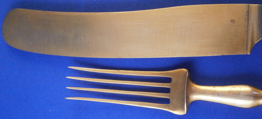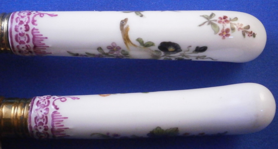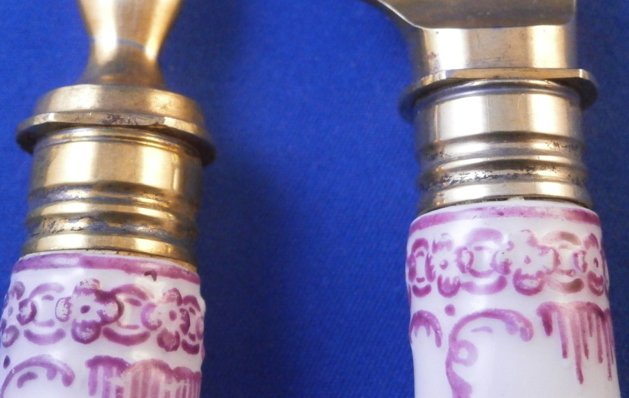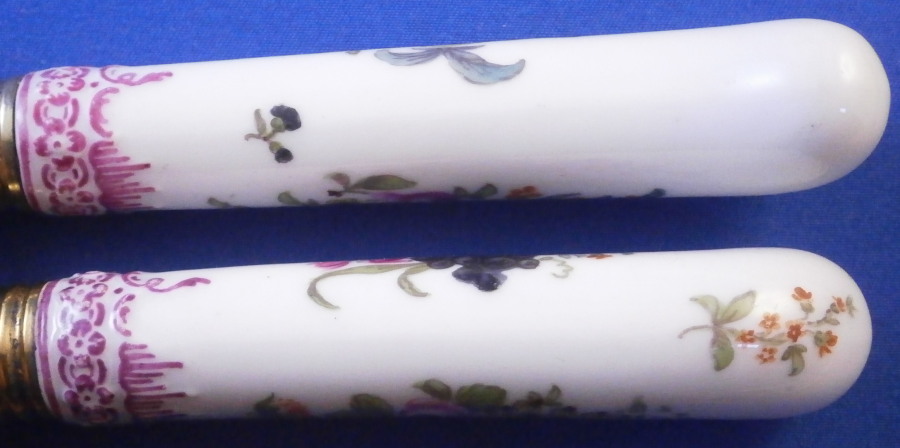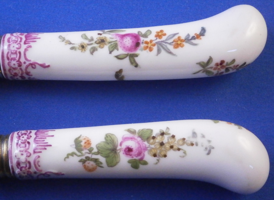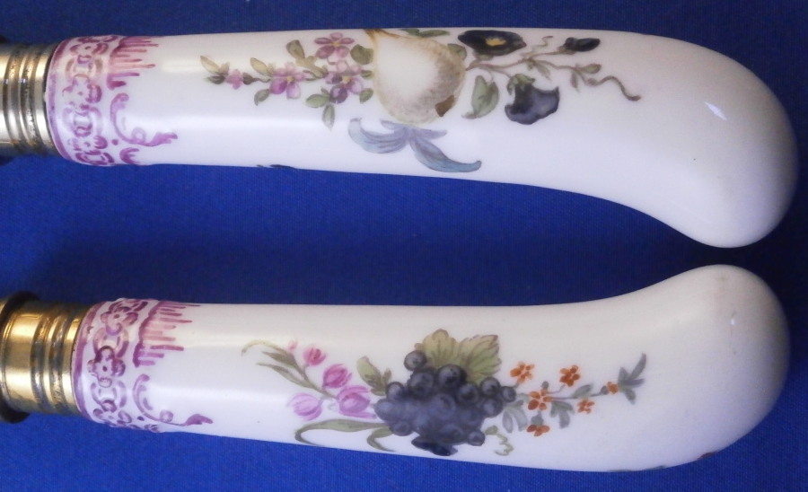 This is a really nice knife and fork set made by KPM in the 18th century. Each handle has two hand painted floral and fruit arrangements to them in the typical style of KPM as well as a smaller single flower and a relief design to the end near the ferrule highlighted with puce. A very typical design for this maker. The design is called Koenigsglatt I believe. The metal parts are original and are likely gold washed silver but they are not marked so not sure of the metal underneath the gold wash. The metal parts do not go all the way through to the end of the porcelain which is common to some makers early on but these are certainly made by KPM around this time period. The set is in great condition with a very minor touch of wear. They display perfectly. I have 4 more of these sets if anyone is interested in a few. The fork is 8 inches long of which 3.375 inches is the length of the visible porcelain handle. The knife is 9.75 inches long of which 3.5 inches is the length of the visible porcelain handle. The handles are about 0.75 inches wide. The porcelain is not marked or shall we say visibly marked since it would be hidden by the ferrule if it were to be marked which is normal. My daughter always asks why the tines on the fork of these old pieces are so much sharper / pointier than modern one :) Please email me for more information or other pictures.