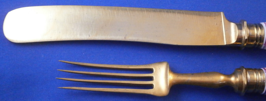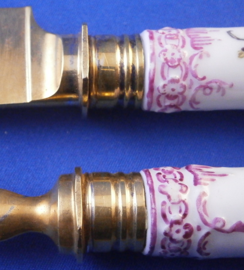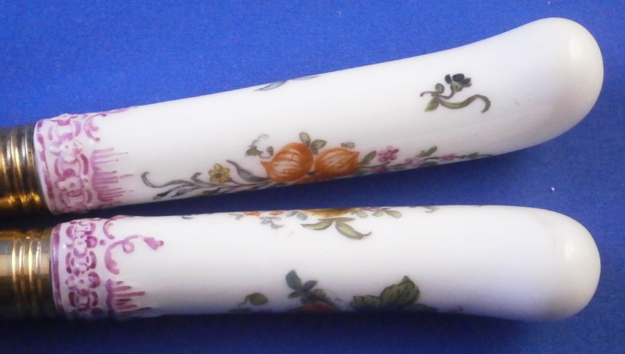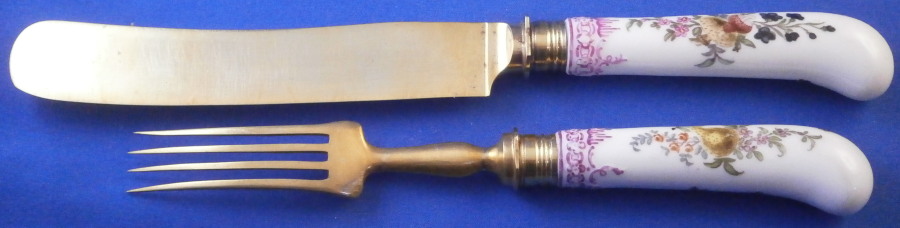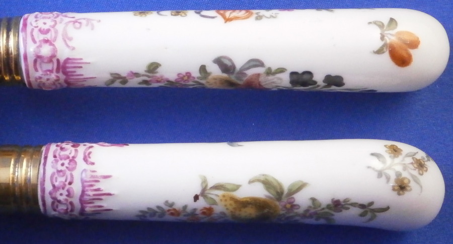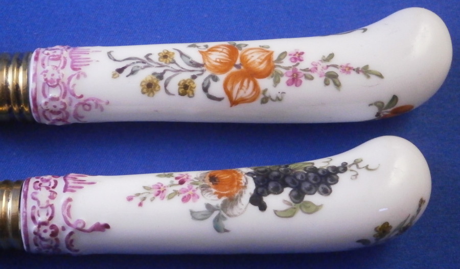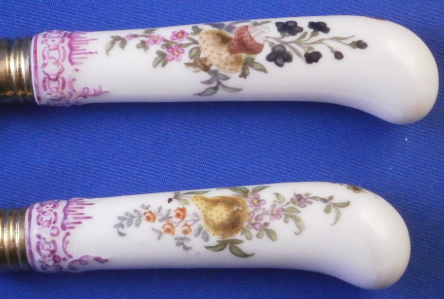 This is another really nice knife and fork set made by KPM in the 18th century. Each handle has two hand painted floral and fruit arrangements to them in the typical style of KPM as well as a smaller single flower and a relief design to the end near the ferrule highlighted with puce. A very typical design for this maker. The design is called Koenigsglatt I believe. The metal parts are original and are likely gold washed silver but they are not marked so not sure of the metal underneath the gold wash. The metal parts do not go all the way through to the end of the porcelain which is common to some makers early on but these are certainly made by KPM around this time period. The set is in great condition with a very minor touch of wear. They display perfectly. I have 4 more of these sets if anyone is interested in a few. The fork is 8 inches long of which 3.375 inches is the length of the visible porcelain handle. The knife is 9.75 inches long of which 3.5 inches is the length of the visible porcelain handle. The handles are about 0.75 inches wide. The porcelain is not marked or shall we say visibly marked since it would be hidden by the ferrule if it were to be marked which is normal. My daughter always asks why the tines on the fork of these old pieces are so much sharper / pointier than modern ones :) They really are! Please email me for more information or other pictures.