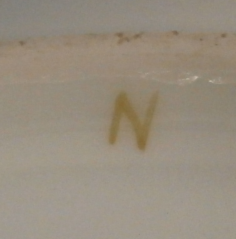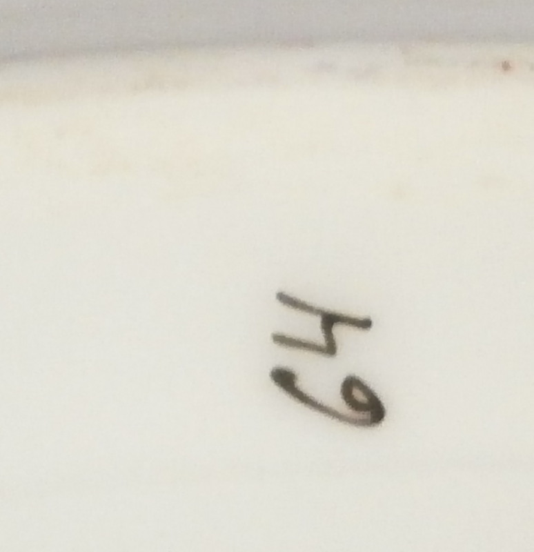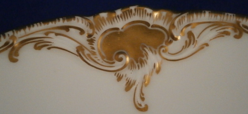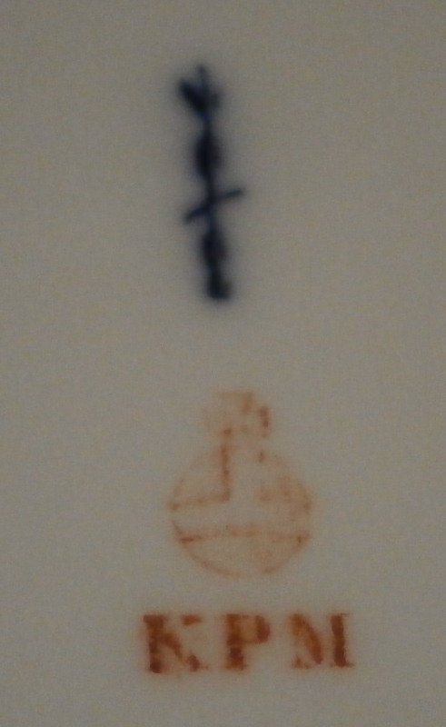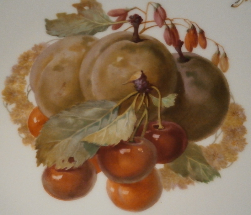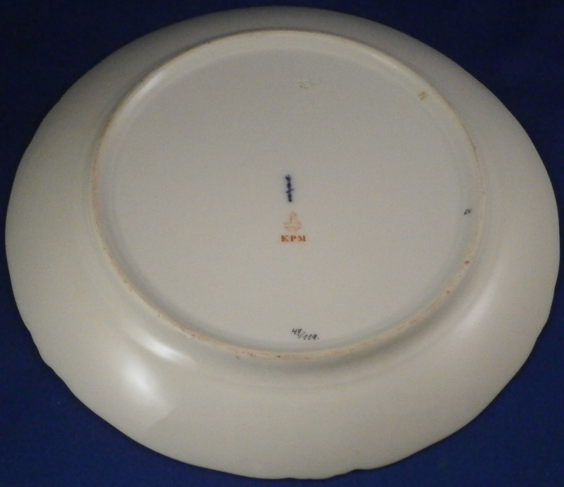 This is a plate made by KPM in about 1920. It is hand painted with a superb fruit still life scene in the center including plums and cherries with their leaves as well as some sort of flowers. The plate is quite elegant and decorative especially with the fancy gold trim on a raised design to the edge which differes a bit from the usual Neuzierat gold trim. More detail and a little less obvious than the normal one. Very nice! The plate is in perfect condition and is 8.75 inches in diameter and 1.125 inches tall. It is marked underneath with the underglaze blue scepter, the red orb mark and various painter's marks as well as the usual impressed marks as shown. Please email me for more information or other pictures.