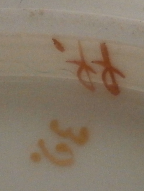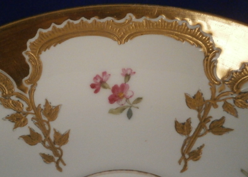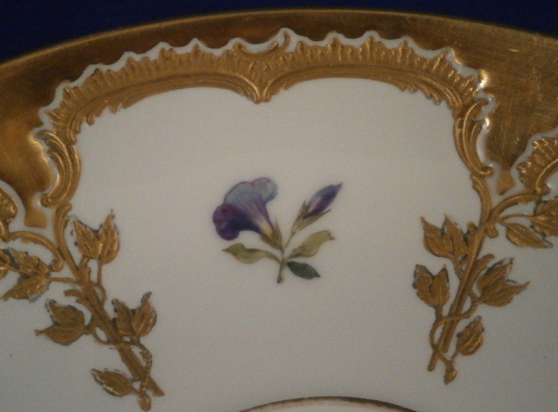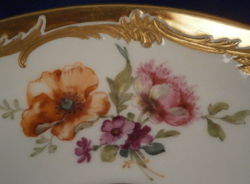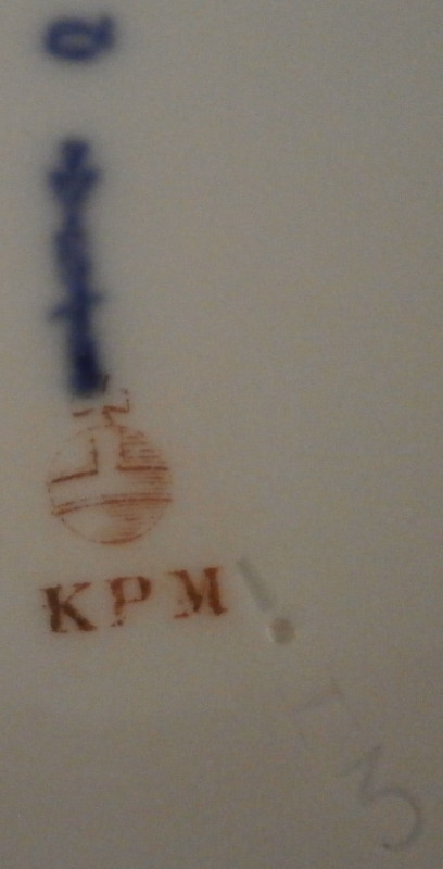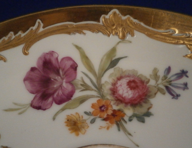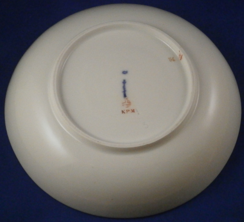 This is a very large saucer made by KPM in the early 20th century. The design is called Neuzierat and this is the rarer version with the spaces between the raised design and the rims filled with a gold ground color. This saucer would ahve been for a large breakfast cup and is very ahrd to find. Could be used as a tea / coffee pot underplate as well. The piece is hand painted superbly with two larger floral arrangements and two small flowers and have a superb raised gold trim in between and is marked underneath with the underglaze blue scepter mark as well as the red orb and various painter's / gilder's and impressed marks as shown. The saucer is in great condition with some very minor wear and the unglazed areas around the gold trim has grayed a bit which is common over time. The saucer is 1.375 inches tall and 7 inches in diameter. Please email me for more information or other pictures.