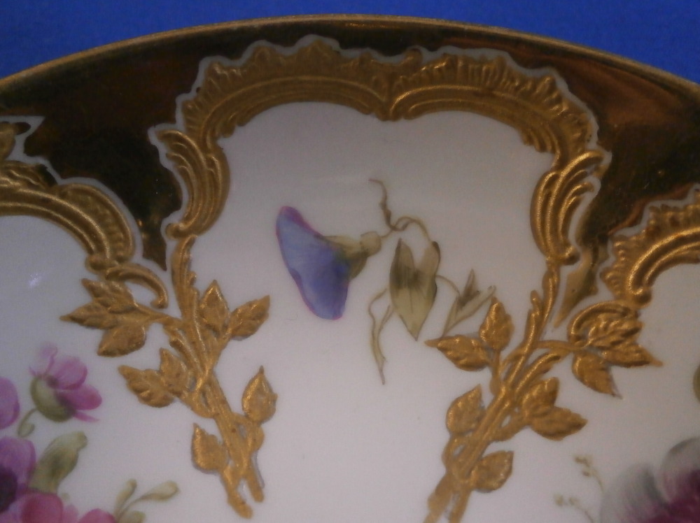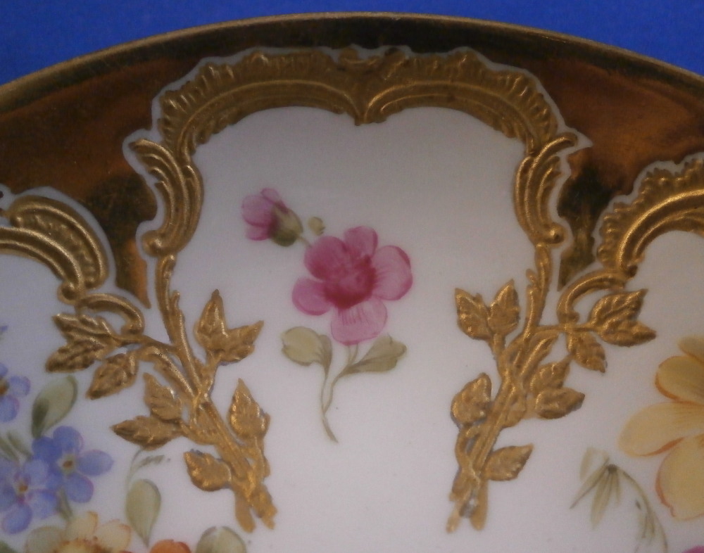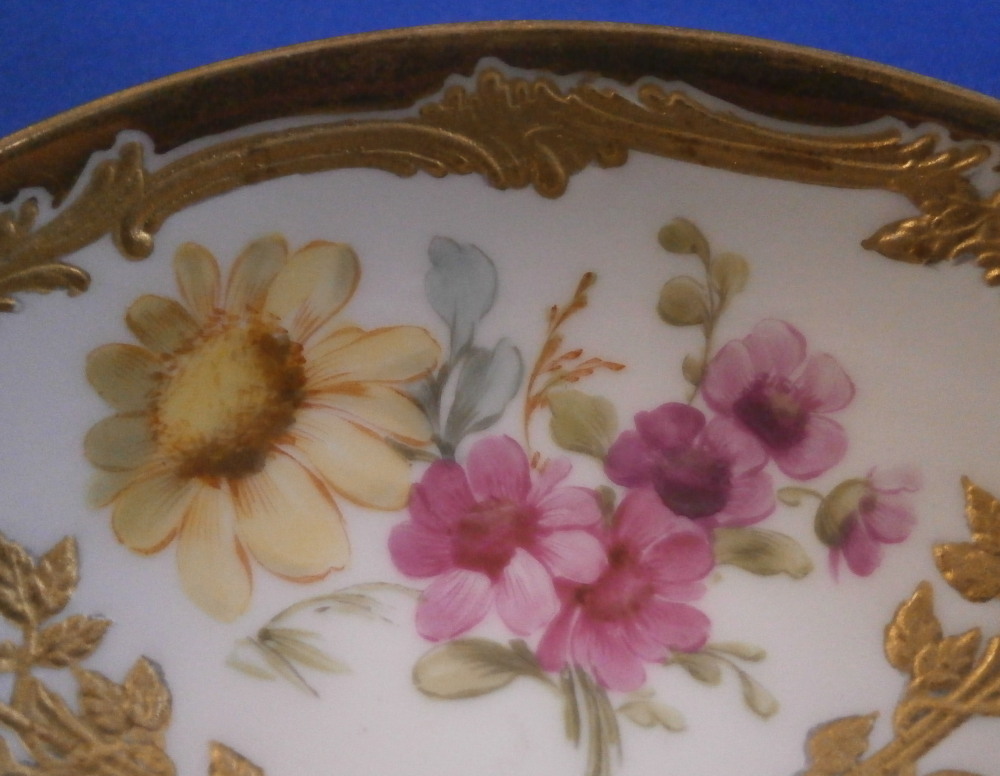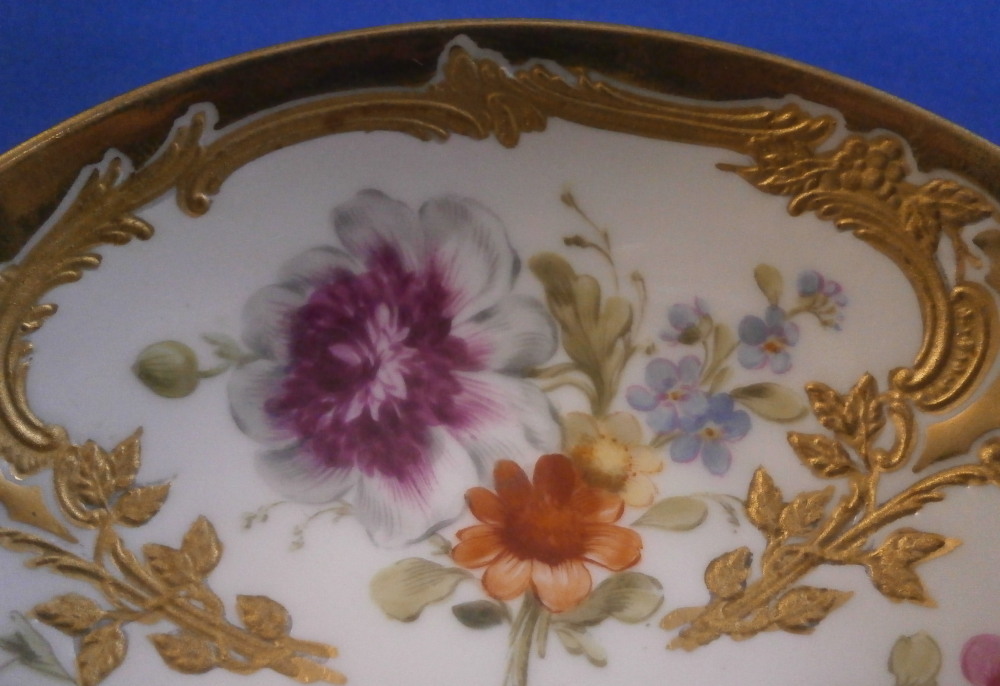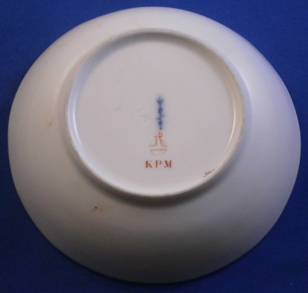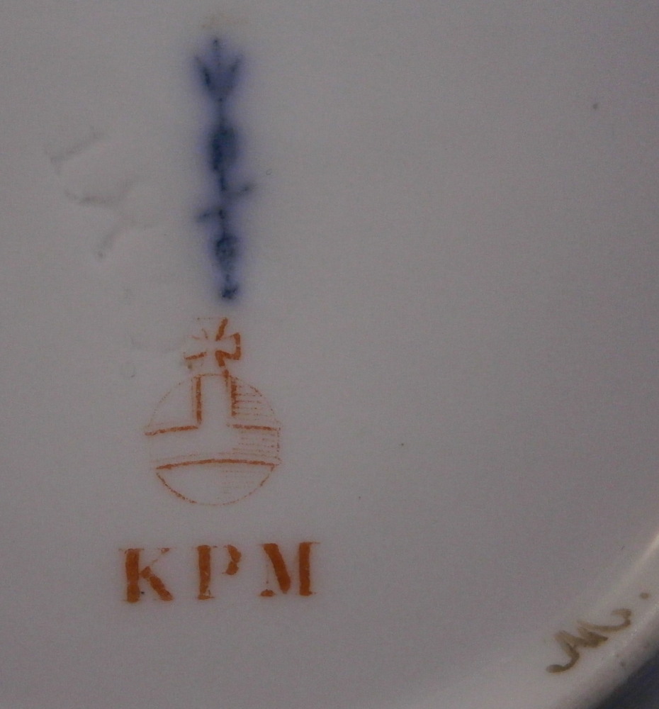 This is a small saucer for a demitasse cup made by KPM in the early 20th century. The design is called Neuzierat and this is the rarer version with the spaces between the raised design and the rims filled with a gold ground color. The piece is hand painted superbly with two large floral arrangements and two small flowers and has a superb raised gold trim in between. It is marked underneath with the under glaze blue scepter mark as well as the red orb and a painter's or gilder's mark plus impressed marks as shown. The saucer is in great condition with some very minor wear. The saucer is 1.125 inches tall and 4.375 inches in diameter. Please email me for more information or other pictures.