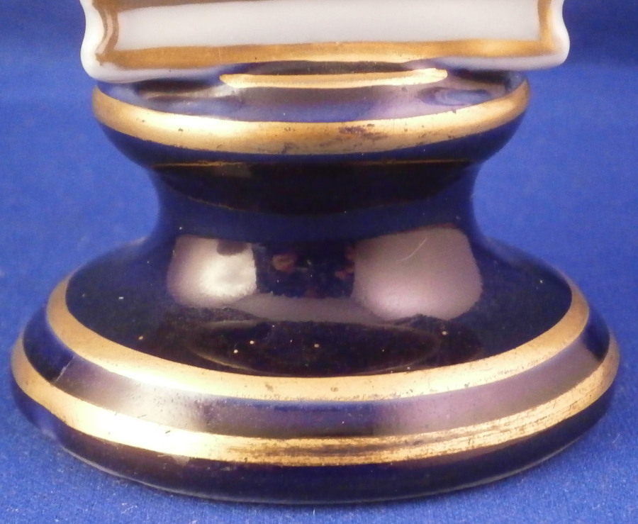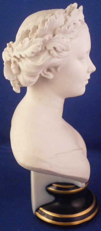 This is a nice figural bust made by KPM around in the mid 19th century between 1847 and 1849. The figure is of a young lady - the crown princess Victoria of Prussia . She was a German Empress and Queen of Prussia as the wife of German Emperor Frederick III . The piece is nicely modeled with a wreath of oak leaves in her hair including the leaves and acorns. Simple top that leaves the shoulders exposed and it is sitting on a cobalt blue base with some ncie gold details. One piece so the base is part of the mold. A very stunning figure! The piece is in great condition with a touch of gold wear and one leaf in the back has a chip to it. It's not obvious and it is in the back so she displays perfectly! The entire piece is 6.875 inches tall, 4.25 inches wide and 2.75 inches deep. It is marked with the under glaze blue penny mark as it is called used one for a very short time during the mid 19th century as well as the red orb mark. Someone put Germany in permanent marker on the underside. A really nice piece! Please email me for more information or other pictures.
