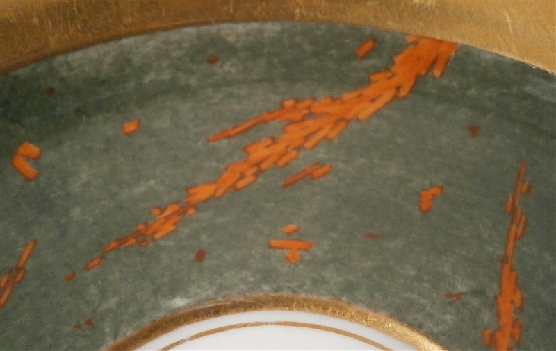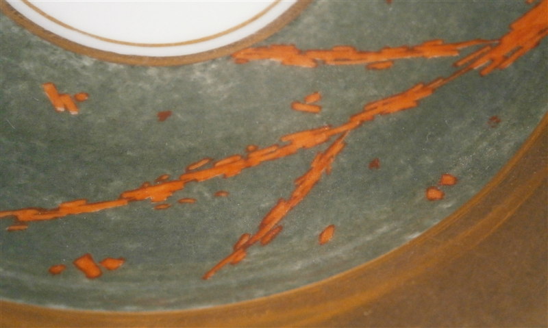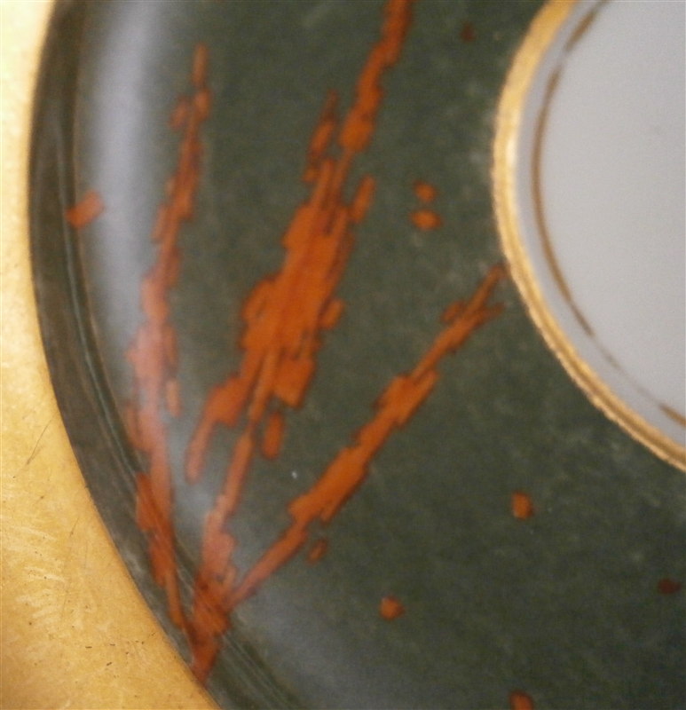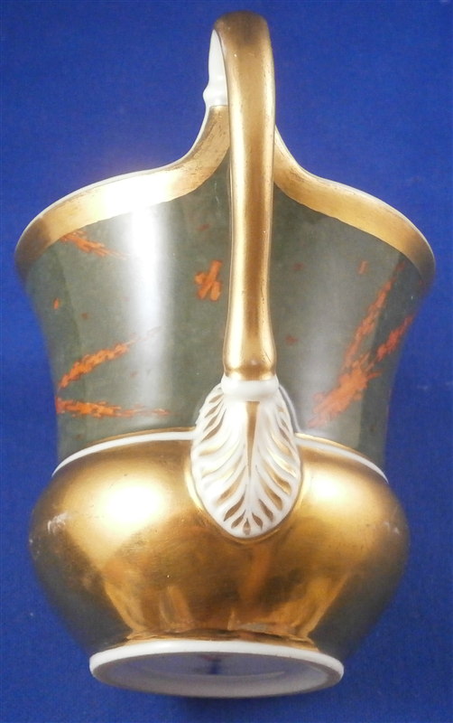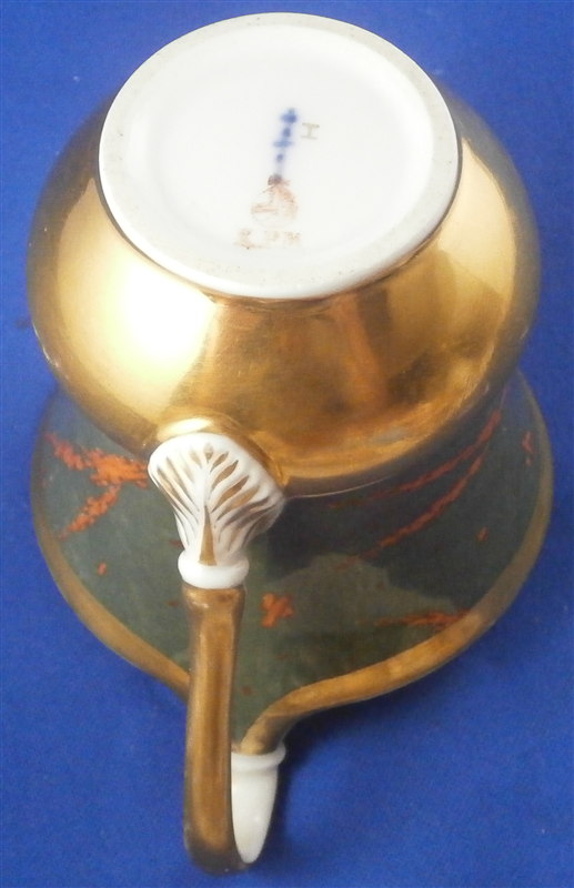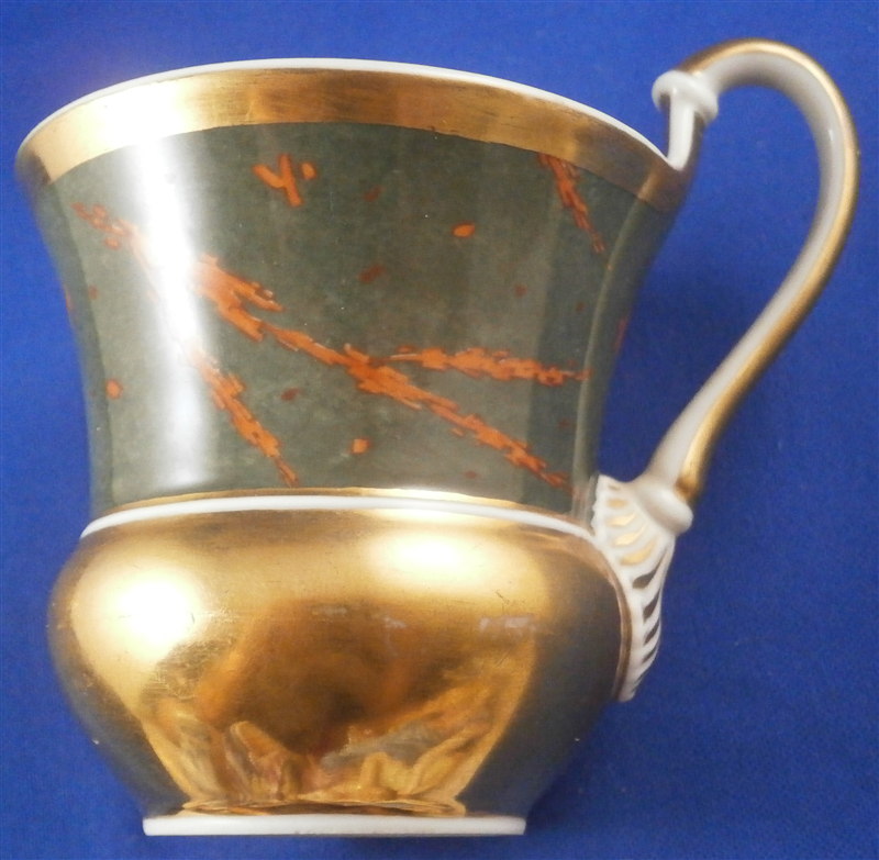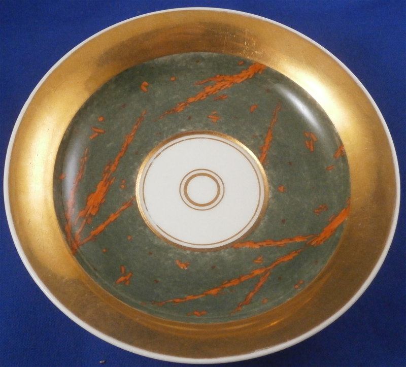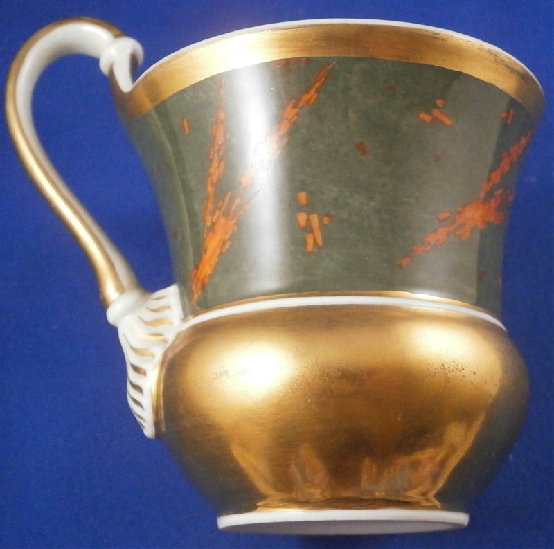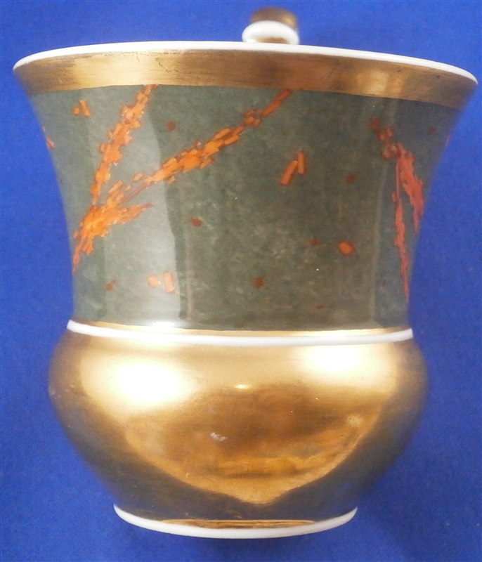 This is a rare cup and saucer made by KPM in the 1830's. It has a design to it that I have never seen before and fits more into the avantgarde /suprematism movement of Russia than into KPM of this period :) The cup has a superb shape typical of this period with a nice handle. Lots of gilding on both pieces - the rim of the saucer, the inside of the cup, its handle and the bottom outside part are all gold. The top outside part as well and the center ring of the saucer have this funky red design on a greenish gray ground color which I first though was silver luster gone black but it is not. The red design is made up of tons of little red rectangular bars scattered thorughout sometimes by themselves and sometimes in long strands. A wild design that is just fun to look at! The set is in great condition with one shallow rim chip to the underside of the saucer as shown. A tiny bit of wear but about as minimal as you can find! Displays perfectly! The cup is 3 inches tall plus the handle which is another 0.75 inches higher and 3 inches in diameter. The saucer is 1.25 inches tall and 5.625 inches in diameter. Both pieces are marked underneath with the underglaze blue scepter mark as well as the red orb mark, a gilt painter's mark and the usual impressed marks. Please email me for more information or other pictures.
