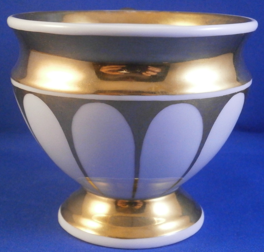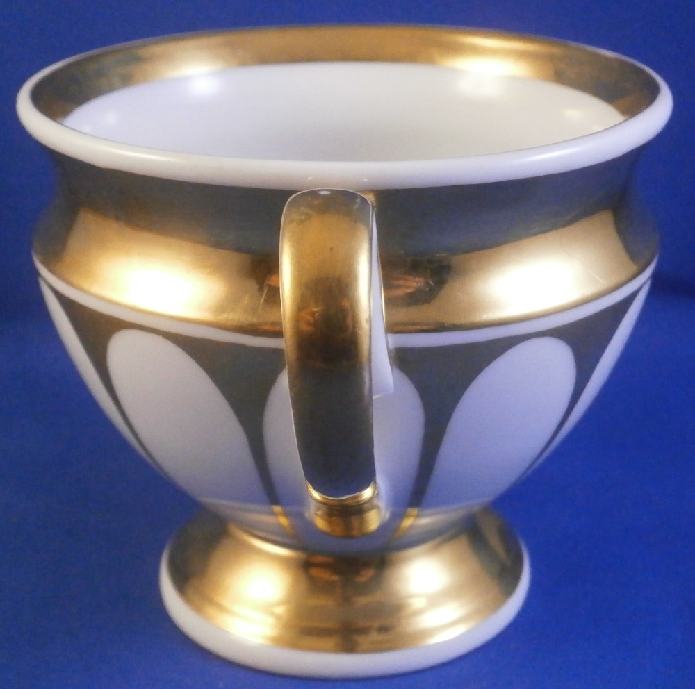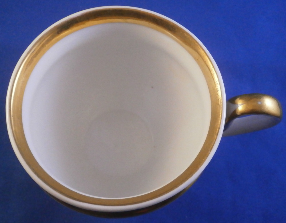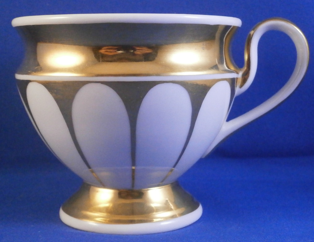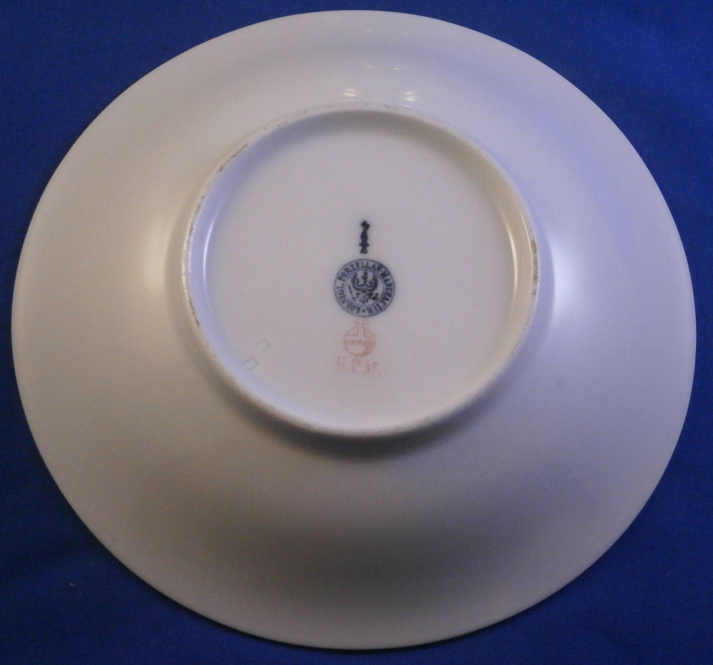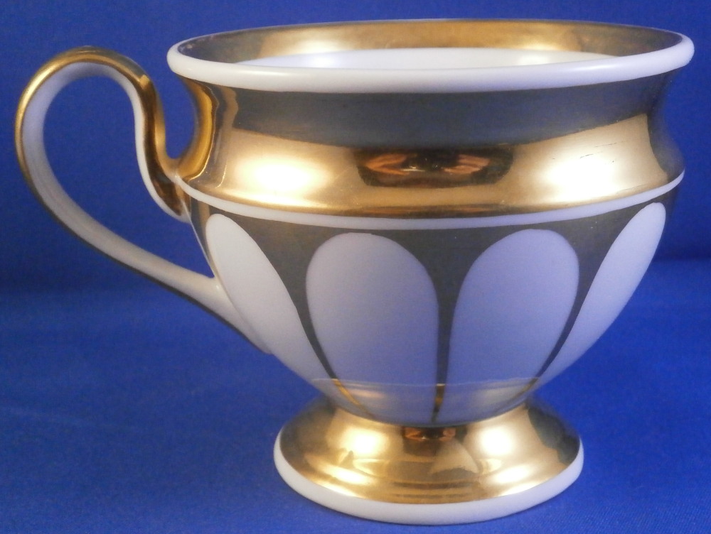 This is a cup and saucer made by KPM in the mid 19th century . The design remind me of the Grecque Athena Service made by Fuerstenberg but here we have an earlier KPM design. The set is decorated with a white and gold design that is quite nice. Sort of like a fan shaped or arch design with the handle in the shape of the earlier swan handles without the detail. The cup is still influenced by the earlier Biedermeier period. A great cup & saucer from its original period. Both pieces are in great condition with just some very minor wear/use marks mainly to the saucer and a tiny white spot to the top of the handle. The set displays perfectly! The saucer is 1.125 inches tall and 6 inches in diameter. The cup is 2.875 inches tall and just over 3.25 inches in diameter at the top. The saucer is marked with the so called penny mark with the scepter above it used during the period of 1849 until 1970 and the cup has just the penny mark used from 1847 until 1849. The combo would date this set right to 1849. Both also have the red orb mark as well as some other marks as shown. I also have quite a few other pieces from this service up for sale on the site. Please email me for more information or other pictures.