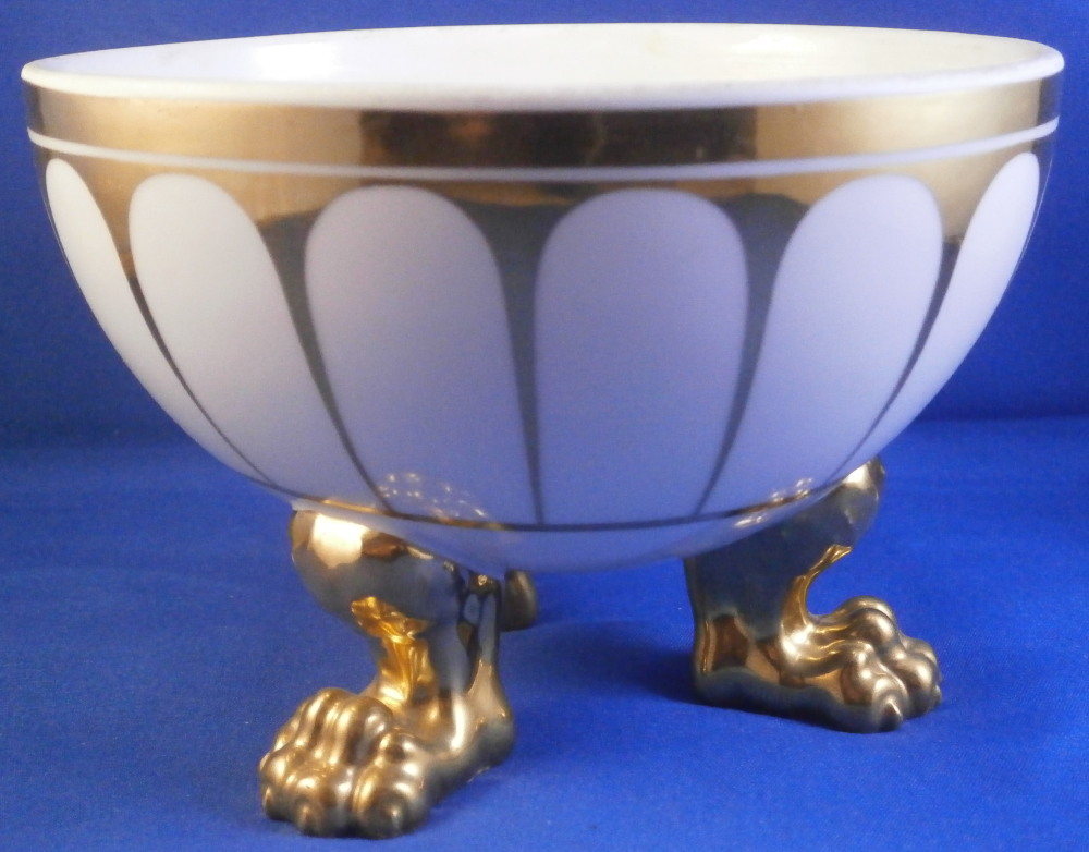 This is a superb lidded box / dish made by KPM in the mid 19th century . The design remind me of the Grecque Athena Service made by Fuerstenberg but here we have an earlier KPM design. The piece is decorated with a white and gold design that is quite nice. Sort of like a fan shaped or arch design. It sits on three very detailed and fully gilded claw feet and has a nicely shaped finial on the lid. A really nice looking piece! It is in great condition with just some very minor wear/use marks nd a small chip to the very edge of the lid as shown that is very ahrd to spot and thus it displays perfectly! The piece is 5.5 inches tall and 5.5 inches in diameter. Marked with the letter KPM under the scepter used from 1837 until 1844 plus the red orb mark as well as some other marks like a gilder's mark as shown. Almost 200 years old and still looks stunning! I also have quite a few other pieces from this service up for sale on the site. Please email me for more information or other pictures.