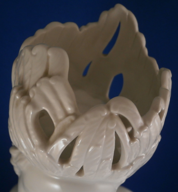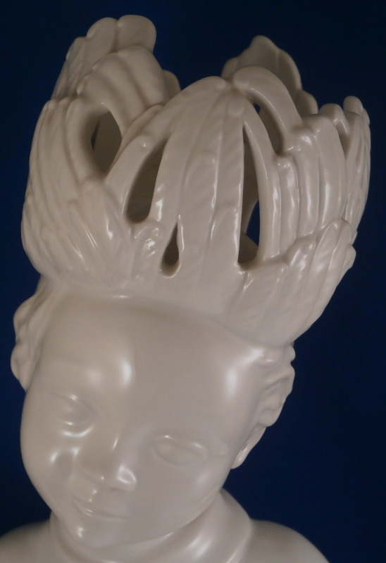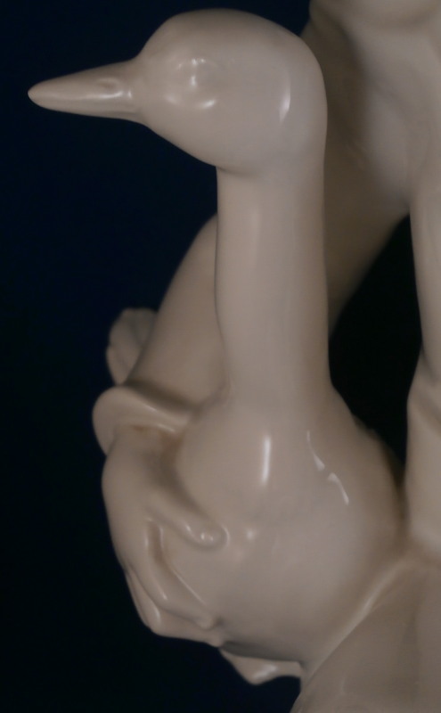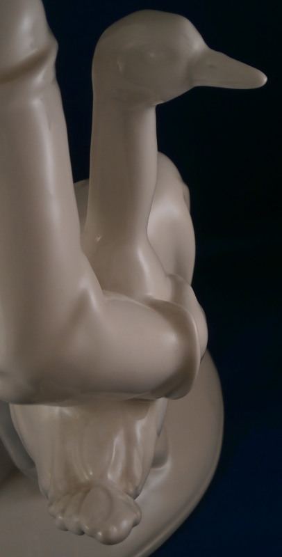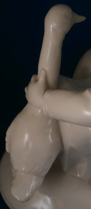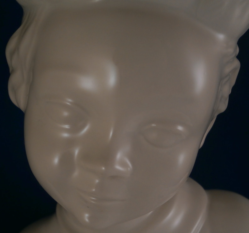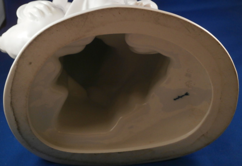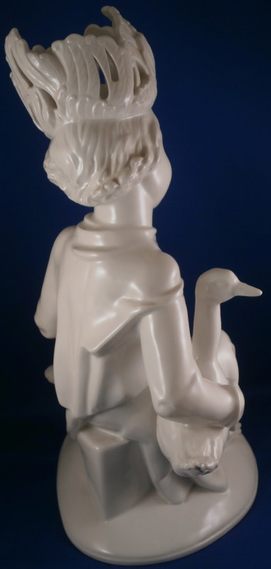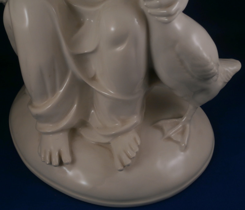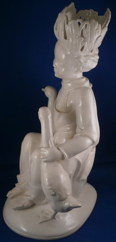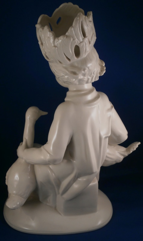 This is a figurine called "Der Gänsekönig" originally designed by Ruth Schaumann made by KPM in the mid 20th century. I do believe this is from a popular children's story about the goose king. The figurine is very large, modeled with lots of detail and left in the white to show it all off. I am not sure this piece even exists in color as I have never seen it. The figure is of a young man sitting on a block wearing a loose robe, wearing a crown made of goose feathers while holding two geese in his hands. One of the geese is standing next to him white the other goose is sitting on the side of his lap. Simple oval base. The figure is in perfect condition. It is about 12.75 inches tall, 8.5 inches wide and 5.875 inches deep. It is marked underneath with the under glaze blue scepter mark as well as the usual impressed marks typical to this period as shown. The back of the block he is sitting on has the initials RS incised into it for the designer of this piece. Please email me for more information or other pictures.
