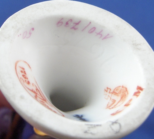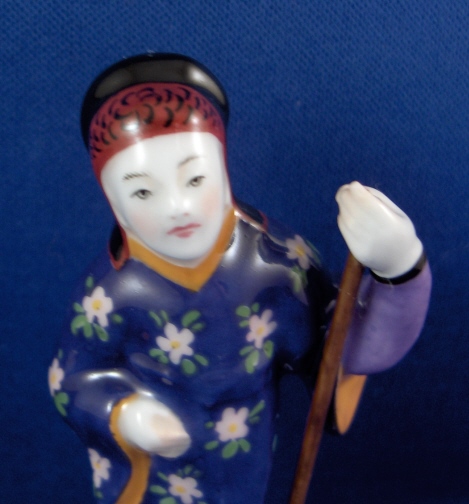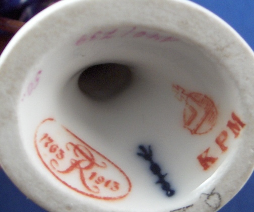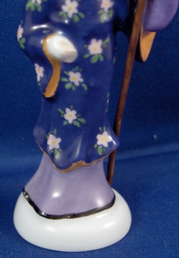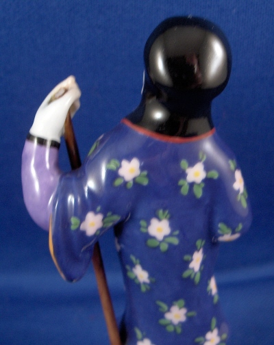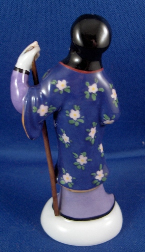 This is a superb figurine made by KPM in 1913. It is of a Geisha - a Japanese woman trained to entertain men with conversation, singing, dancing and so on. She is superbly modeled and painted in the Art Nouveau or Jugendstil style of the period. The figurine is in great condition with the tip of her staff broken off. The figure is about 3.75 inches tall, 1.625 inches wide and 1.25 inches deep. The figure is marked underneath with the underglaze blue scepter, the red orb, the 150 year anniversary mark, as well as impressed and painted numbers, etc. as shown in the picutres. Please email me for more information or other pictures.