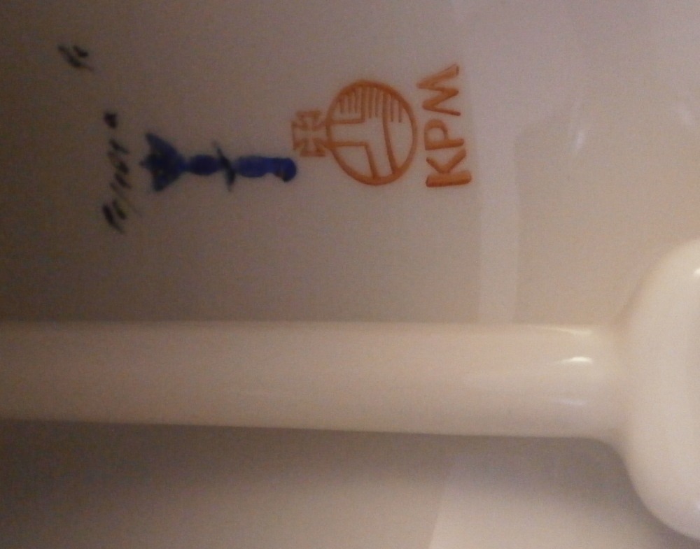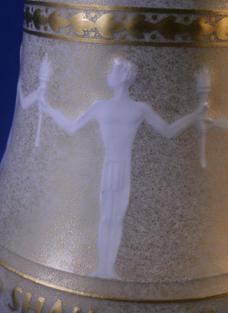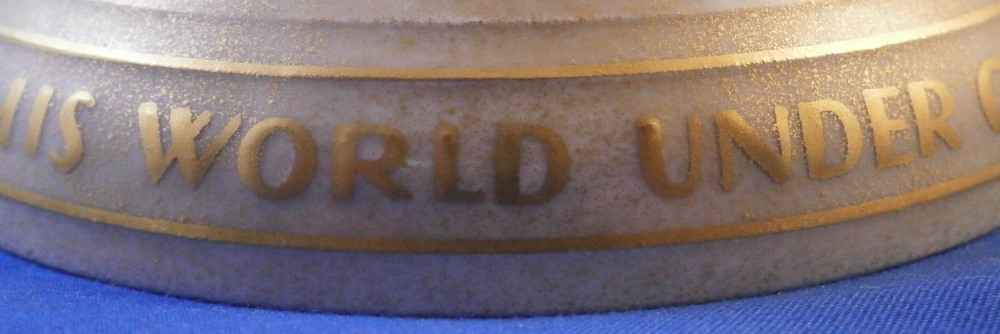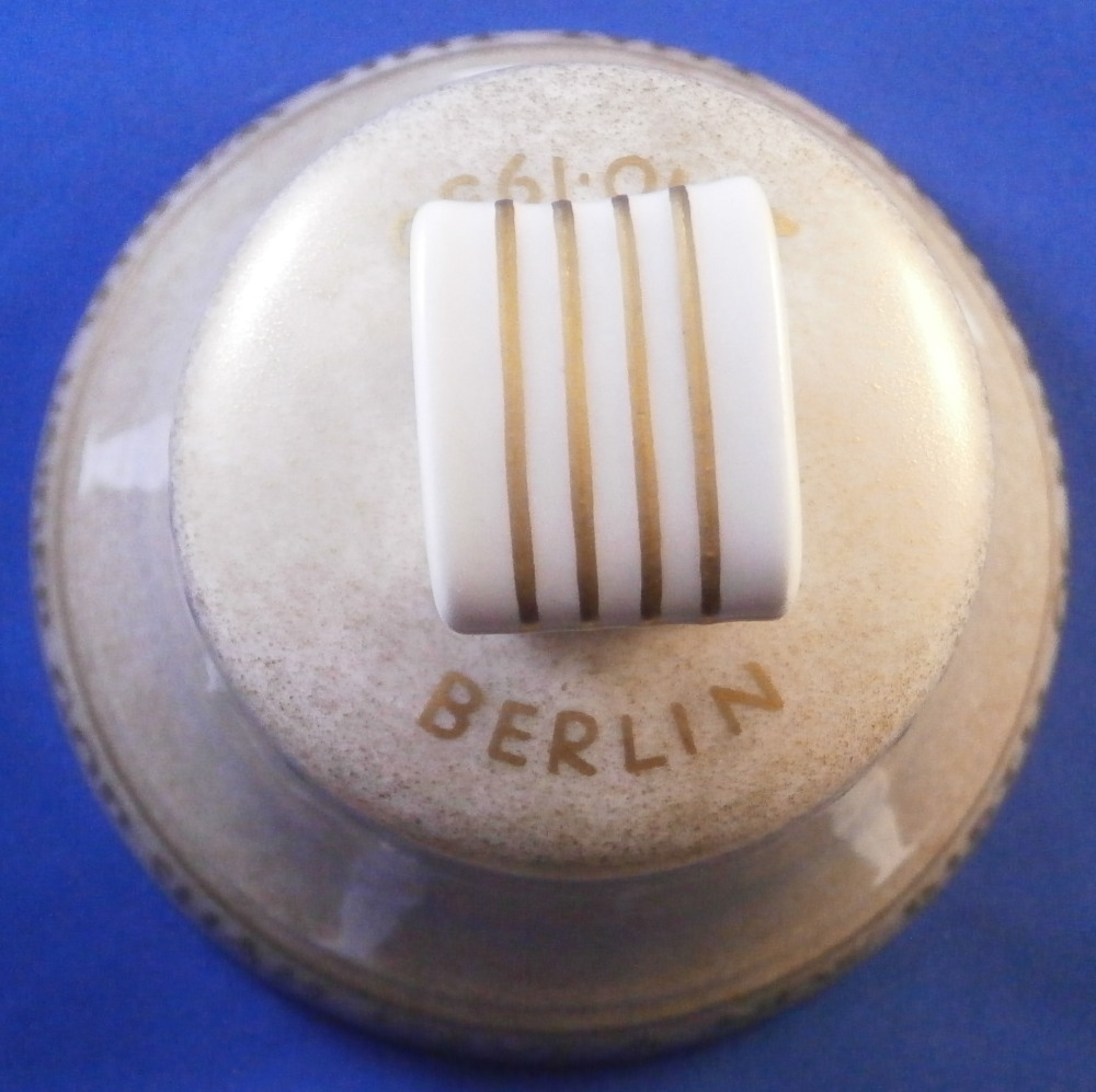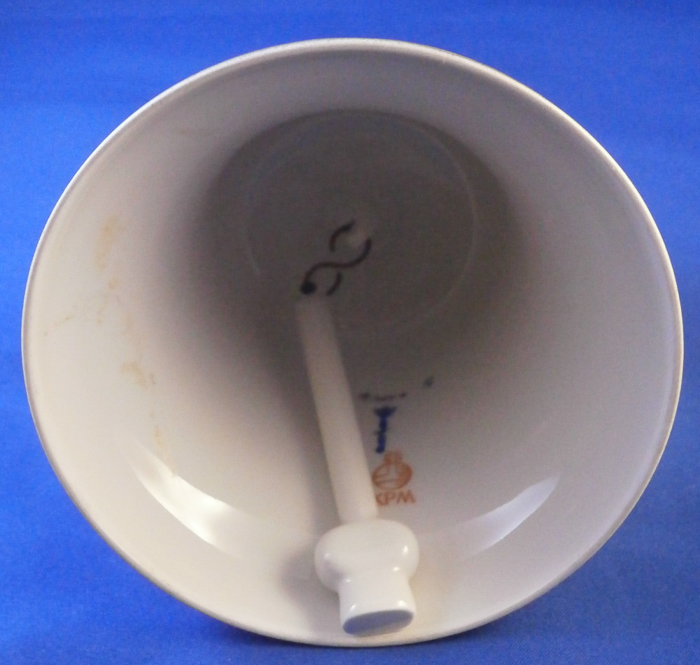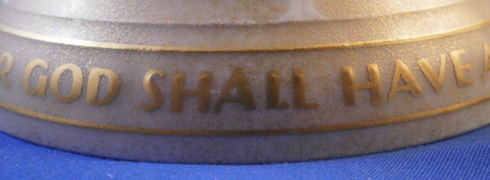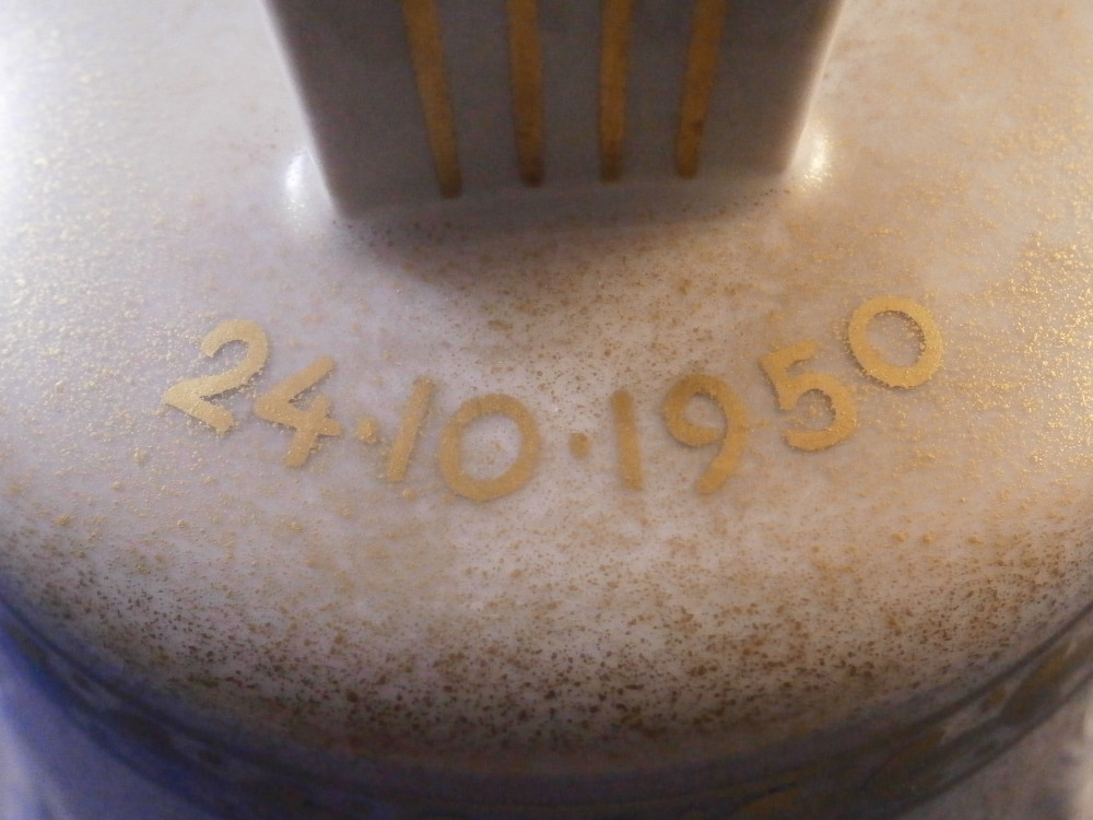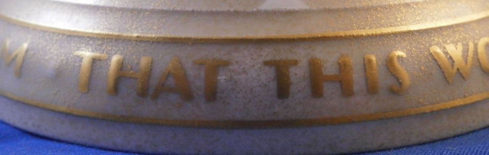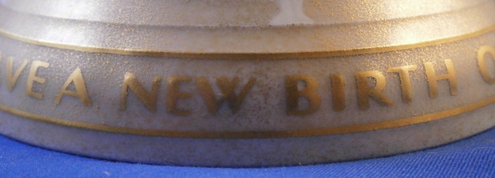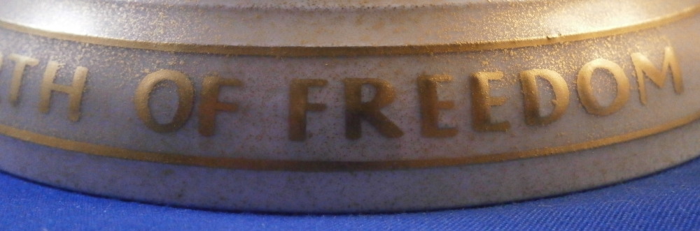 This is a bell ( called the freedom or Freiheits Glocke ) hand painted in gold and made by KPM and dated October 24, 1950 ( for the rebuilding after WWII). It is hand painted on a relief designs of people holding torches in a circle all around the piece as well as a leaf design and the saying on the bottom rim: That This World Under God Shall Have A New Birth Of Freedom. A very fitting saying even today. Top is written Berlin 24-10-1950. The bell is in perfect condition as shown. Marked inside with the under glaze blue scepter mark as well as the over glaze red KPM orb mark showing it was painted by KPM. Also some numbers in black as shown. The bell is 4.5 inches tall and 4 inches in diameter. Please email me for more information or other pictures.