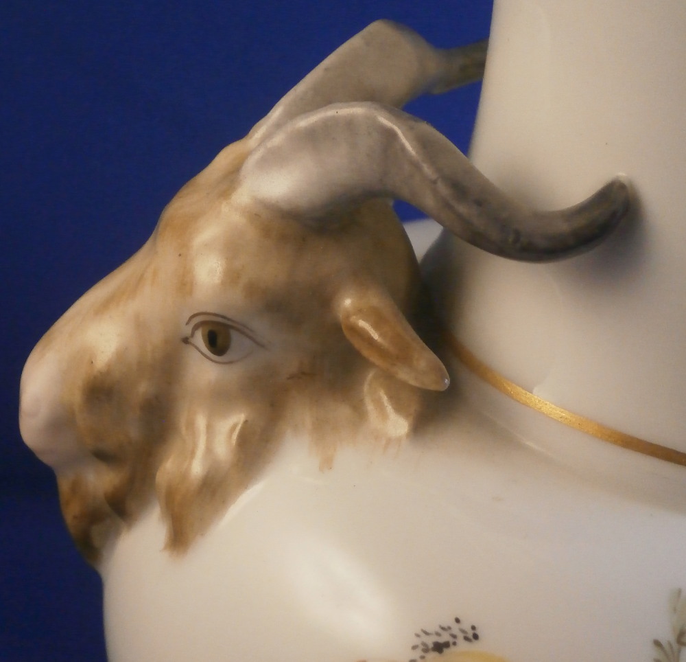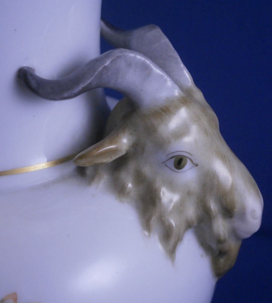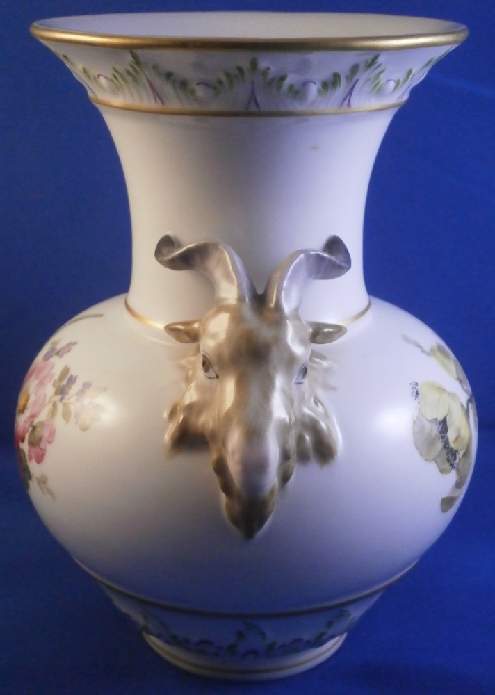This is a fun vase made by KPM in the early 20th century. It has a really fun shape to it and is hand painted with two very nice floral arrangements as well as a nice puce and green trim on a raised design to the top rim and bottom rim, a bit of gold trim and off coure my favorite part - two amazingly detailed goat / ram heads on either side acting as handles. These are hand painted superbly and this is the nicest version of them that they made I think. The vase is in perfect condition and is marked underneath with the under glaze blue scepter mark, the red orb as well as various painter's marks / gilder's mark and numbers and impressed marks normal to this period. The vase is 6.625 inches tall and 4.75 inches in diameter with the handles sticking out a bit from that. This shape is nice and stable so it is perfect for using with cut flowers from your garden or the store! Please email me for more information or other pictures.