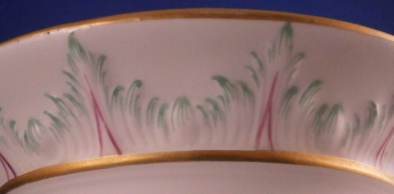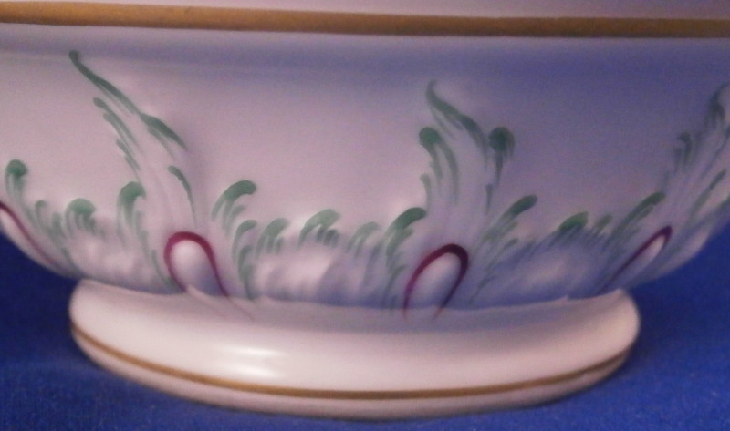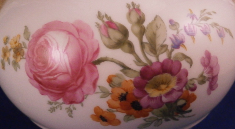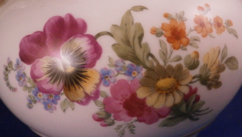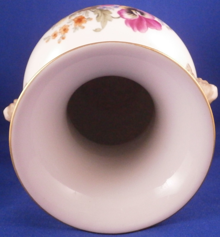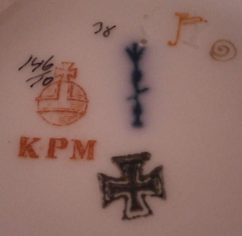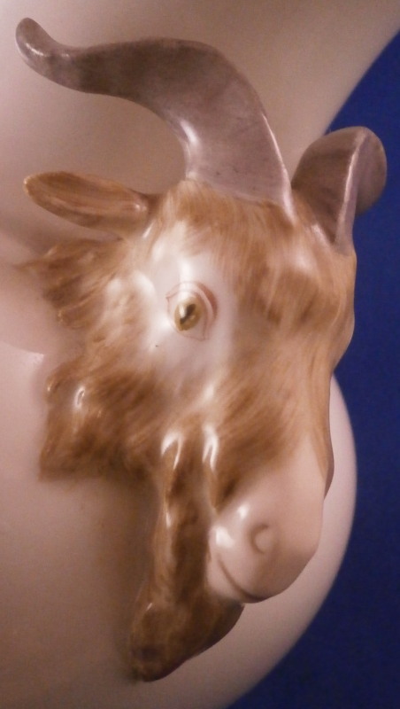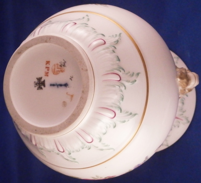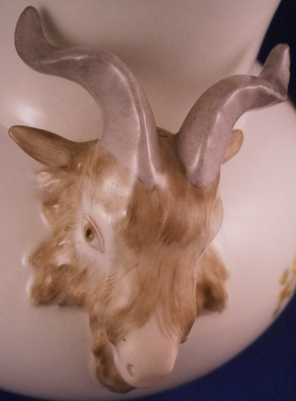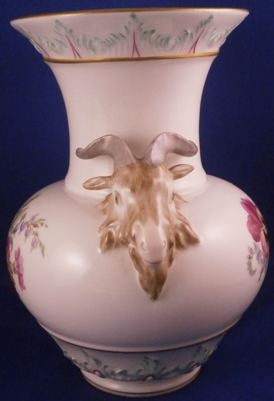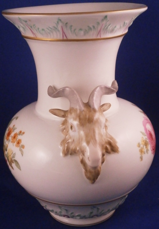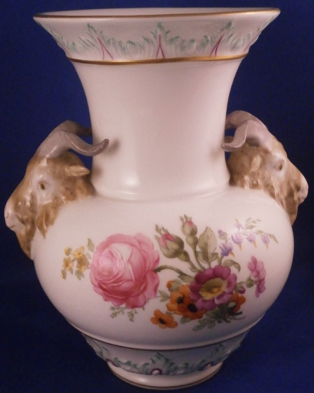 This is a vase made by KPM in the early 20th century during World War I . It is hand painted with two very nice floral arrangements as well as a nice puce and green trim on a raised design to the top rim and bottom rim, a bit of gold trim and off coure my favorite part - two amazingly detailed goat / ram heads on either side acting as handles. These are hand painted superbly and this is the nicest version of them that they made I think. The vase is in perfect condition and is marked underneath with the under glaze blue scepter mark, the red orb, the black iron cross mark from WWI as well as various black painter's marks, a gilder's mark and numbers and impressed marks normal to this period. The vase is 6.625 inches tall and 4.75 inches in diameter with the handles sticking out a bit from that. Please email me for more information or other pictures.