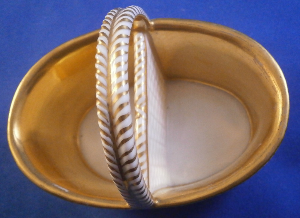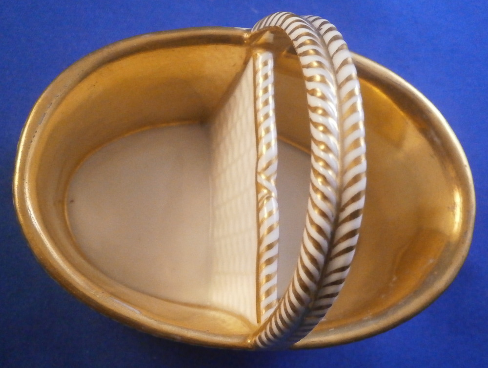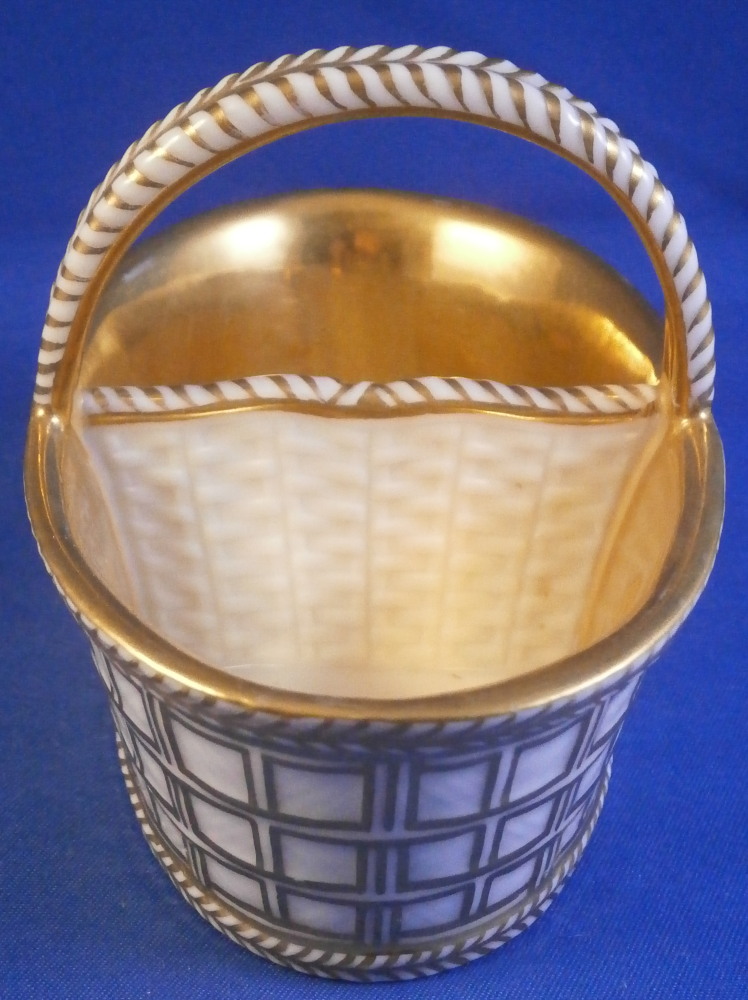 This is a second cute little basket likely meant to be an open salt or spice dish made by KPM in the mid 19th century between 1837 and 1844. The piece has a superb design to it with lots of molded relief detail. It has a divider in the center and a nice handle over that. Lots of gold highlights and the inside wall is fully gilded as well. A great looking and unusual piece! The piece is in great condition with a couple of hard to see spots of gold wear to the inner lip. It displays perfectly! The piece is 2.625 inches tall at the handle, 3.625 inches wide and 2.5 inches deep. Marked underneath with the rare KPM under the scepter mark only used for a few years. It also has the red orb mark as well as a gilder's mark and an impressed mark. A truly fun little piece! I have another one up for sale if anyone is interested in a rare pair! Please email me for more information or other pictures.