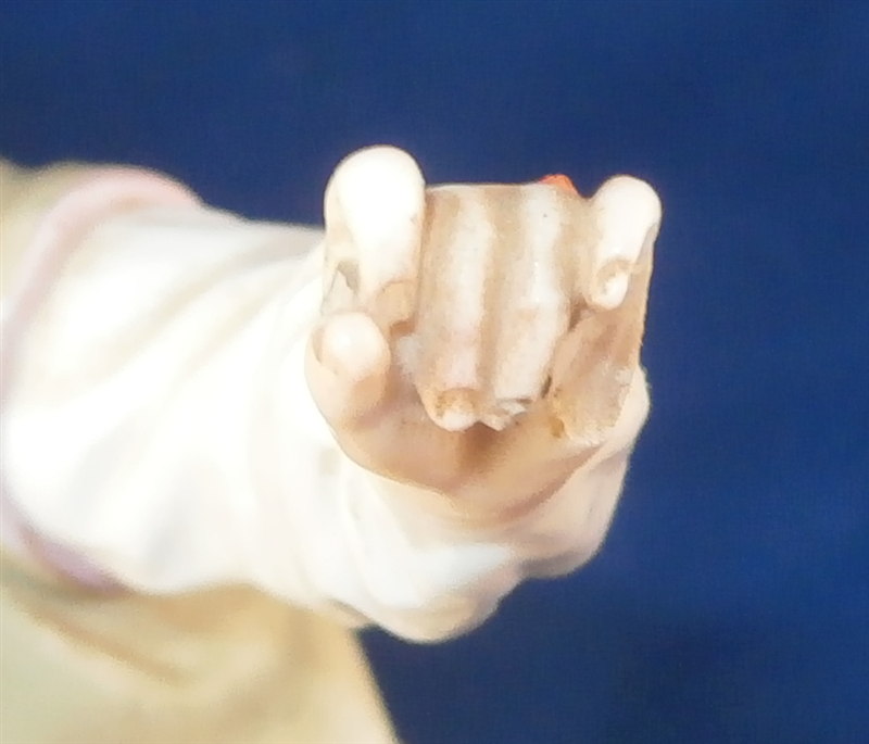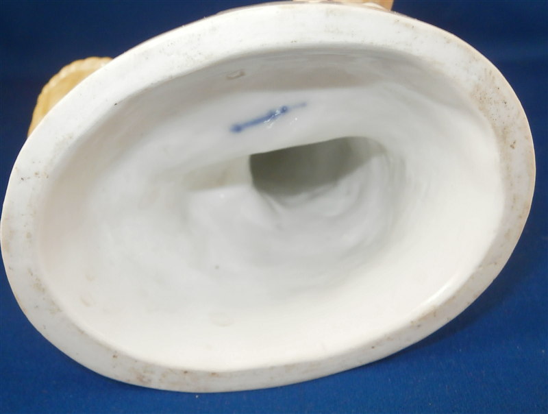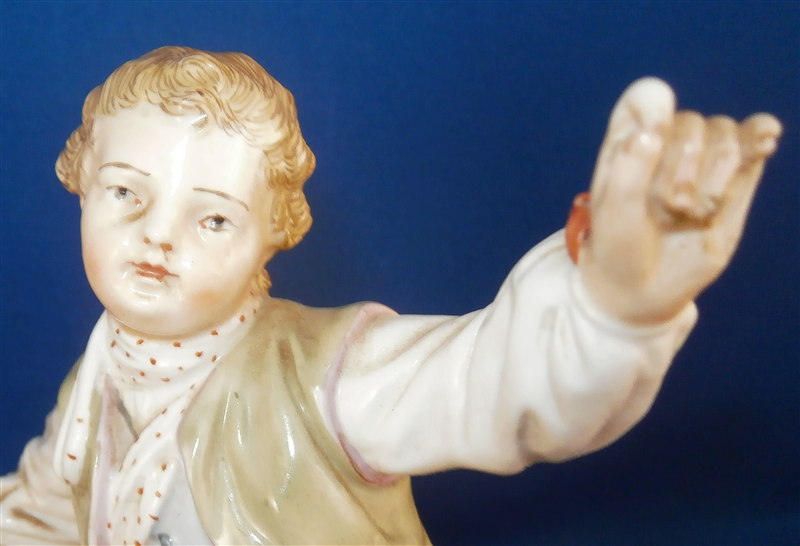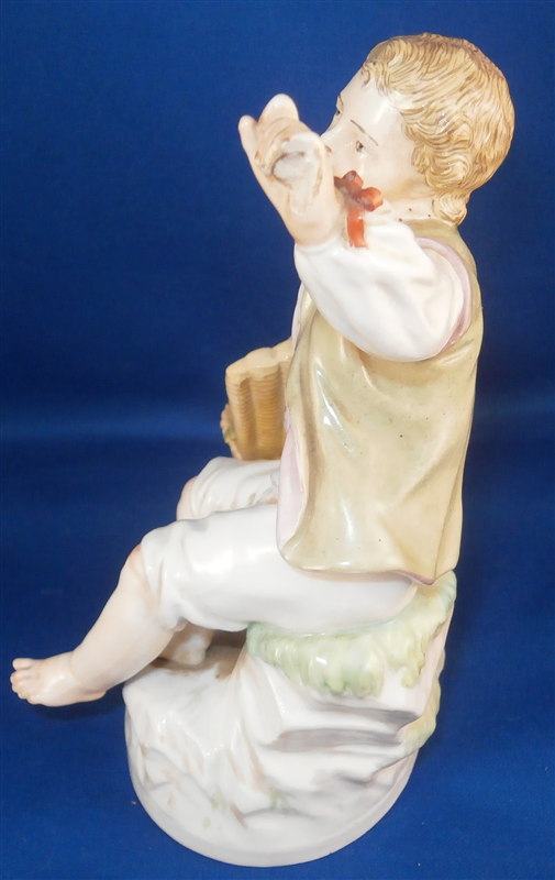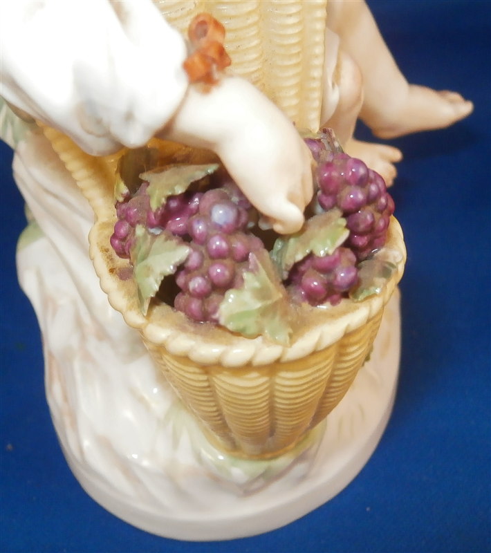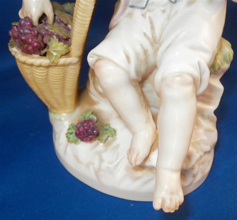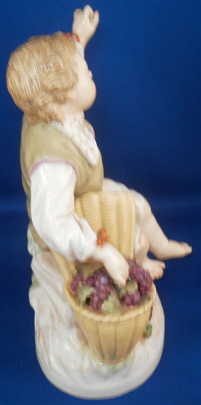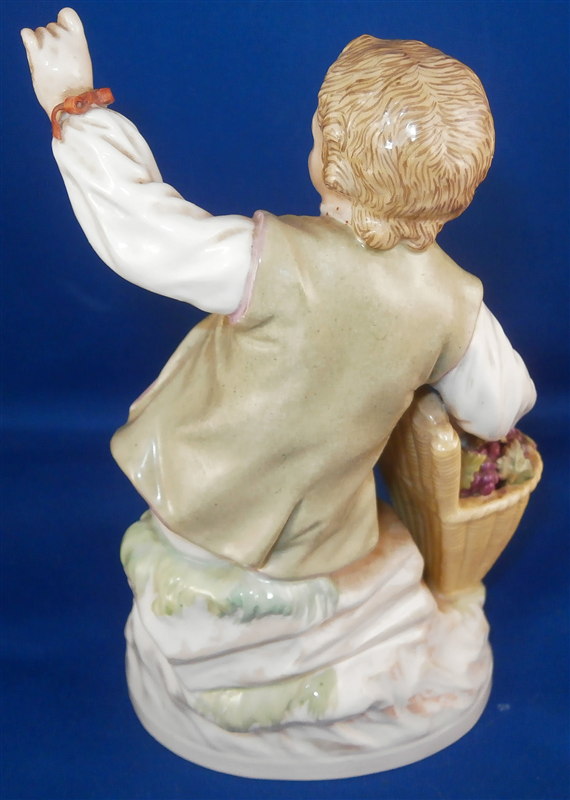This is a nice figurine made by KPM around in the early 19th century. KPM used no painters mark like the red orb yet during this period thus you only have the blue scepter and impressed marks most of the time.The figurine is of a young man or boy with a basket of grapes next to him presumably resting after a long day of picking grapes. It is a very nicely modeled piece handpainted to perfection. The piece is in great condition with the left hand having a little damage to it - I am assuming it held grapes as well but they are now missing and a little bit of the side of his pinky along with it. One tiny end of one bow is missing as well as one grape leaf being damaged in the basket but he displays superbly and really is in great shape! The figurine is 5.75 inches tall, 3.5 inches wide and 3.25 inches deep. It is marked with the underglaze blue scepter mark underneath as shown with an impressed letter D. Please email me for more information or other pictures.