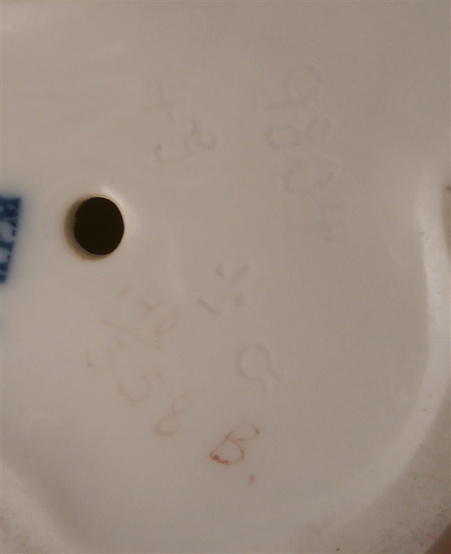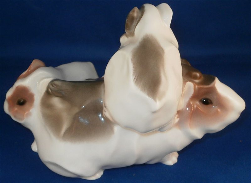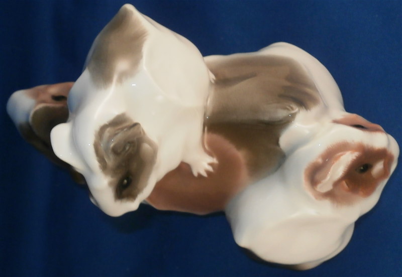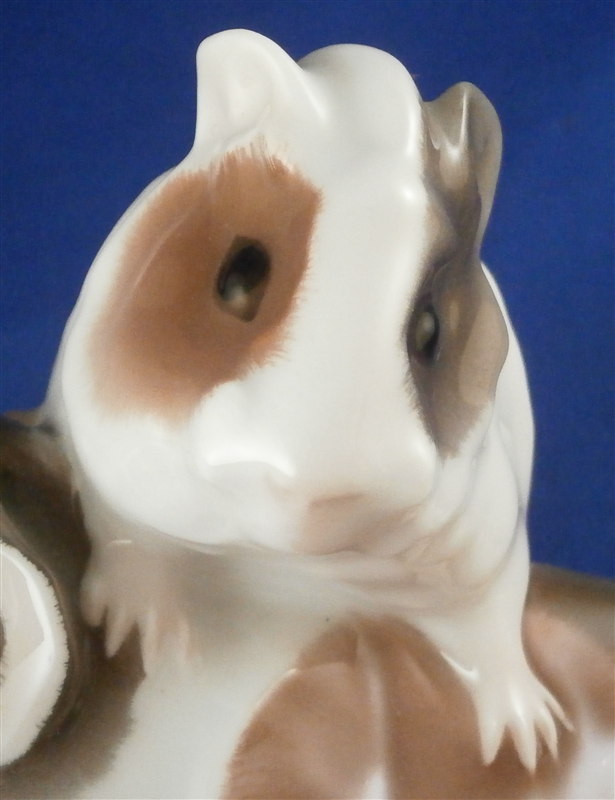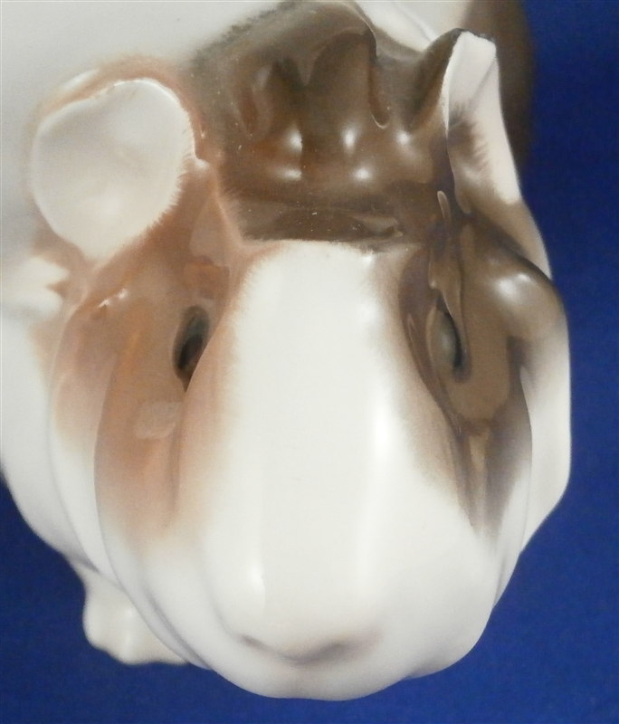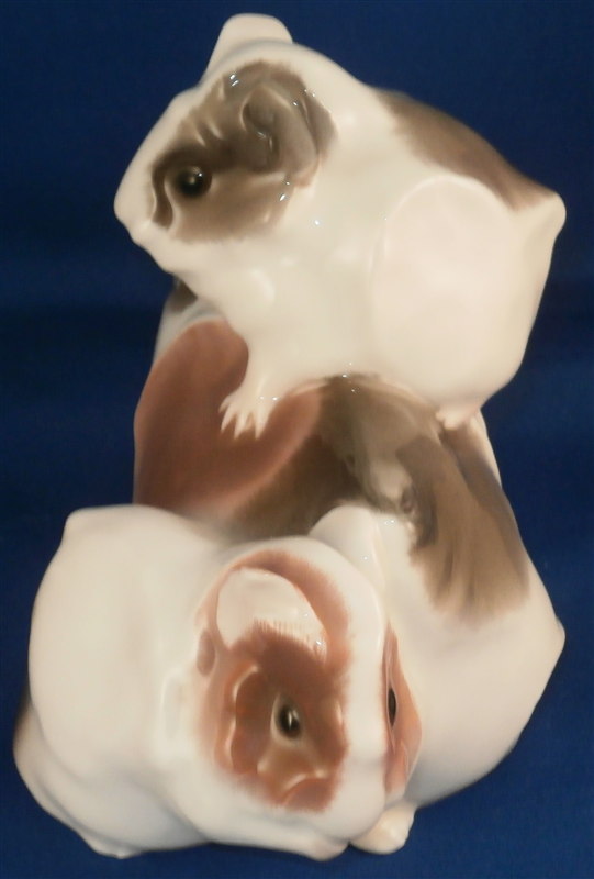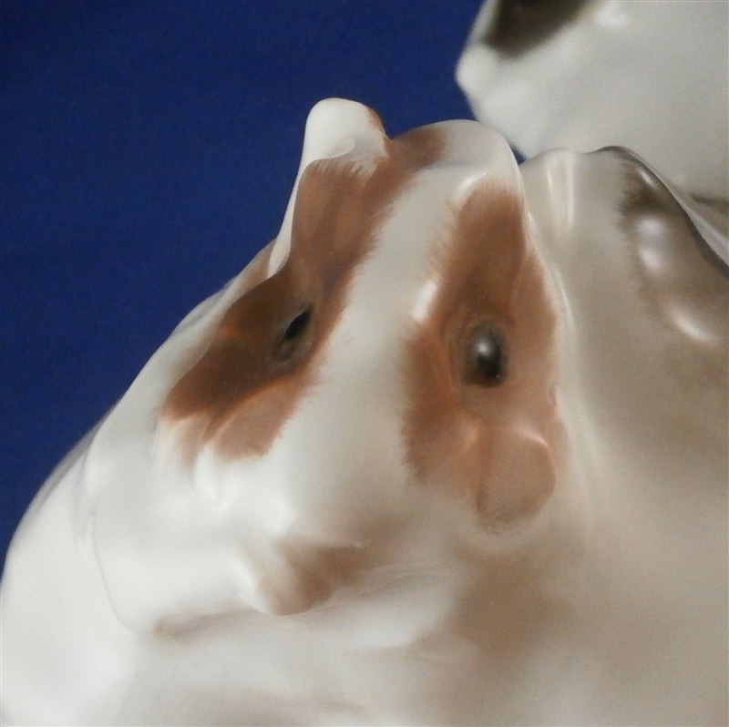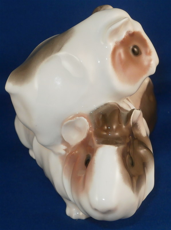 This is a superb angora guinea pig figurine made by KPM in the early 20th century during the Art Nouveau period when they were first designed by Wilhelm Carl Robra whose intitials are faintly impressed between the front paws of the adult! This rare figurine is super cute with the mom or dad being played on by two little ones. Superbly modeled and colored with underglaze brown tones this is one great piece to have in your collection! The underglaze colors are pretty unique to this period for KPM. The piece is in perfect condition. The figure is 4 inches tall, 3.5 inches wide and 6 inches long. The figure is marked underneath with the underglaze blue scepter and orb as well as 140/558 and B. in pink and the usual impressed marks as shown. Please email me for more information or other pictures.