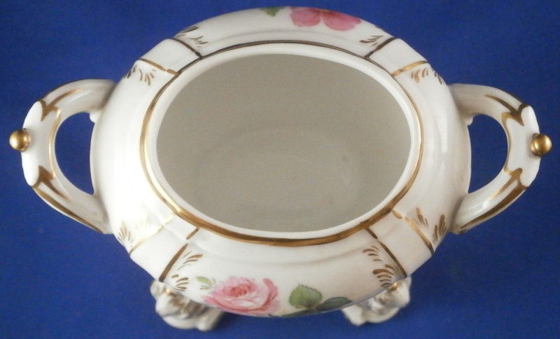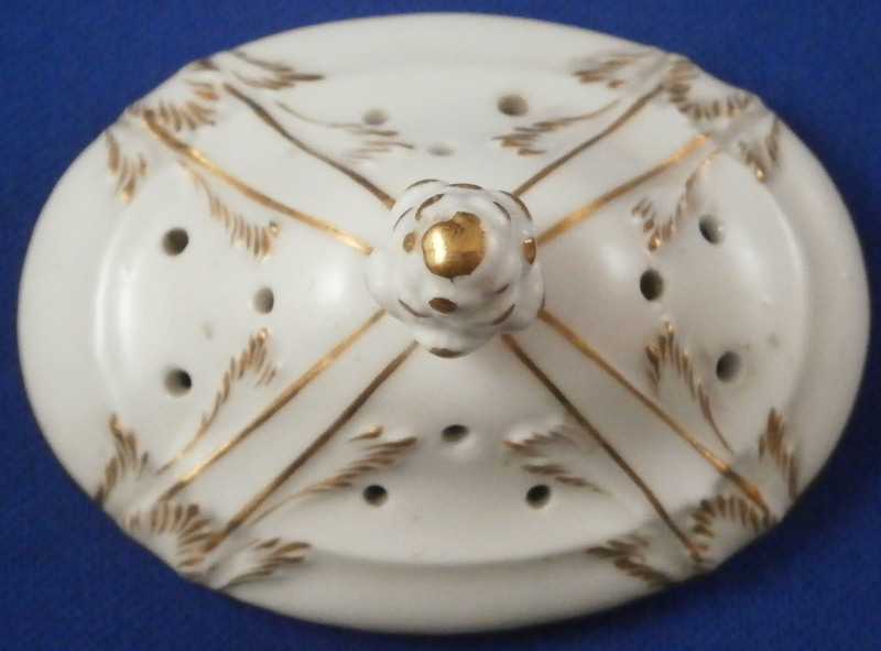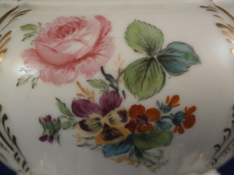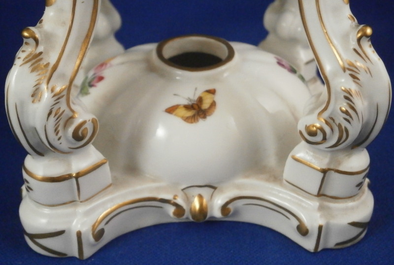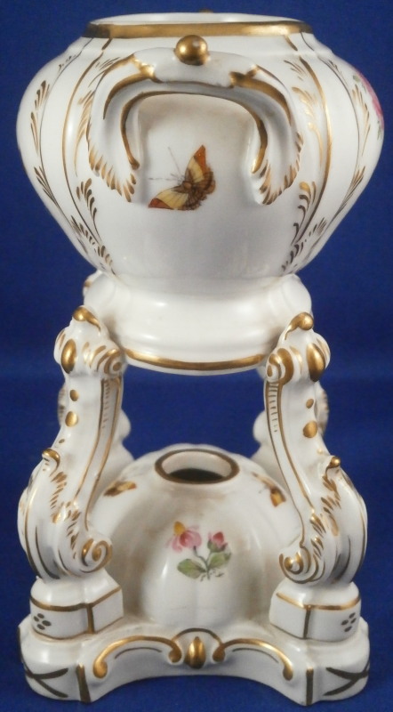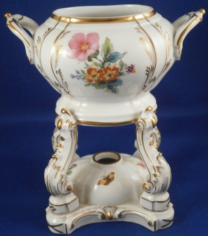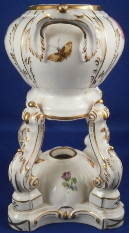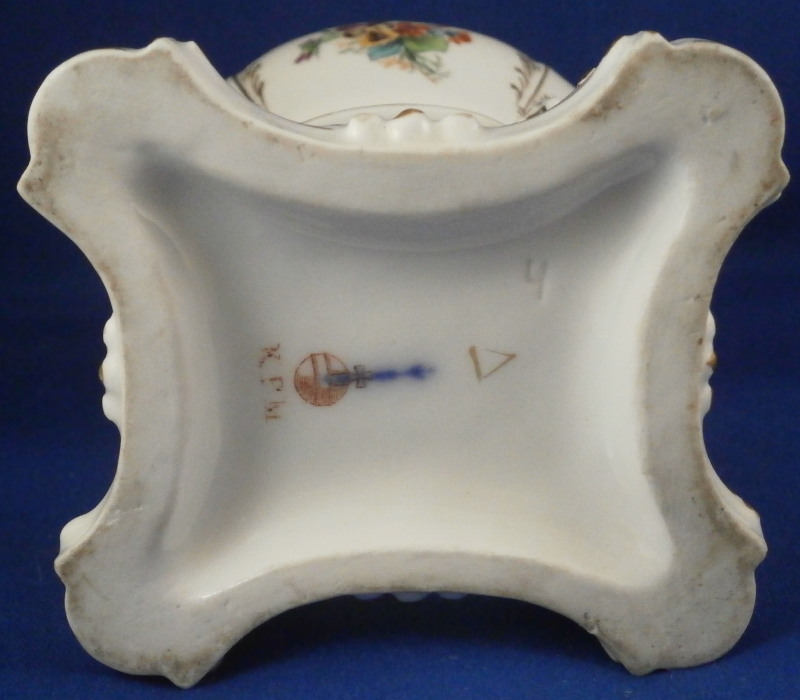 This is a rare lidded potpourri dish made by KPM Berlin in the very late 19th century. Rare because one does not find these painted by KPM - almost all are painted outside the factory and not by KPM plus it still has its original lid. The main part is hand painted with two floral arrangements - one to the front and one to the back, a butterfly underneath the handles with two more butterflies and single flowers to the bottom part that would hold the fuel. The rest of the piece has lots of gilding all over. The lid also has some nice gilding to it. It has holes in it for the smell to come out of when in use. Both pieces are in superb condition - no issues. The entire piece is 6.25 inches tall and 4.5 inches wide and 2.875 inches deep. The dish is marked underneath with the under glaze blue scepter mark, the red orb, a painter's or gilder's mark as well as an impressed 4 or h. Please email me for more information or photos.