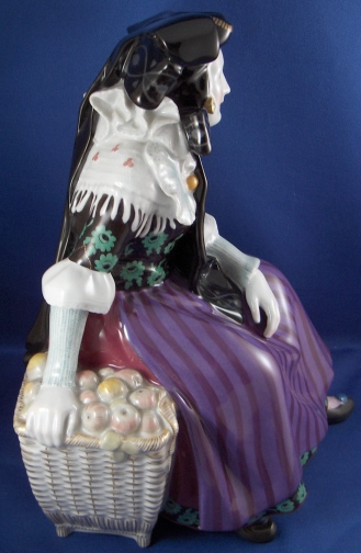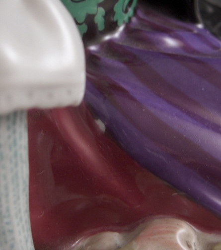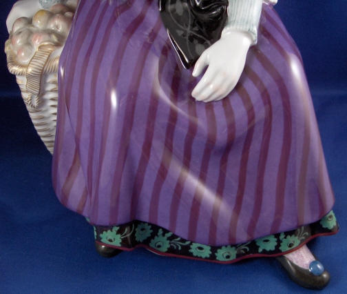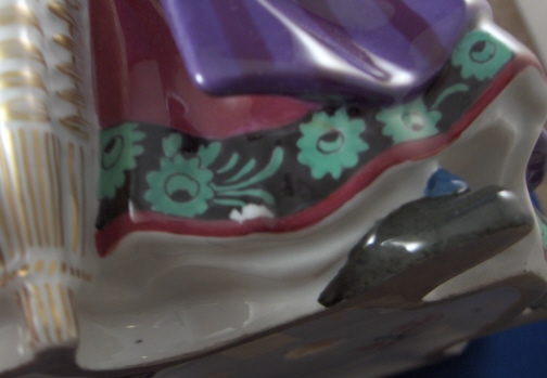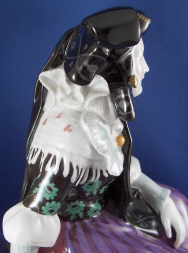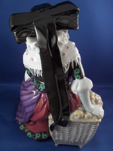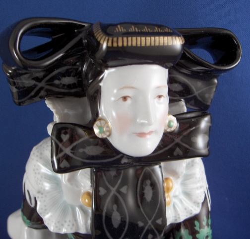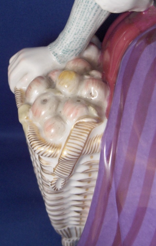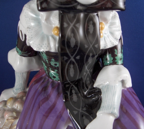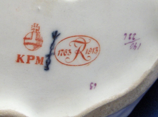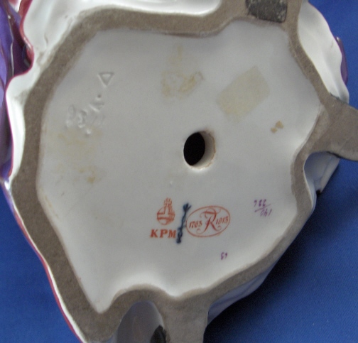 This is a superb figurine made by KPM in 1913. She is superbly modelled and painted in the Art Nouveau or Jugendstil style of the period. She was designed by Karl Himmelstoss who is quite famous and designed pieces for KPM, Rosenthal, etc. She is in great condition with three small spots where the color has flaked off. None are distracting and they could easily be fixed if need really be. The figure is about 10.25 inches tall, 6 inches wide and 7.5 inches deep. The figure is marked underneath with the underglaze blue scepter, the red orb, the 150 year anniversary mark, painters marks as well as impressed numbers, etc. as shown in the picutres. Please email me for more information or other pictures.
