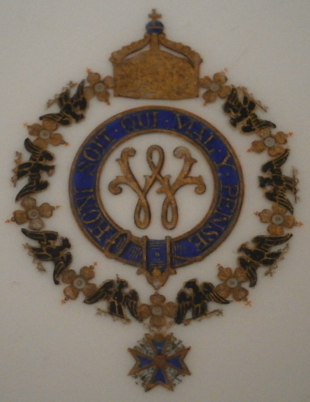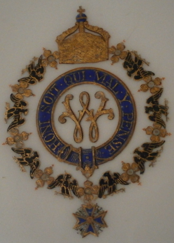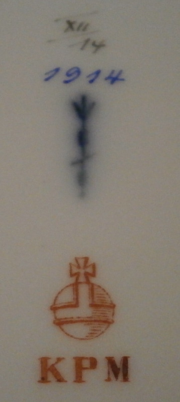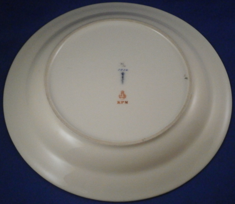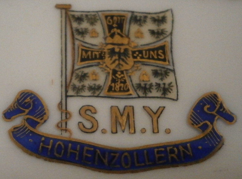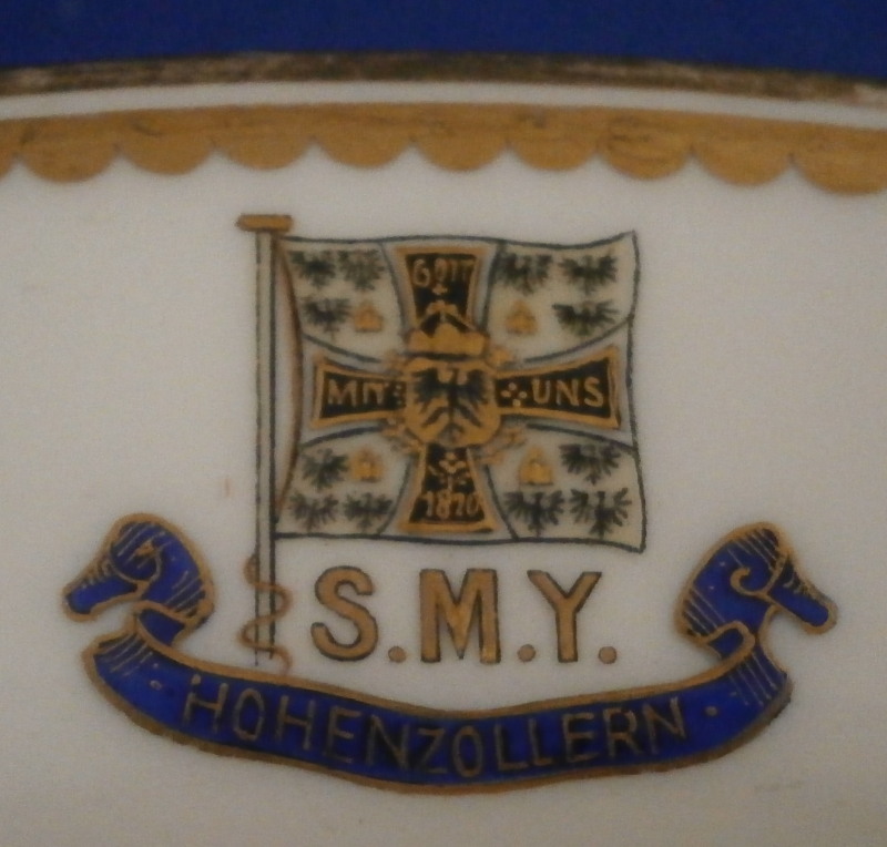 This is a plate made by KPM in 1914. It is from the service from the royal yacht S.M.Y. Hohenzollern which was the personal ship of Kaiser Wilhelm II from 1893 until 1918. The plate has a nice gold trim to the edge, the top has a flag that states Gott mit uns 1870 (god with us) as well as a black eagle in the center with S.M.Y. under the flag and then Hohenzollern on a blue garland in gold letters. The center depicts a golden chain of the Order of the Black Eagle which was the highest order of chivalry in the Kingdom of Prussia. The central design includes the Kaiser crown to the top, a garland of little black eagles as well as golden medals, a blue ring around the center with gold writing stating HONI SOIT QUI MAL Y PENSE which is Latin for something like 'may he be ashamed who thinks badly of it" from the Order of the Garter . The very center has a script W in it for Wilhelm. A superb design all around! Lots of history attached to the plate and it has a nice look to it as well plus it's hard to find them. The plate is marked underneath with the blue scepter, the red orb, date 1914 in blue, some black Roman numerals and 14 as well as a painter's and gilder's mark near the foot ring and the usual impressed marks as shown. The piece is 1 inch tall and 8.625 inches in diameter. It is In great condition with some very minimal wear. Please email me for more information or other pictures.