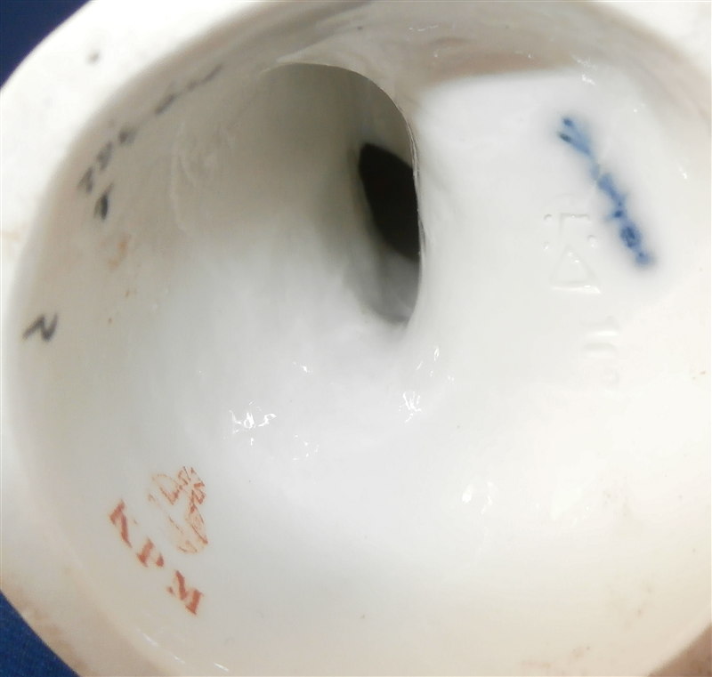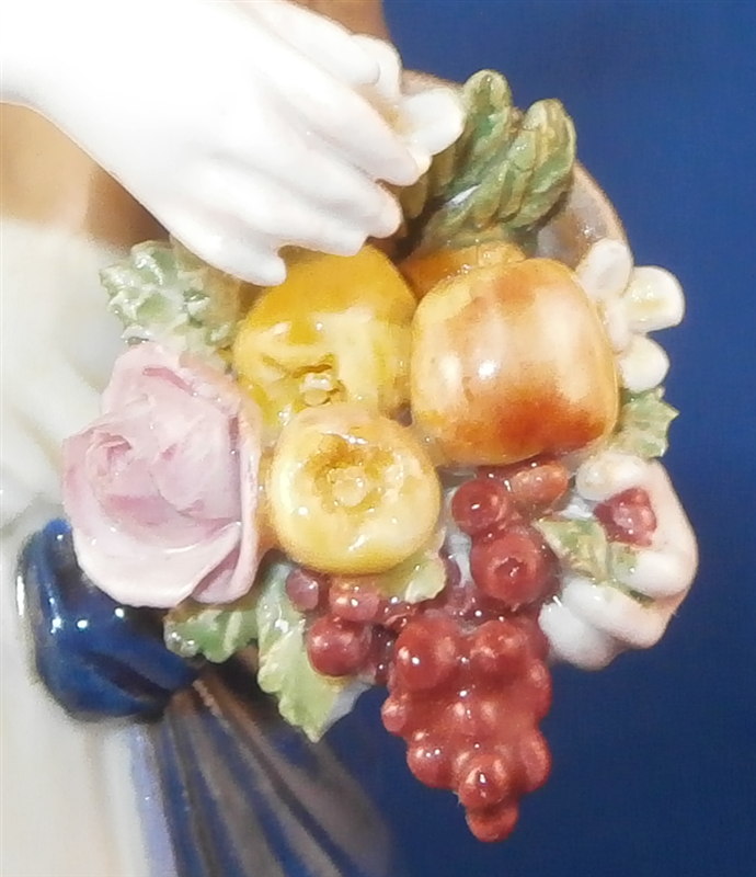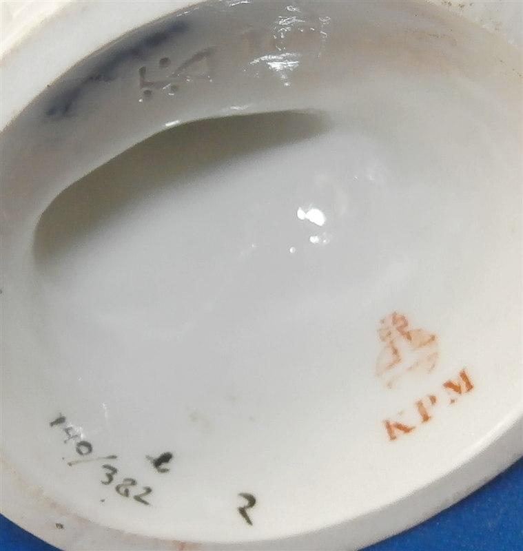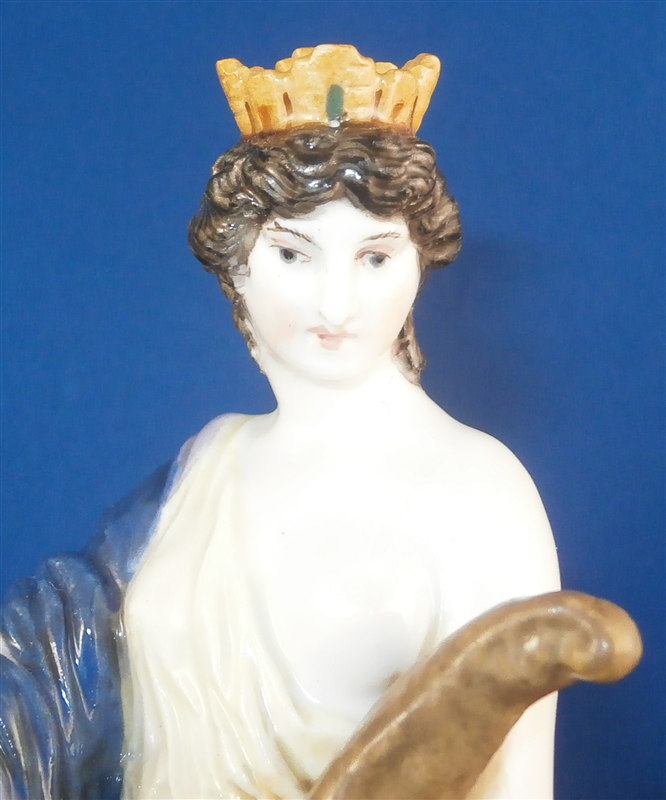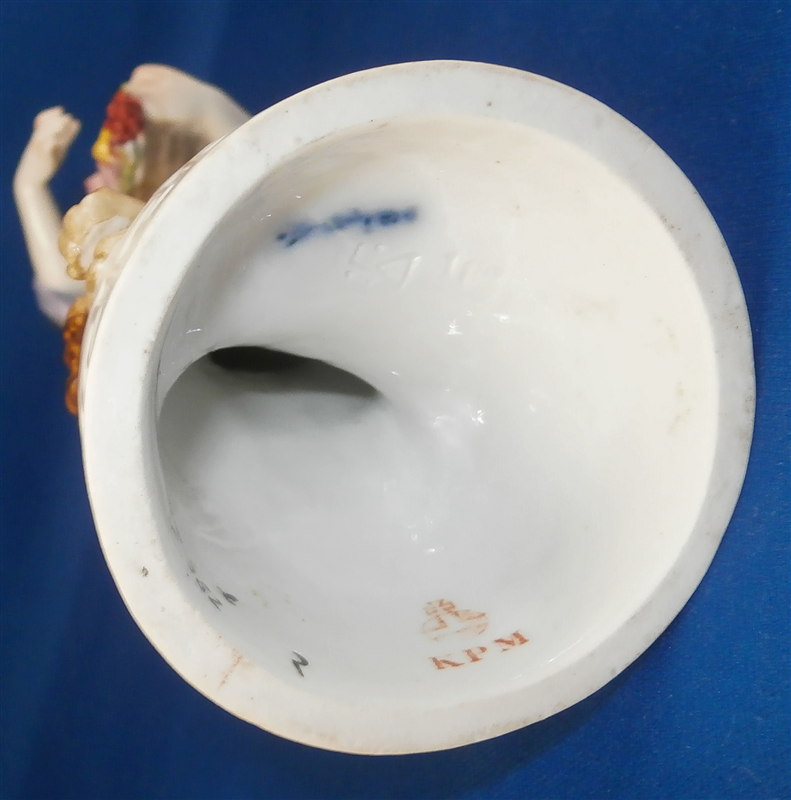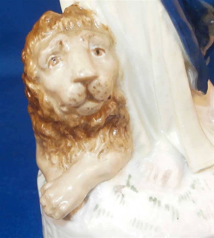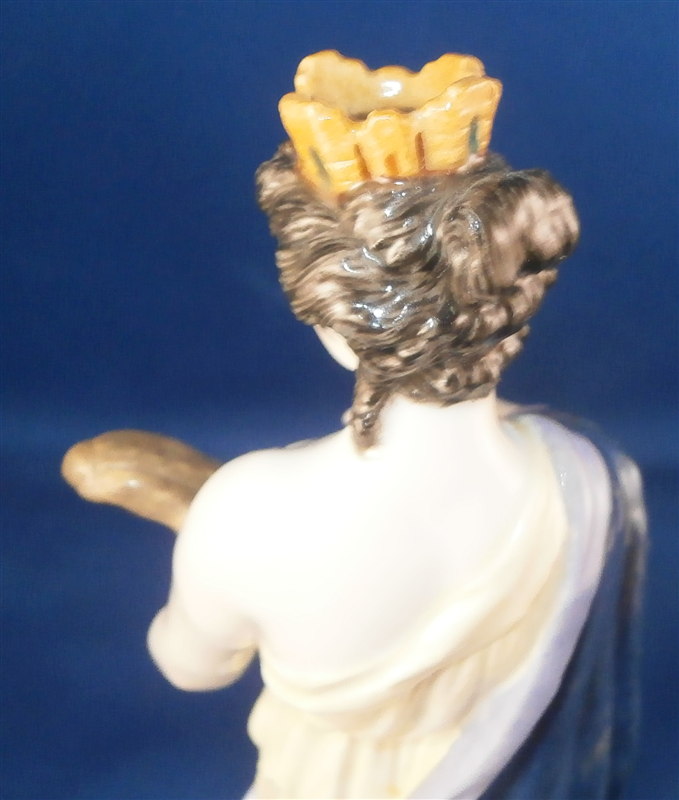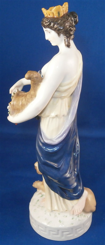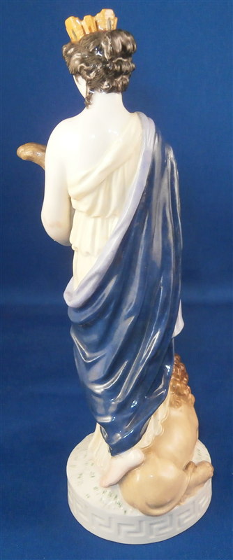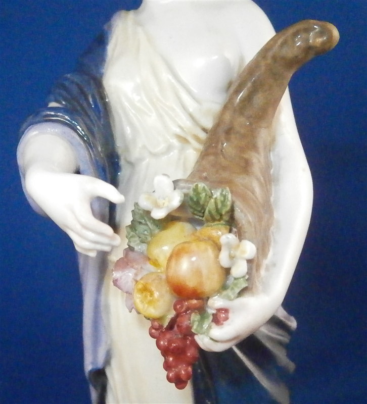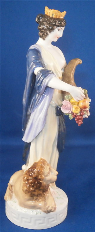 This is a figurine made by KPM around 1912. It is of a lady wearing a crown holding a horn of plenty and a lion figure by her side. She is very well modeled and painted with lots of great detail especially the fruit and flowers in the horn of plenty! She appears to be in perfect condition but the tip of the horn was restored perfectly and that is not visible at all! One tiny leaf has an even tinier chip to it that you have to search for and a tiny spot of paint in the blue robe that flaked off. The lady is about 7.125 inches tall and the base has a diameter of 2.25 inches. The figure is marked underneath with the underglaze blue scepter, the red orb, as well as the usual painter's marks and impressed marks. Please email me for more information or other pictures.