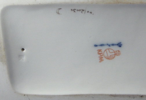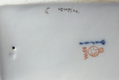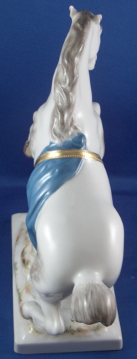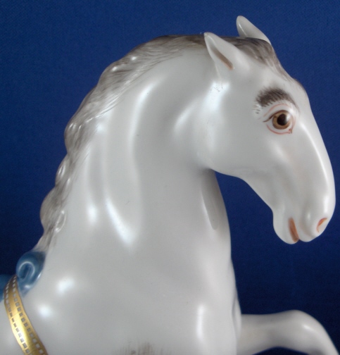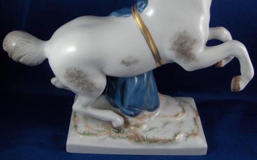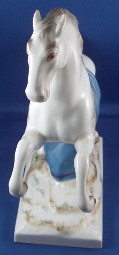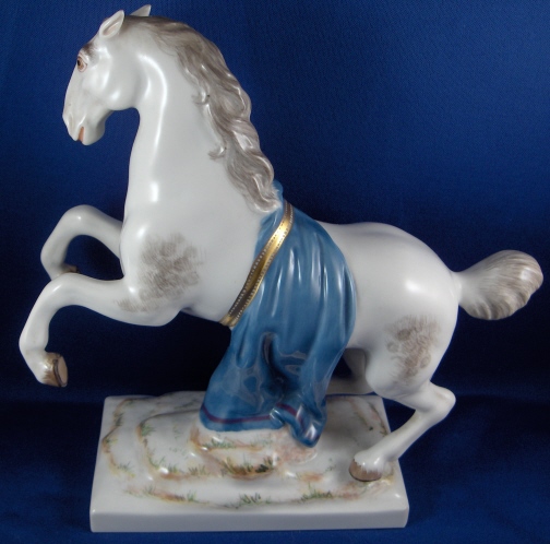 This is a figurine of a horse with a blue blanket made by KPM in the 20th century. It is superbly modeled and very well painted as one would expect from a top maker. I really like this piece and it's companion with a red blanket. It is in superb condition. The figure is about 8.25 inches tall, 3 inches wide and 8.25 inches long. Marked underneath the base with the underglaze blue scepter, the red orb, an impressed 1K (I think) as well as a black number and a half moon painters mark. Please email me for more information or other pictures.