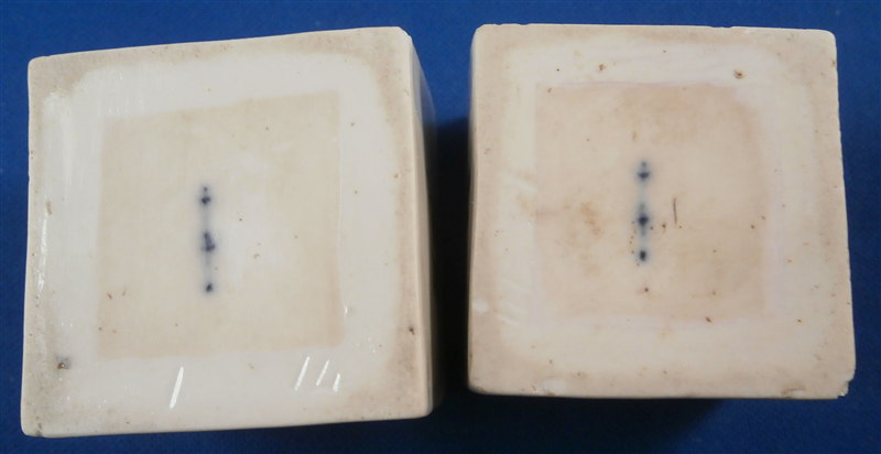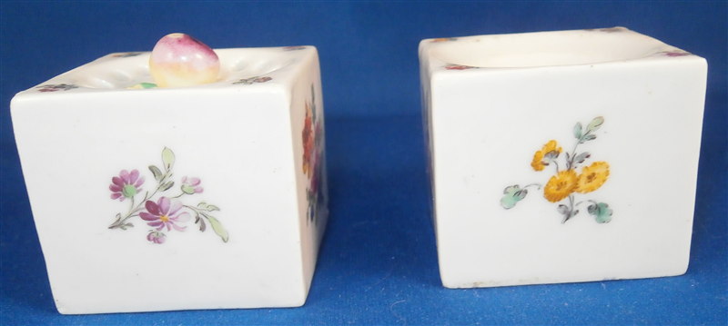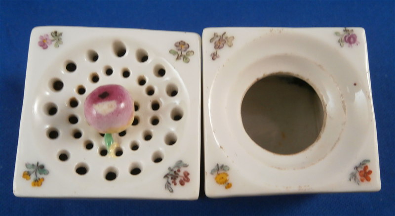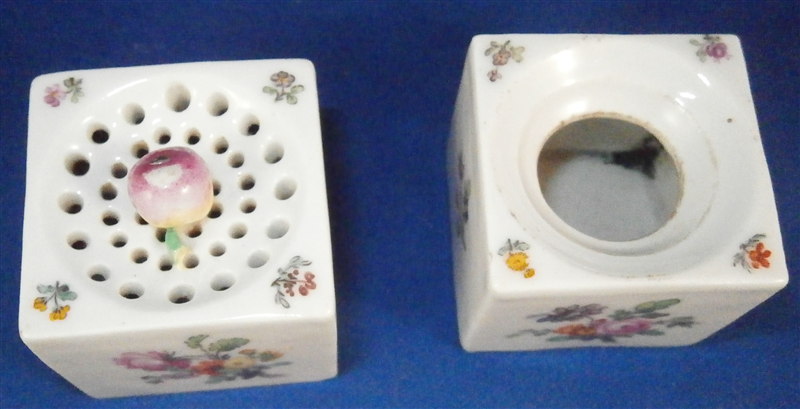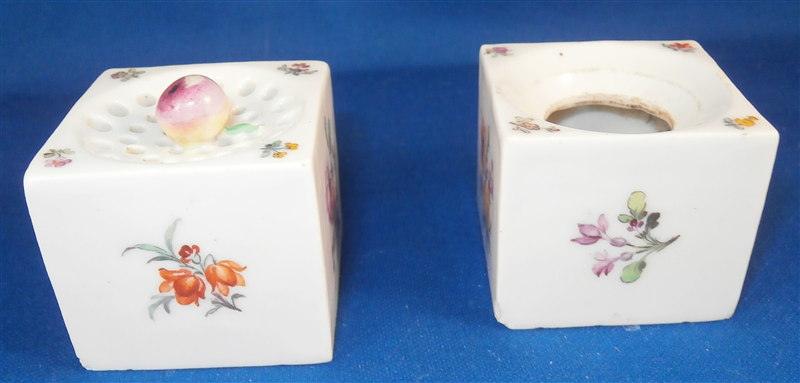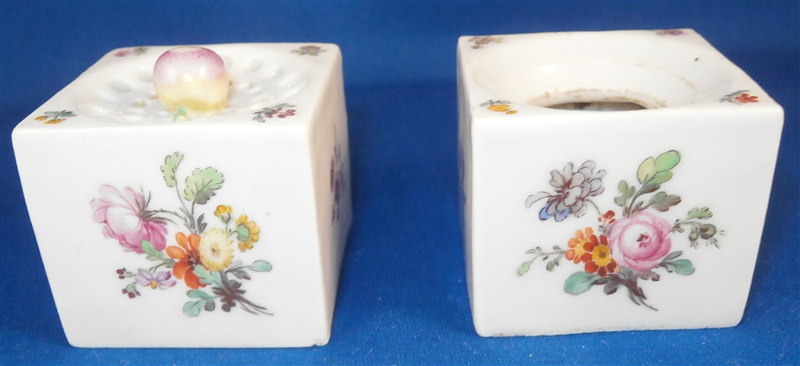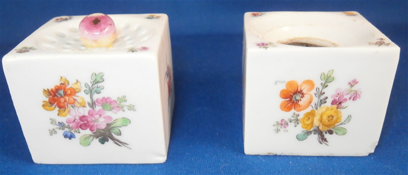 This is a rare inkwell and sander made by KPM around 1780. These would have been part of a larger desk set most likely but work alone as well. KPM used no painters mark like the red orb yet during this period thus you only have the blue scepter and impressed marks most of the time. Both pieces are hand painted with two nice floral arrangements as well as two smaller flowers on the sides, four tiny flowers to the top corners and the pounce pot has a nice fruit finial to the top center. I have not come across a set like this before so it was a msut have. They are in good condition with each peice having some tiny corner chips and sadly the lid of the inkwell is missing. Some staining to the inside of the inkwell and the fruit finial has a white spot to the top that I am not sure is original but might be. The two are 1.25 inches tall and 1.5 inches on each side. Each is marked underneath with the underglaze blue scepter as well as some incised lines which are a size indication. These are probably the smallest version available as they are quite cute. Please email me for more information or other pictures.