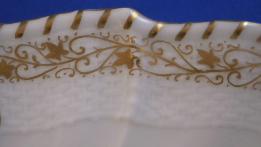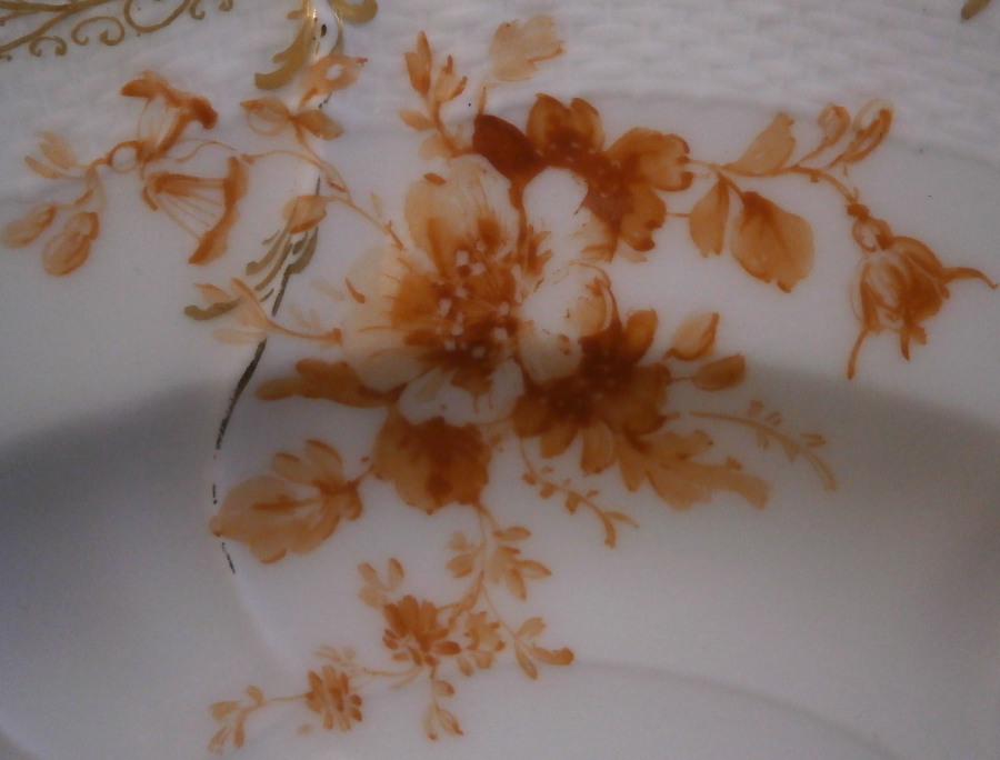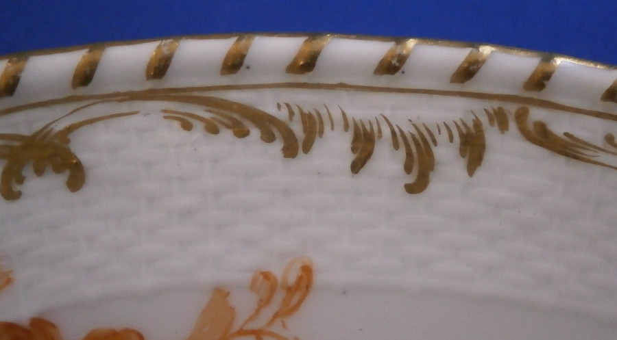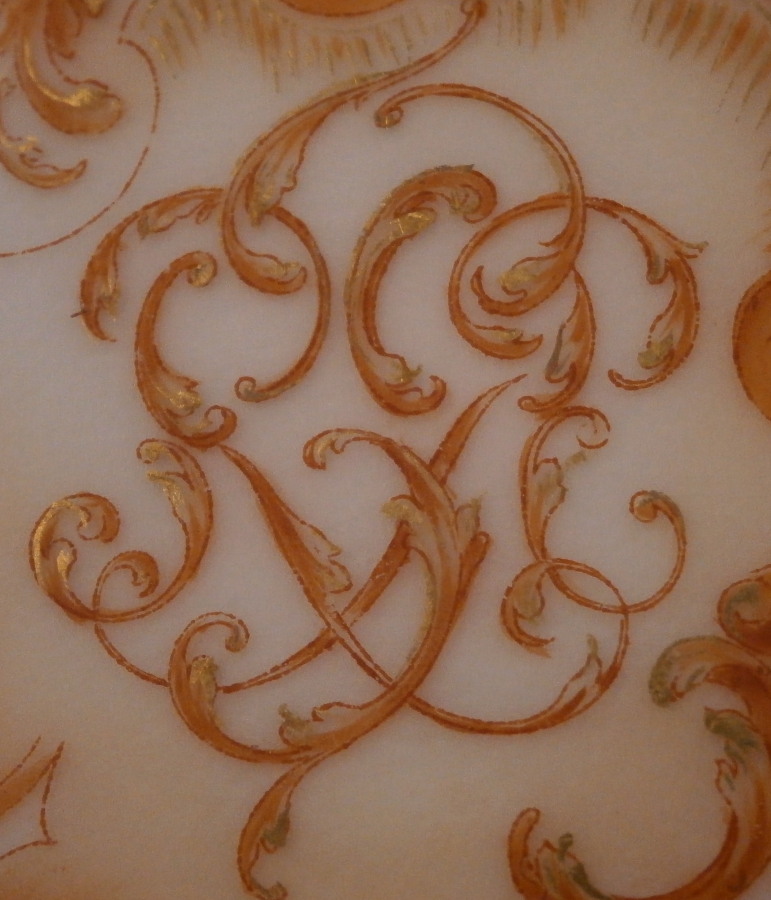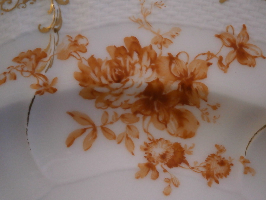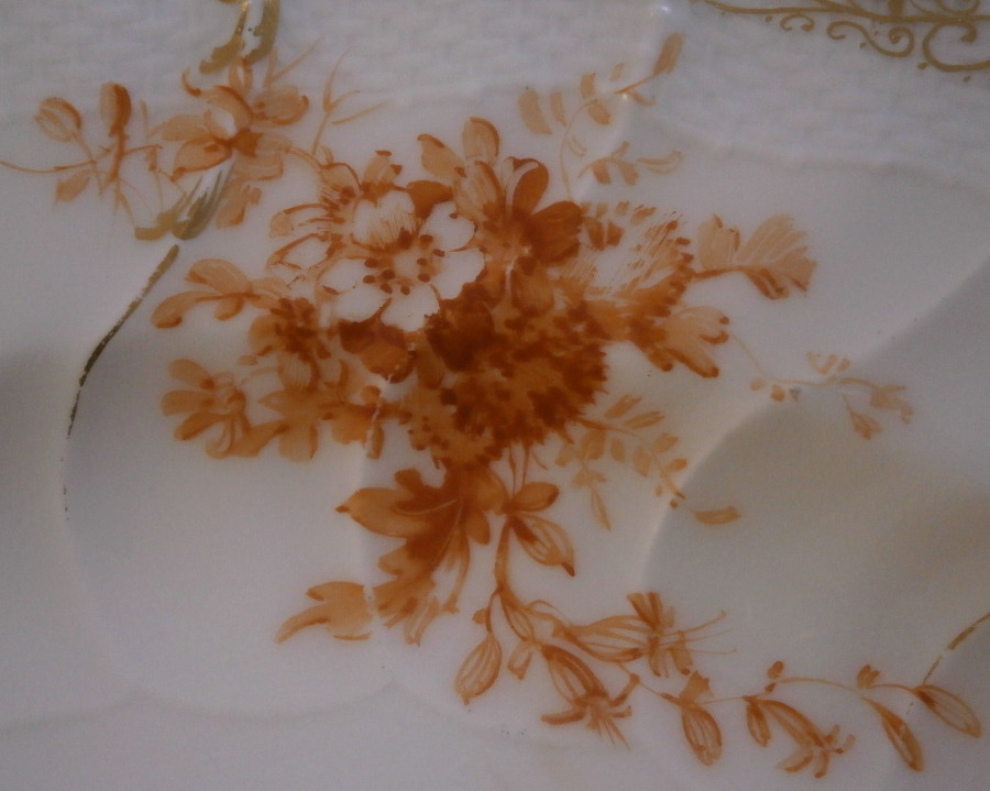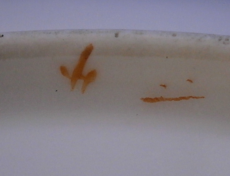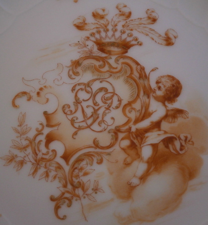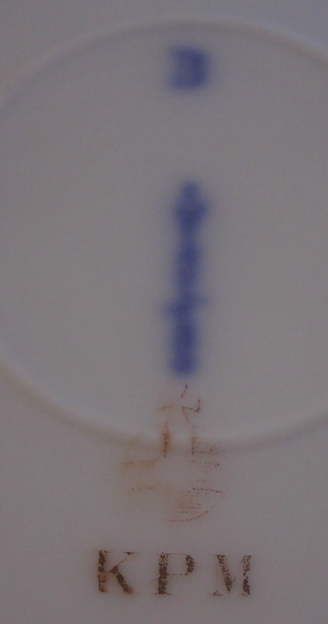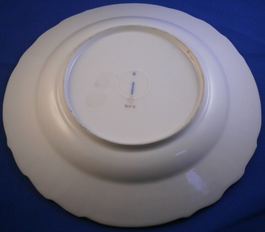 This is plate made by KPM in the early 20th century. The decoration is based on the famous Preußen-Service aka Prussian Royal Table Service and is a nicely hand painted with three floral orange arrangements, a gold trim on a basketweave design along the edge with the best part being the center which has a cherub holding a monogram with a crown with feathers above it. The Prussian service was so popular that a lot of important people ordered services based on it including King Umberto of Italy. I am not sure who this plate was made for but I am looking into it some more. Online there is a seller that sells them as part of the Prussian royal service but then it would have Kasiser Wilhelm II monogram to the udnerside as well as a year mark. So that is not correct. Either way it is a really nicely done plate with some sort of aristocratic history to it. I will try to uncover it and that is one of my favorite things with porcelain. Always something new to find out and learn! The plate is in superb condition with just a very very minor touch of wear to the gilding. As nice an example as you will find! The plate is 1.375 inches tall and 9.625 inches in diameter. It is marked underneath with the under glaze blue scepter, the red orb as well as various artist and impressed marks as shown. Please email me for more information or other pictures.