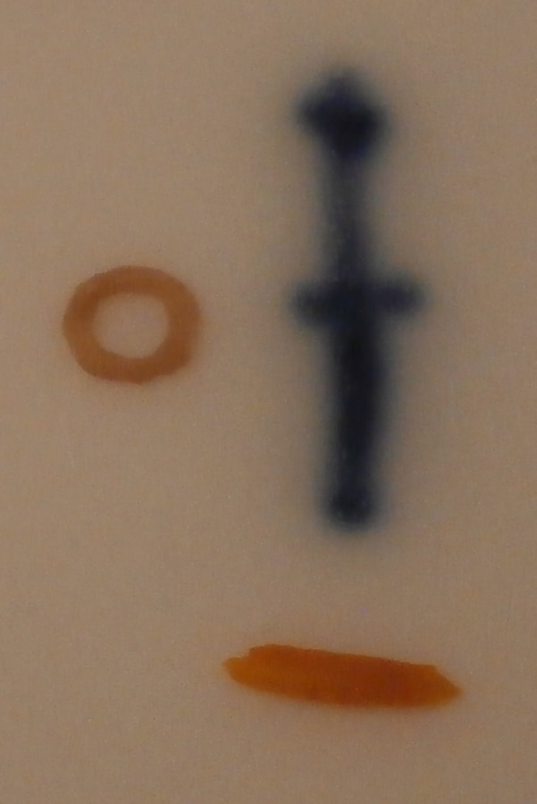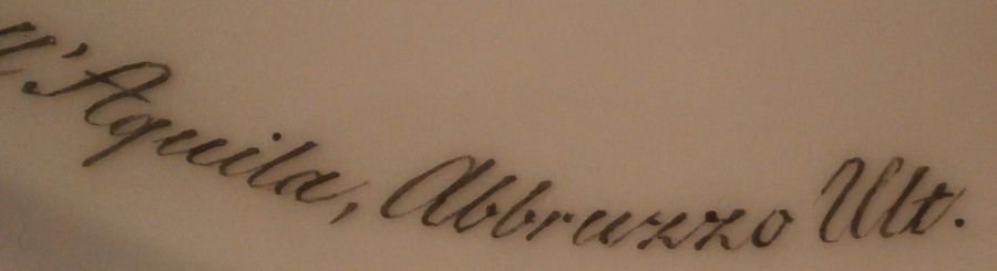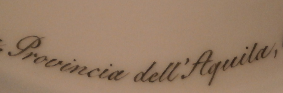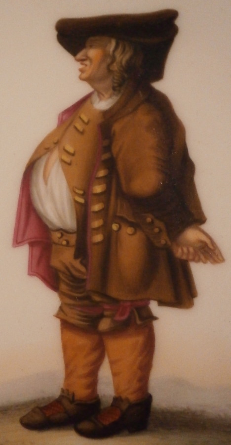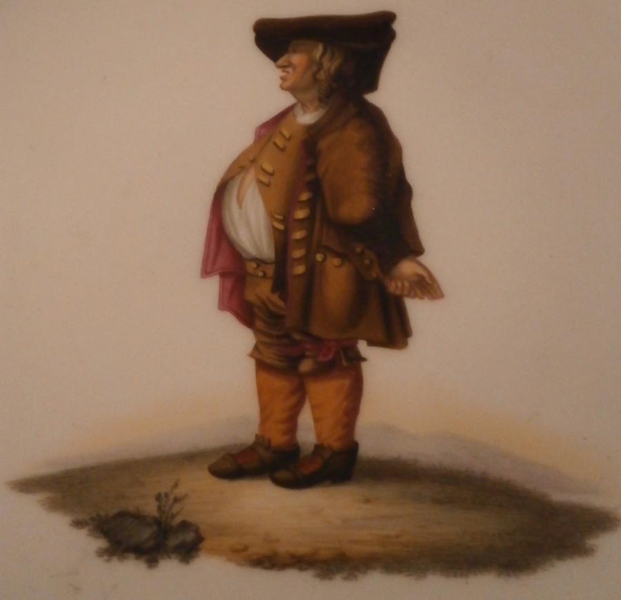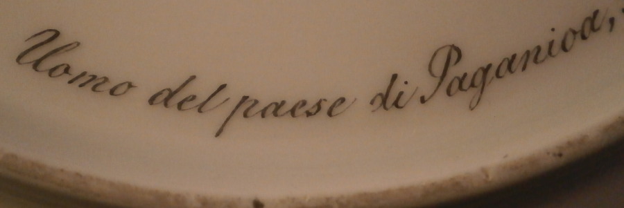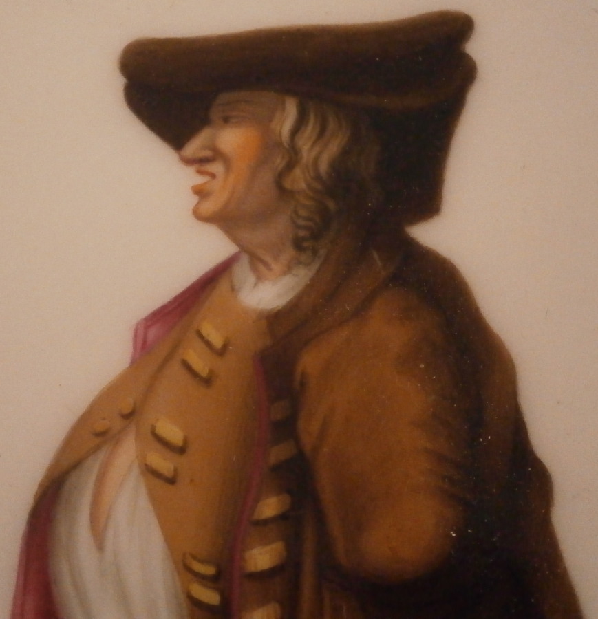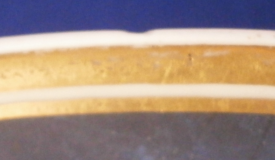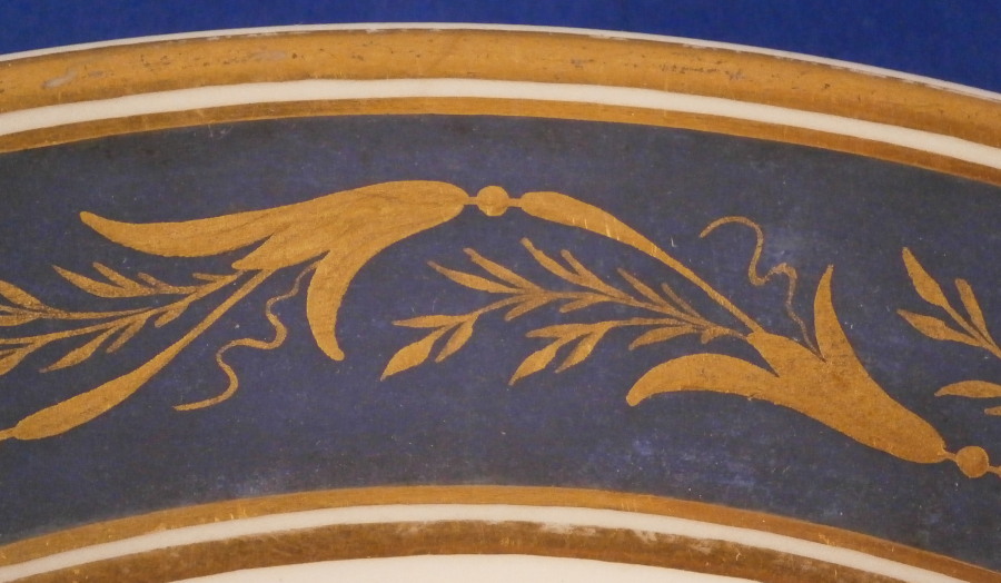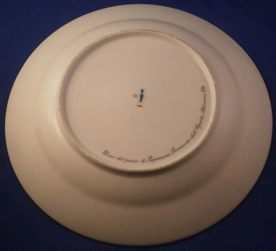 This is a superb plate made by KPM in the early 19th century. KPM didn't use the red orb as a painter's mark yet during this period thus you only have the blue scepter and impressed marks most of the time and sometimes a symbol that represents an individual painter as is the case here where we have two different painter's marks. The plate is hand painted with a gentleman in the center standing in some greenery. An unusual motif and really very nice. He is dressed in a fancy outfit and the shirt looks to be bursting at the front which I find funny. The rim has a superb blue ground with a nice gold trim - the blue being the very rare unglazed matte type color. My favorite color of all! A really nice plate!! The plate is just over 1.25 inches tall and 8.875 inches in diameter. It is marked underneath with the under glaze blue scepter mark as well as the two painter's marks I already mentioned and the description of the scene in Italian - Uomo del paese de Paganioa, Provincia dell"Aquila, Abbruzzo Ult. which means somethings like Man from the village of Paganioa, Province of Aquila, Abbruzzo Ult. not sure what the last part means. The plate is in superb condition with just a touch of wear and a tiny chip or flaw to the very edge as shown. One of the more unusual and nice pieces I ahve come across lately. Please email me for more information or other pictures.