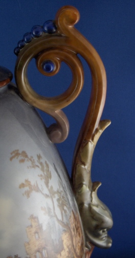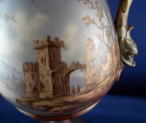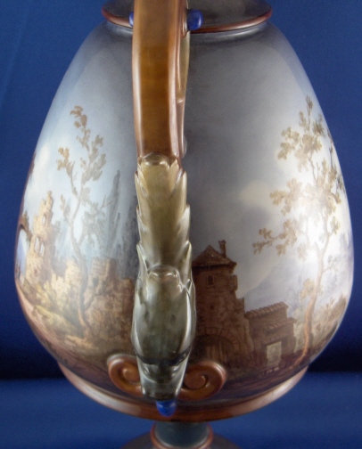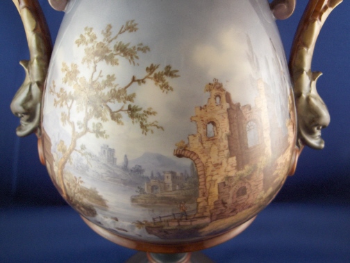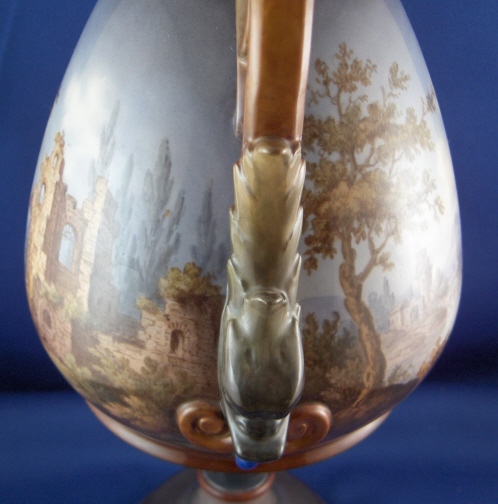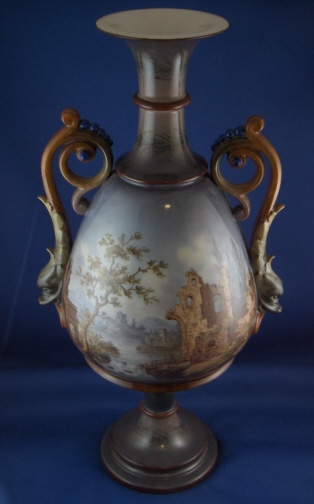 This is a rare vase made by KPM in 1907 in the style of the old Italian faience vases. It is handpainted all around with ruin scenes and the handles are in the shape of dolphins. This an amazing piece! Superb detail in the scenes that are hard to show in pictures. The vase is 15 inches tall, 7 inches deep and 8 inches wide including the handles. It is marked underneath with the underglaze blue scepter and the red orb mark as well as an impressed G. The vase is in super display condition but a chip to the top rim was restored and the skinny blue section underneath the main part was restored as well. This restauration was done by the best and can't be seen! There is a hole in the vase which means you can't add water to it. And there are a few minute fleabite type paint spots missing on the rims which don't distract at all. Please email me for more information or other pictures.
