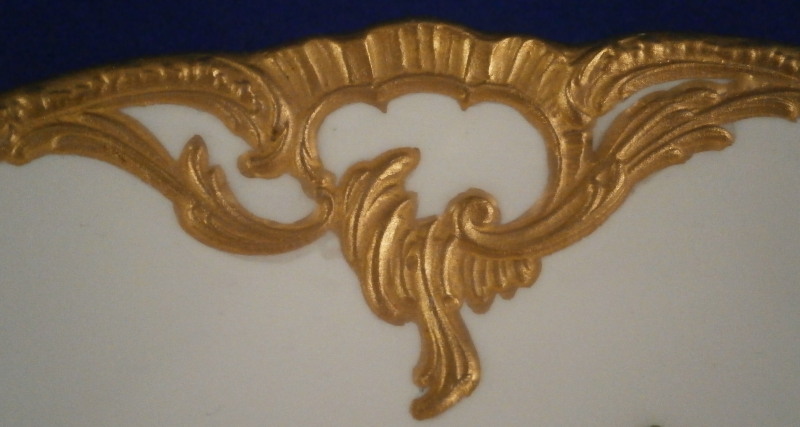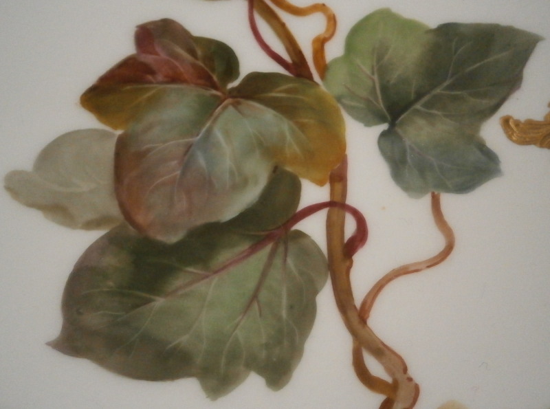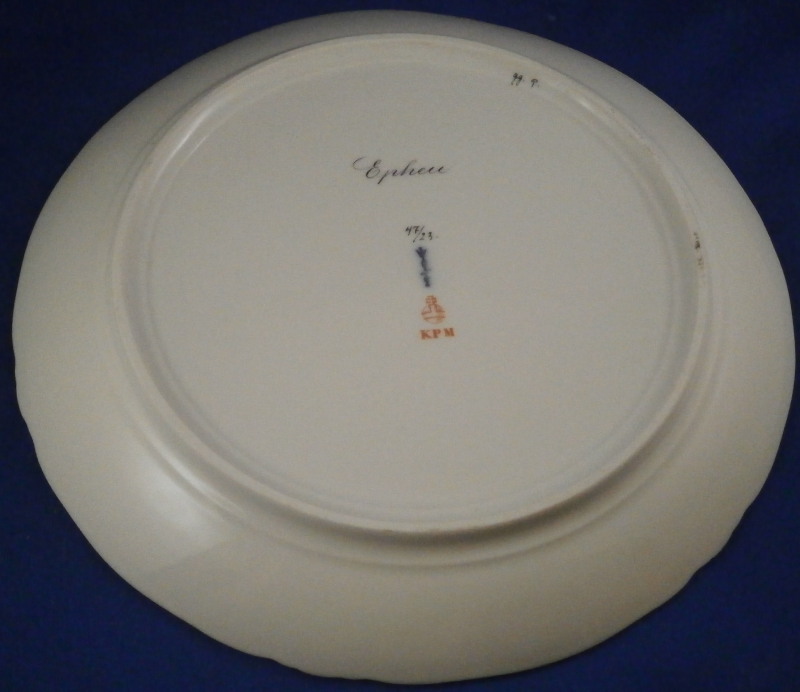 This is a plate made by KPM in 1912. It is hand painted with the rarest design on these plates of this style - the tree branch / leaf motif. This one is of a vine of ivy (Epheu - old spelling of Efeu) with the vine showing with leaves from larger to smaller - quite nice! Kind of the German version of the Flora Danica :) Just an amazingly detailed painting. The rim itself is painted with gold on a raised design. The plate is in perfect condition. It is 8.75 inches in diameter so a nice size and 1 inch tall. The plate is marked underneath with the underglaze blue scepter, the red orb mark, some black numbers and painter's marks, the usual impressed marks of this period and the name of the motif - Epheu in black script. Please email me for more information or other pictures.