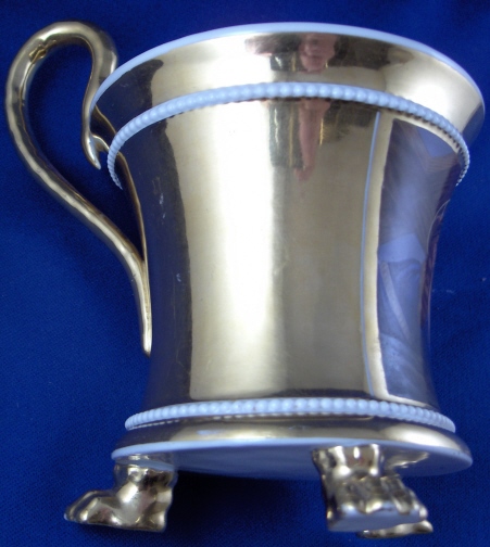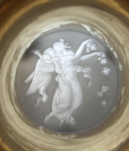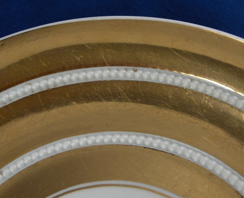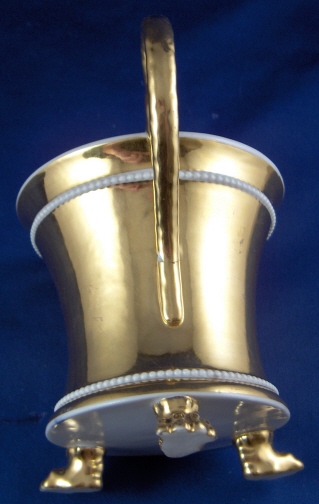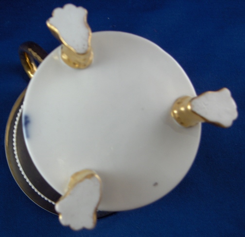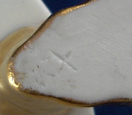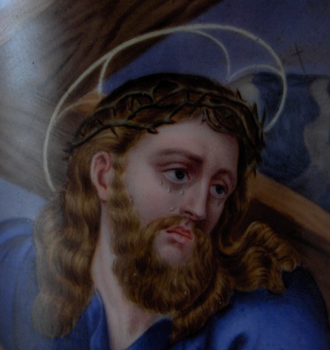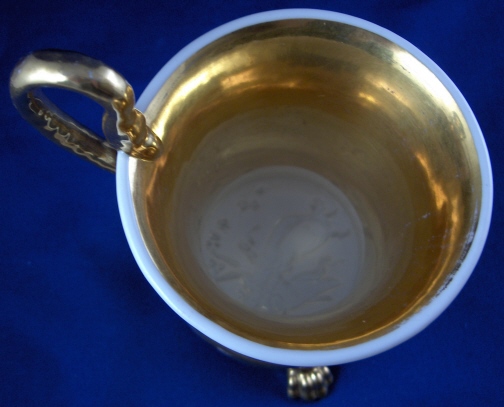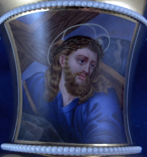This is a rare cup and saucer made by KPM in the mid 19th century. These cups are extremely rare especially with scenes on them - I was quite excited when I found it (yeah I know I am a porcelain geek!). The shape of the cup and saucer is just plain superb, then you ahve the amazingly detailed and superb quality scene of Jesus carrying the cross on the front, a swan shaped handle, lots of amazing gold but the best part is the superb lithophane in the bottom of the cup of an angel with a putto and some flowers. The saucer has two rows of a pearl necklace type design that the cup also has and a nice gold design in the center. Doesn't get better than this. The set is in great condition with a tiny bit of gold wear (really very little) and the bottom of the handle has a stress crack in it that kicked a small chip out of the side. Doesn't take away from the piece and if need be an easy fix but I'd just leave it be! The cup is a bit over 3.5 inches tall plus the handle which is another 1.25 inches higher and 3.5 inches in diameter. The saucer is 0.875 inches tall and 6.25 inches in diameter. The saucer is marked underneath with the underglaze blue scepter mark that is hard to see and the cup has the mark sqeezed on the very edge of the bottom so it doesn't interfere with the lithophane! Also some sort of incised mark on one foot. Please email me for more information or other pictures.