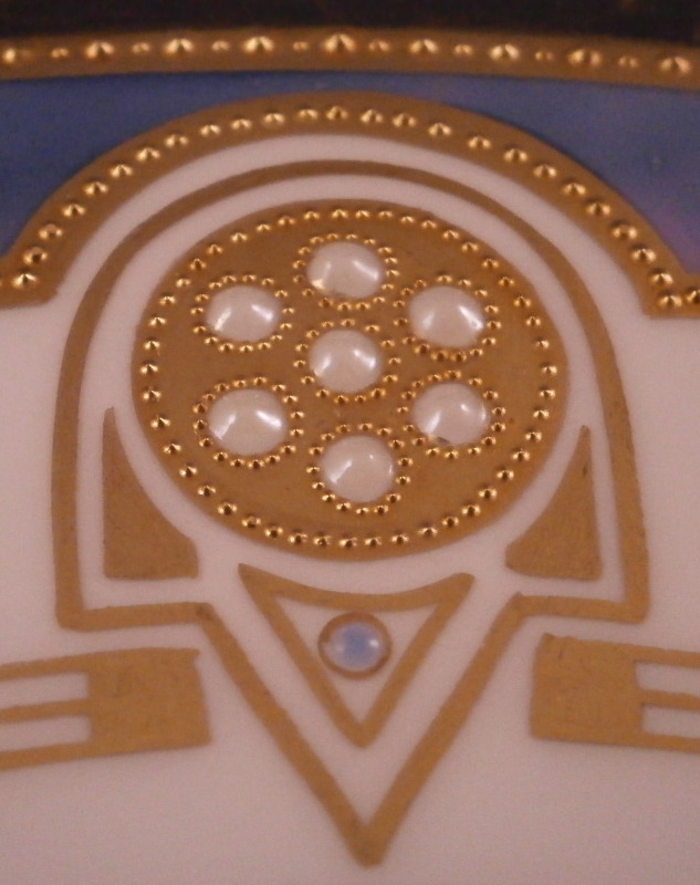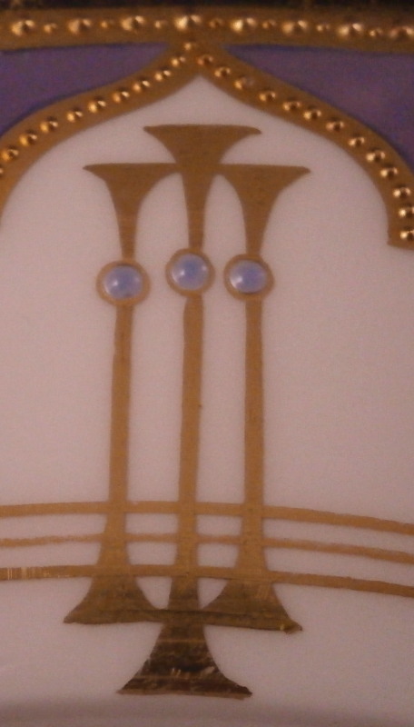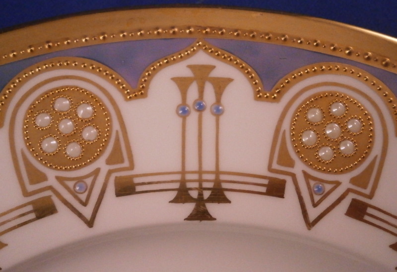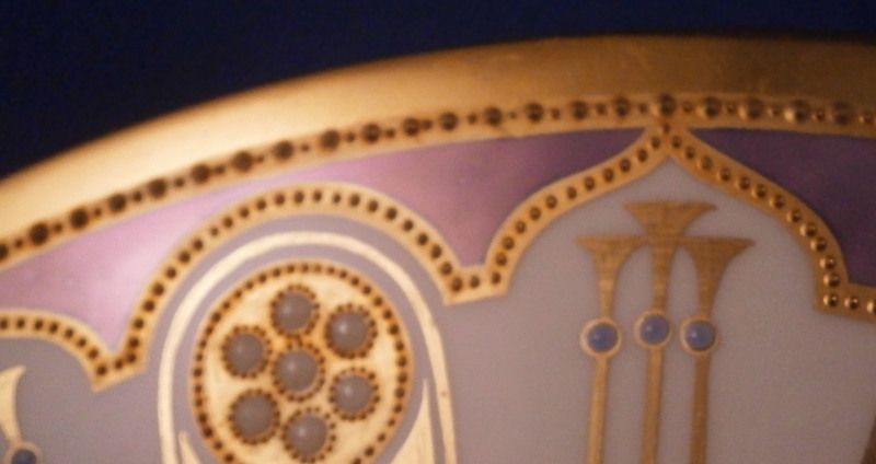 This is a really amazing Art Nouveau / Jugendstil plate made by KPM in the early 20th century. It is hand painted with a nice gold design that includes two different designs along the rim. One has a set of seven white raised jewels in the center that look a bit like white opals and a tiny blue raised jewel below and the other has three thin columns that each have one raised jewel near the top. The edge has a raised gold design to it with the space in between filled with this amazing purple luster color. Hard to descibe it so have a look at the pictures. It is stunning! The center has a medallion in it with moore raised jewels and gold trim and some of the luster color as well. One of the nicest plates of this type I have seen. The piece is in perfect condition with just some very minor age related marks. The plate is 0.875 inches tall and just under 10.5 inches in diameter so fairly large! The plate is marked underneath with the under glaze blue scepter and their red Made in Germany mark as well the usual impressed marks of the period. It is a first choice piece so I am not sure why it does not ahve the red orb mark but it might be because it is a Seger porcelain piece which did not have the red orb mark. Please email me for more information or other pictures.
