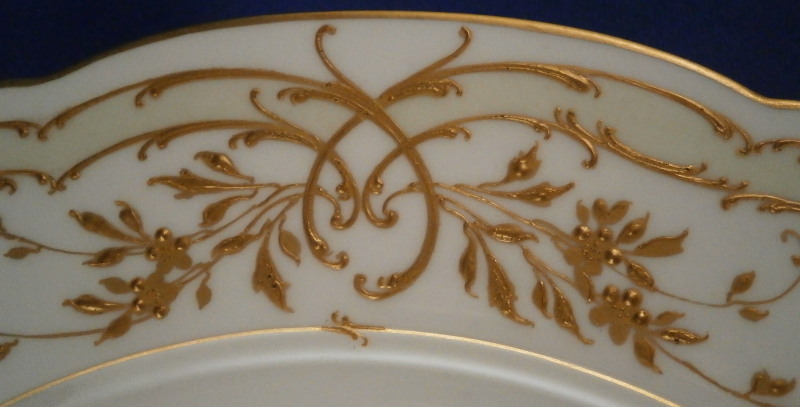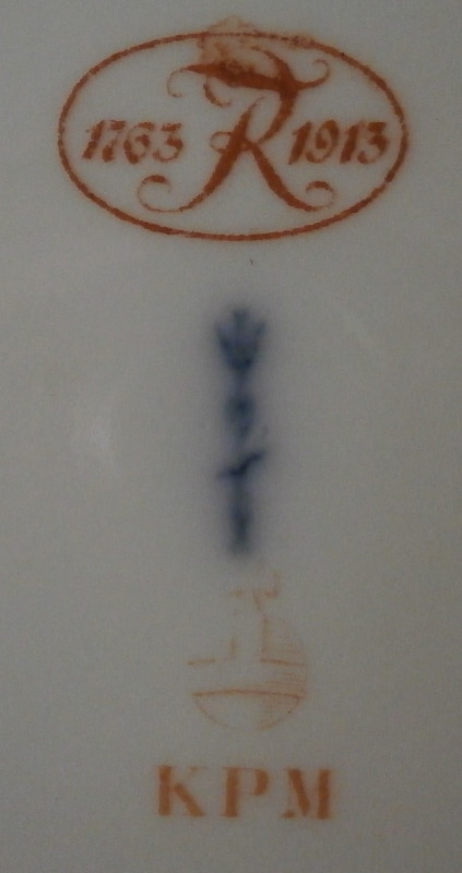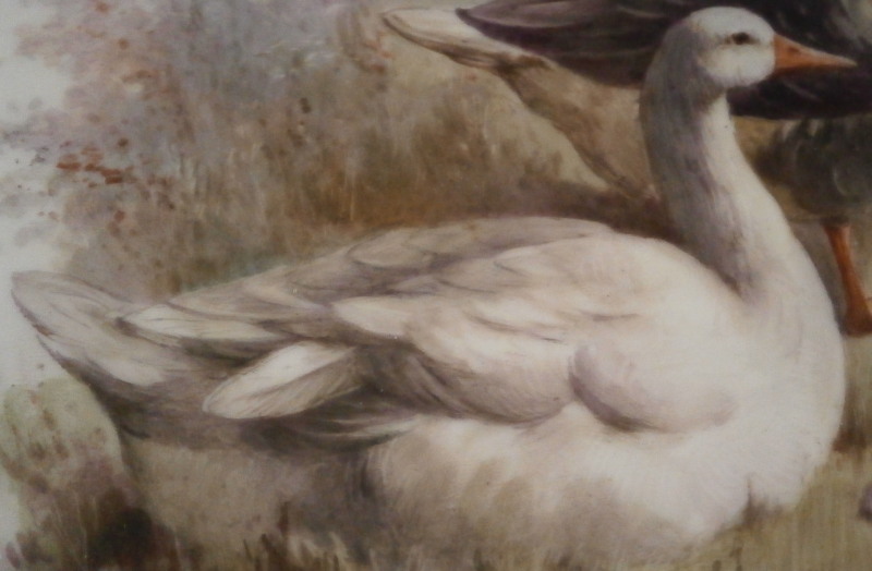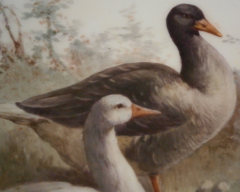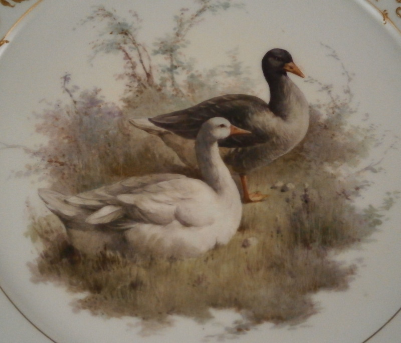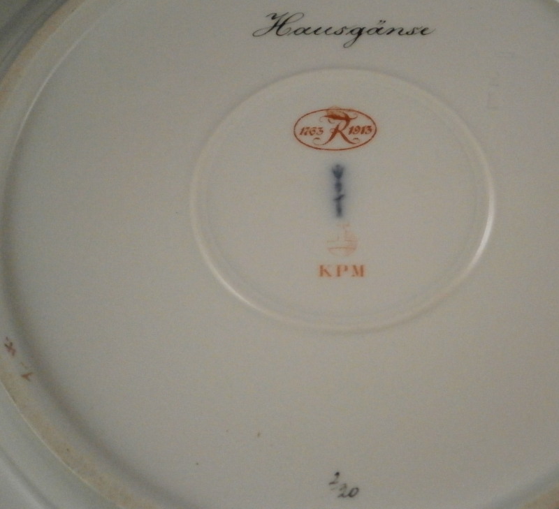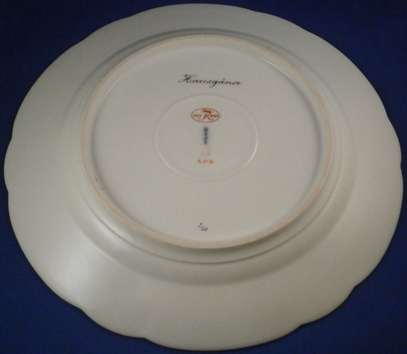 This is a superb Art Nouveau period plate made by KPM in the early 20th century. The plate is hand painted with a pair of geese birds sitting in a landscape surrounding. They are domestic geese with the male goose being darker while the female is mostly white - quite nice and the quality of the painting is top notch! The rim is decorated in the Art Nouveau / Jugendstil style with raised gold scrolls and a slightly greenish ground color between the scrolls which is hard to see in the pictures. A truly superb plate and it is in perfect condition. The piece is 1 inch tall and 9.75 inches in diameter. It is marked underneath with the underglaze blue scepter as well as the red orb mark, their red anniversary mark for 1913, a painter's and gilder's mark, a black 2/20 and the usual impressed marks of the period plus the word Hausgaense which is the German word for common geese. Please email me for more information or other pictures.