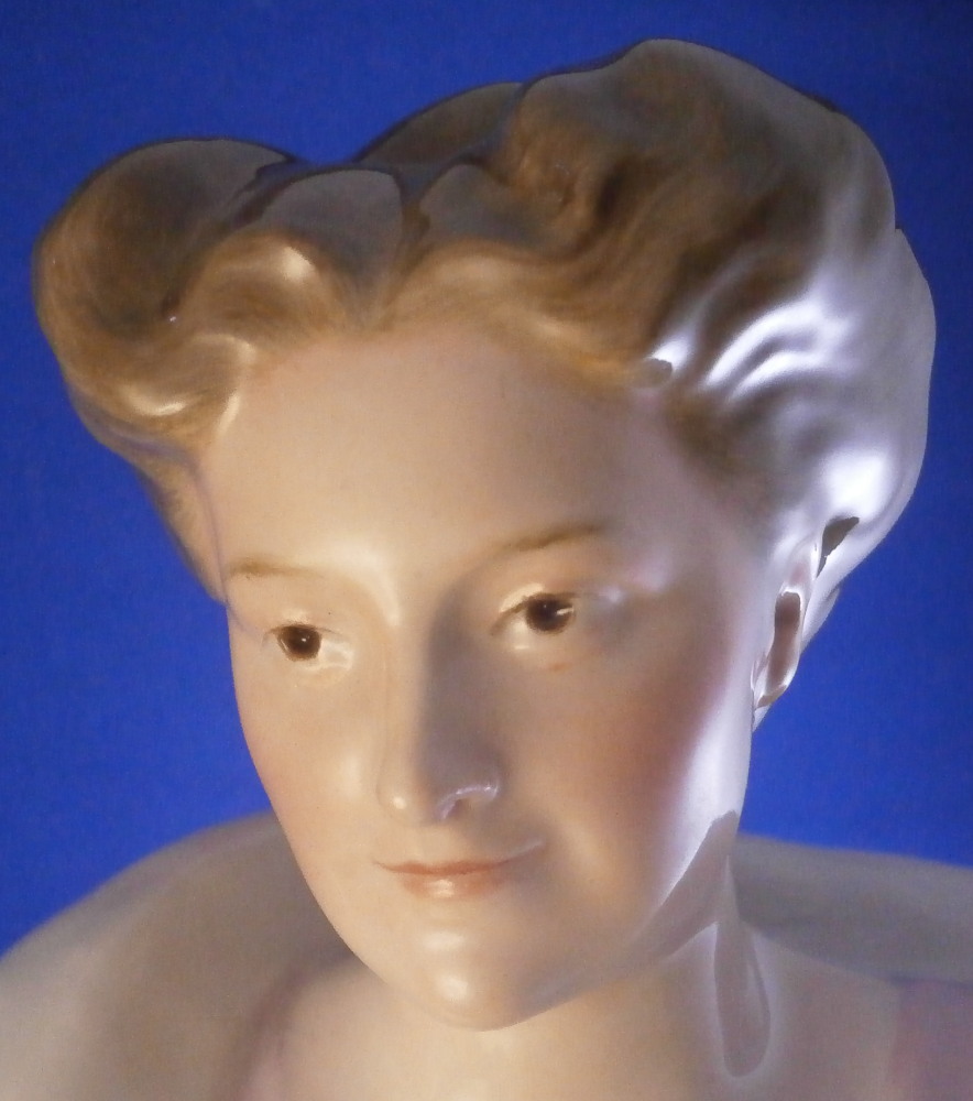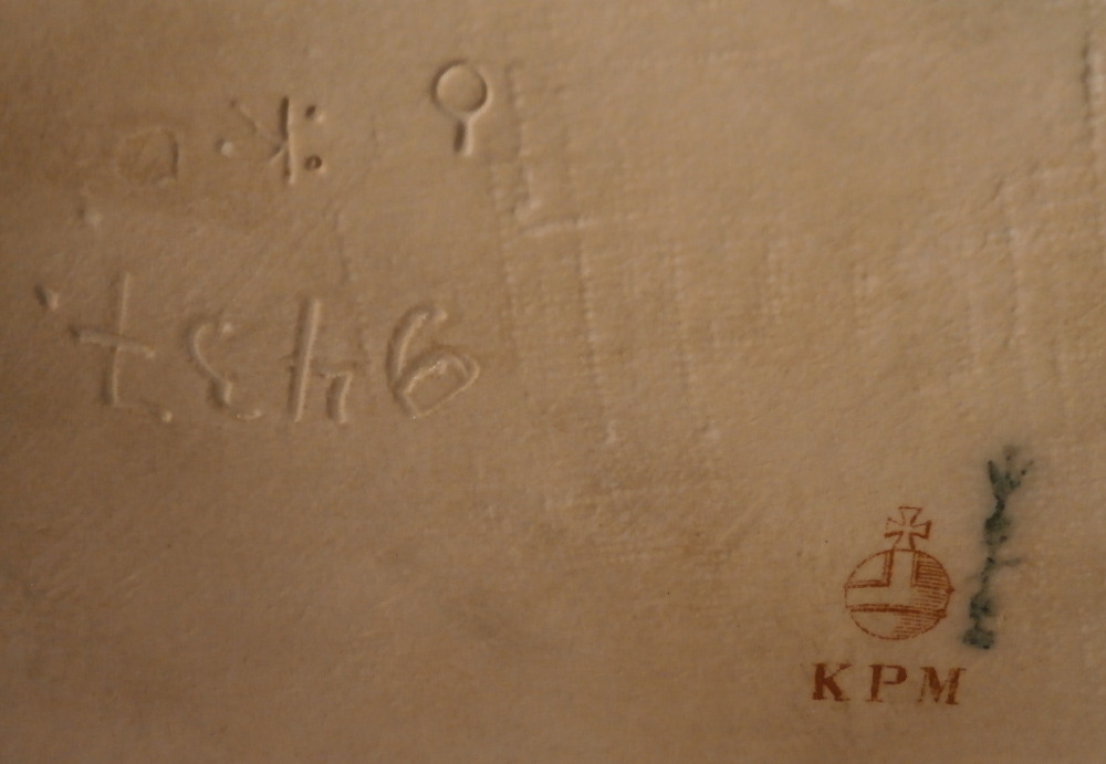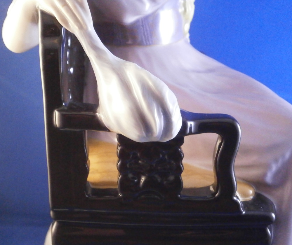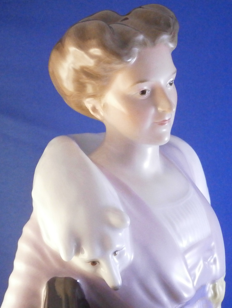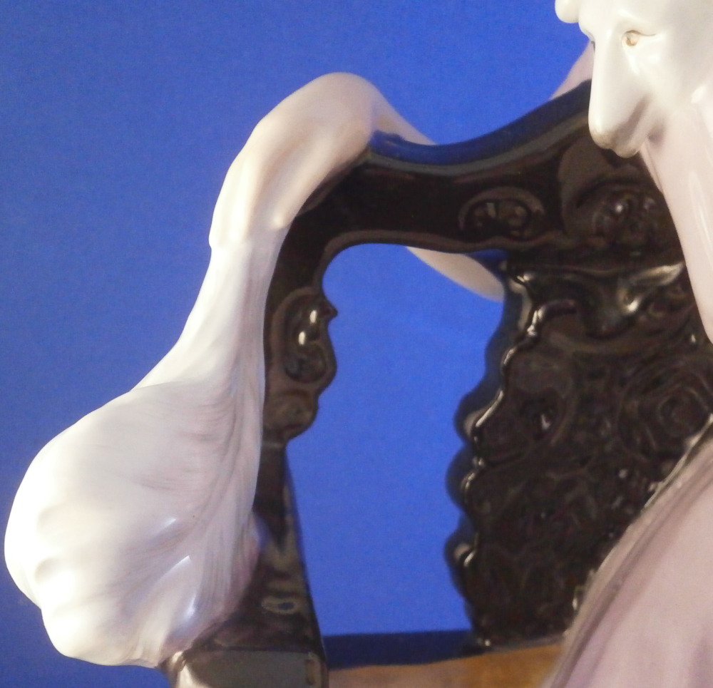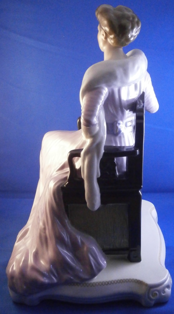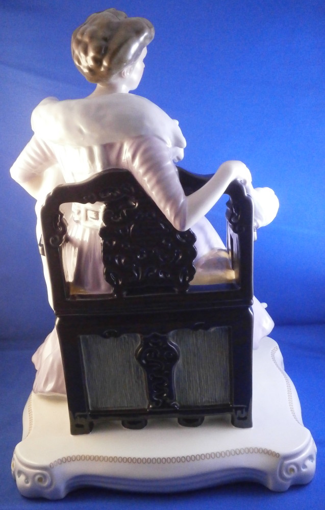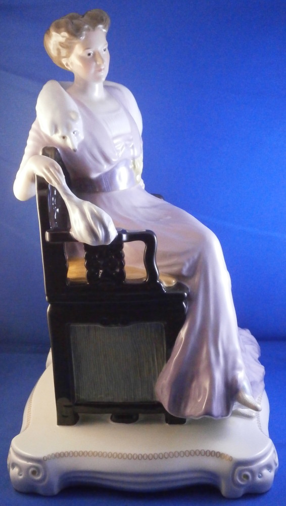 This is a very large and rare figurine made by KPM in the early 20th century during the Art Nouvea / Jugendstil period. A truly amazing figure of an elegant lady sitting in a nice chair. She is wearing a fancy gown with what looks to be a white fox fur stole around her neck and a fan of ostrich feathers in her right hand. The left hand is holding a yellow floral arrangement placed on her hip. Elegant gold dotted shoes with light blue in the center. The belt around her waste has a white and gold design to it. The chair is superb as well with lots of "carved" details to it and the seat cover has a gold design to it. The base is quite typical of this period with a nice shape to it with a gold ring design along the edge and seger enamel "jewels" to the corners. The entire piece is hand painted in the rare under glaze colors of this period. It is a stunning figure and I cannot find another example of it so definitely not something you'll come across again anytime soon. The figure is in perfect condition. The figure is about 13.5 inches tall and the base is 9.5 inches wide and 8.25 inches deep. It is marked underneath with the blue scepter, the red orb (it should be marked with the blue orb for under glaze colors) as well as the usual impressed and incised marks as well as painter's marks from this period as shown. First choice which is amazing for a piece of this and highly unusual. The piece is very ehavy! Please email me for more information or other pictures.
