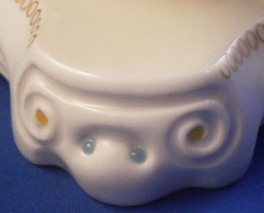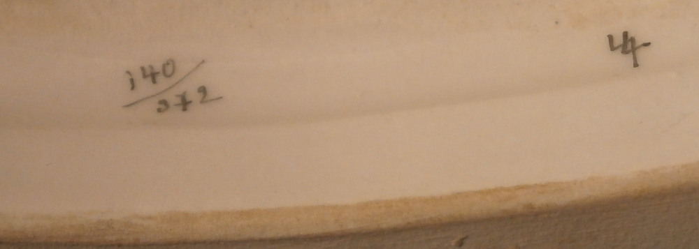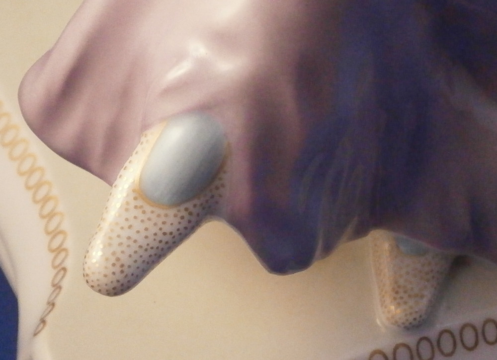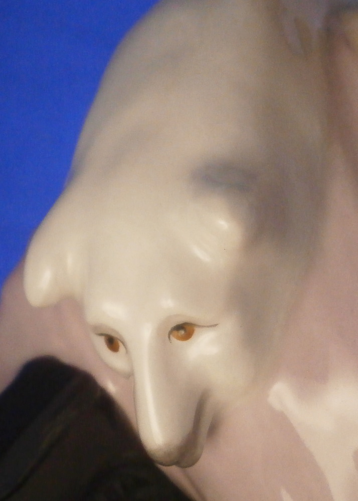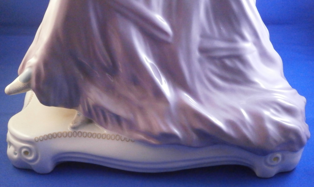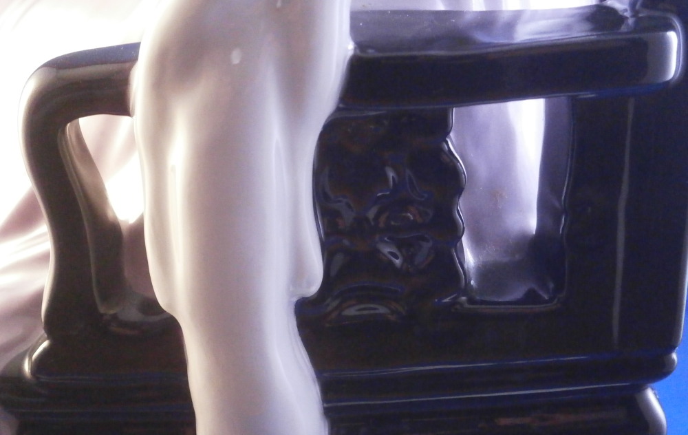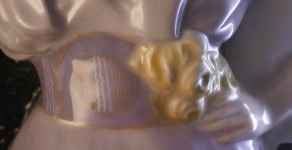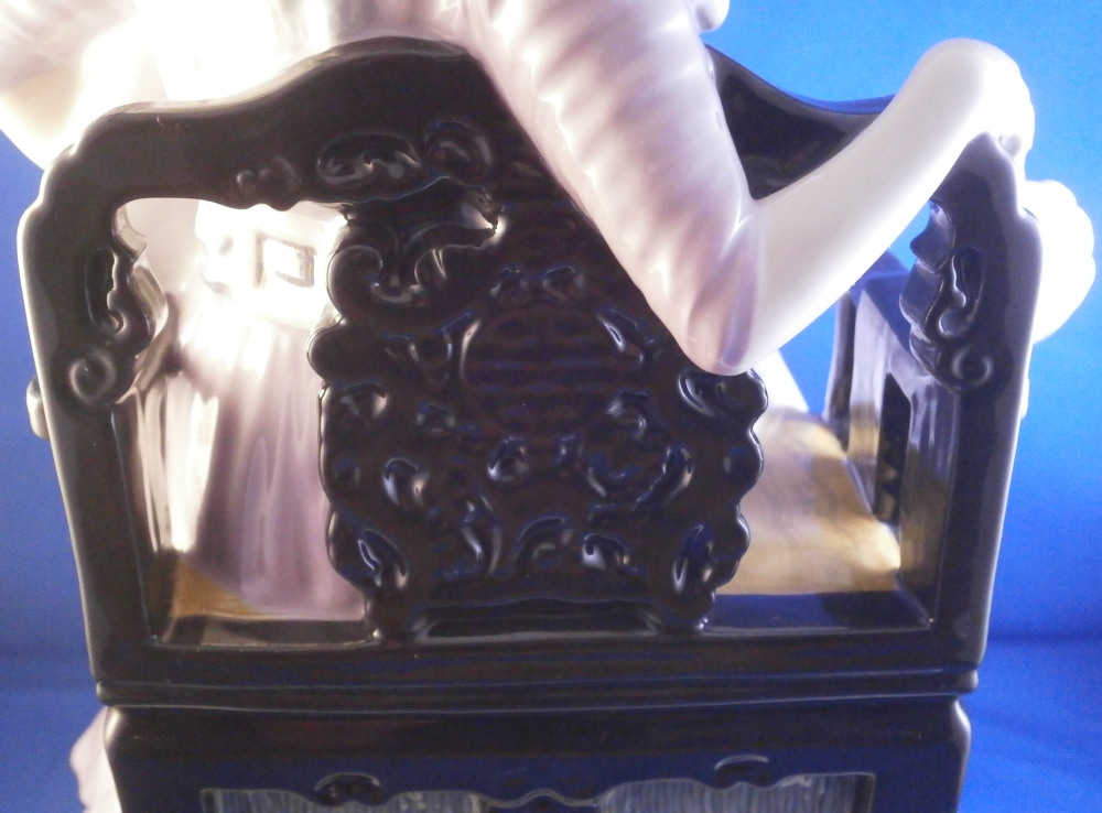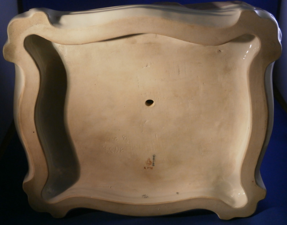 This is a very large and rare figurine made by KPM in the early 20th century during the Art Nouvea / Jugendstil period. A truly amazing figure of an elegant lady sitting in a nice chair. She is wearing a fancy gown with what looks to be a white fox fur stole around her neck and a fan of ostrich feathers in her right hand. The left hand is holding a yellow floral arrangement placed on her hip. Elegant gold dotted shoes with light blue in the center. The belt around her waste has a white and gold design to it. The chair is superb as well with lots of "carved" details to it and the seat cover has a gold design to it. The base is quite typical of this period with a nice shape to it with a gold ring design along the edge and seger enamel "jewels" to the corners. The entire piece is hand painted in the rare under glaze colors of this period. It is a stunning figure and I cannot find another example of it so definitely not something you'll come across again anytime soon. The figure is in perfect condition. The figure is about 13.5 inches tall and the base is 9.5 inches wide and 8.25 inches deep. It is marked underneath with the blue scepter, the red orb (it should be marked with the blue orb for under glaze colors) as well as the usual impressed and incised marks as well as painter's marks from this period as shown. First choice which is amazing for a piece of this and highly unusual. The piece is very ehavy! Please email me for more information or other pictures.