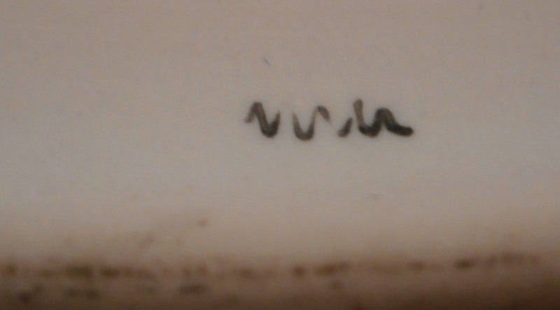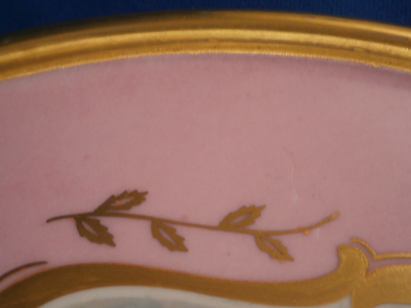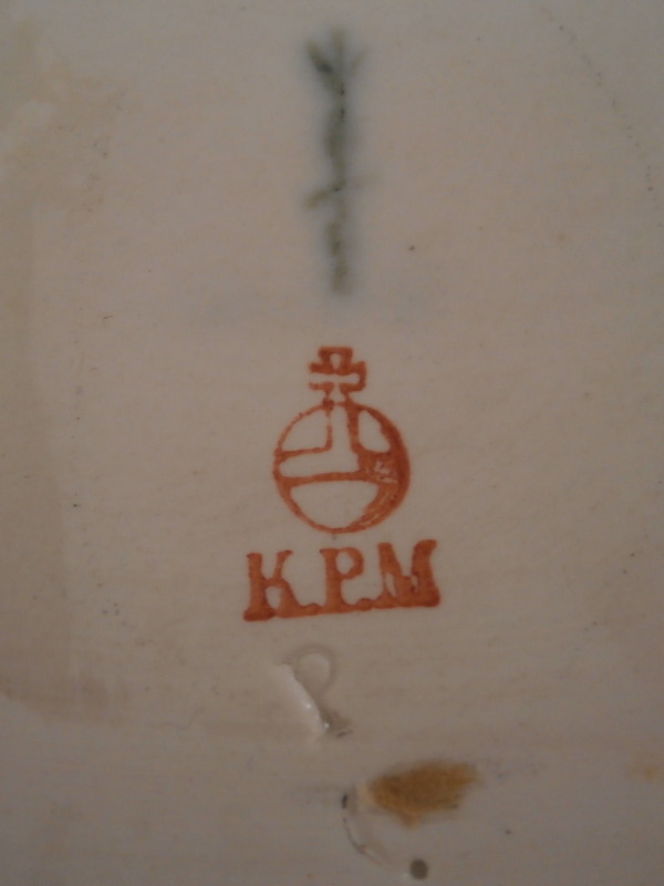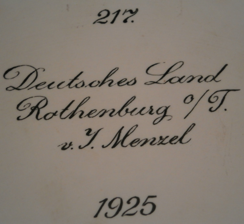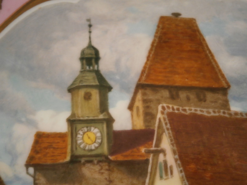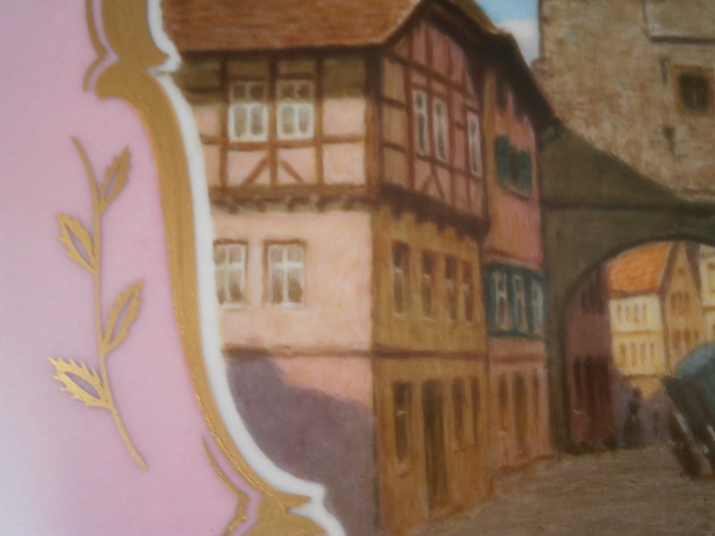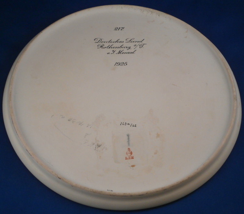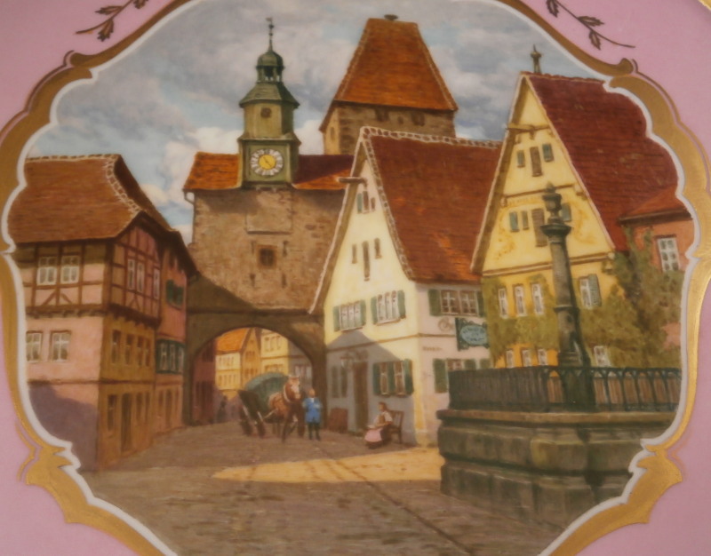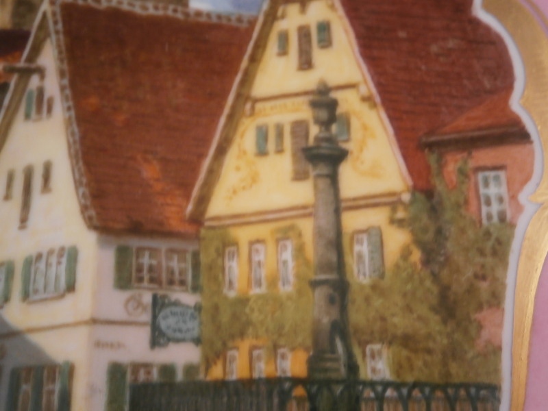 This is a cake plate or plaque made by KPM in 1925. I have seen this type of platter before designed by Theodor Schmuz-Baudiss but this one here is hand painted by my favorite KPM painter Julius Menzel in the typical Art Nouveau / Jugendstil style of the period. The piece has a pink ground color with a gold leaf design to it and some nice goldt rim to the rim but my favorite part is the central scene quite typical to Menzel - a small town scene including a bell tower, a few old style buidlings and a town square with possibly a fountain to the right side. A horse drawn cart and some people on the cobble stone road. The scene in from the town Rothenburg ob der Tauber which is still a very beautiful city that I have been to once or twice. The plate is marked underneath with the blue scepter, the red orb, the usual impressed marks, black numbers and a black painter's mark as well as the number 217. Deutsches Land Rothenburg o/T v. J. Menzel and 1925. About as well marked a piece of KPM as you will ever find and just a stunning example of this period and painter. The serving dish is 0.625 inches tall and 9.75 inches in diameter. In superb condition with some very very minimal wear to the gilding. Please email me for more information or other pictures.