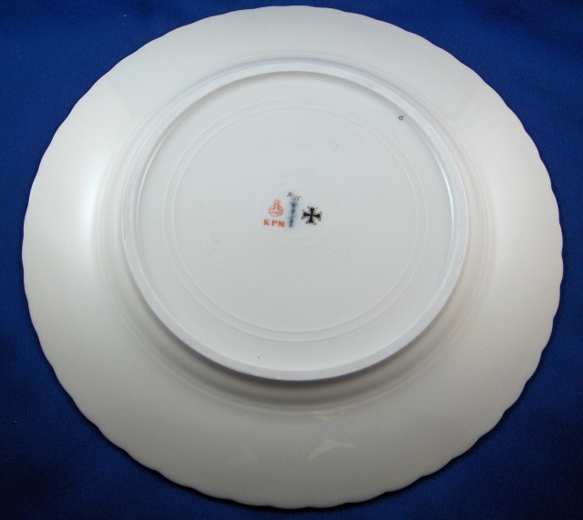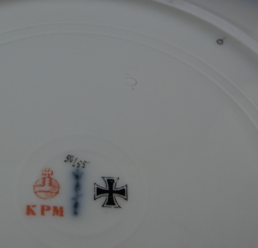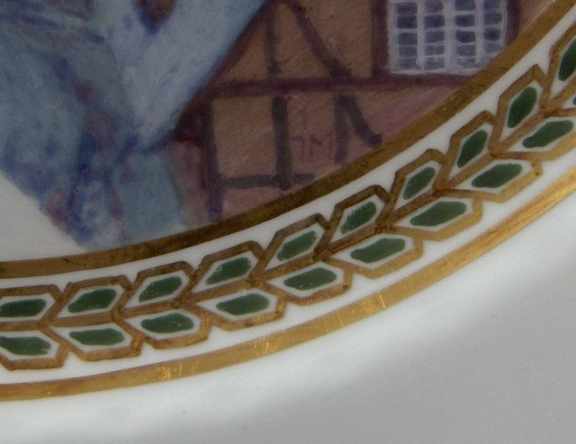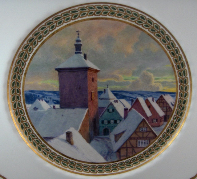 This is a plate made by KPM around 1915. It was handpainted by Julius Menzel in the Art Nouveau or Jugendstil style with a snowy winter scene as well as a green leaf and gold trim and a single gold line. The rim is nicely done as well not being the boring old kind. The plate is in perfect condition. It is almost 10 inches in diameter and marked underneath with the underglaze blue scepter, the red orb mark, the black iron cross of World War I, the number 50/55 in black, an artist mark of a circle with a line in black, the impressed letter O with two dots around it and another impressed mark that is hard to make out. Also the plate is artist signed with his initials in the bottom area of one of the houses on the front. Please email me for more information or other pictures.