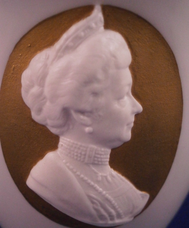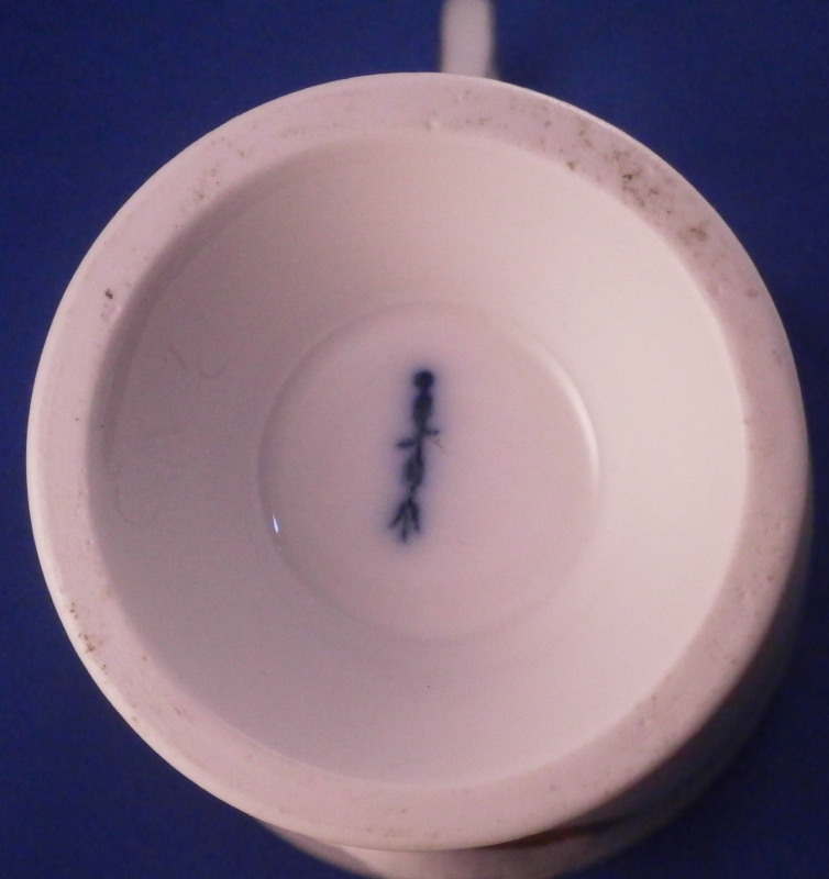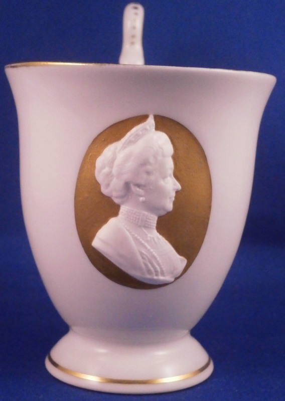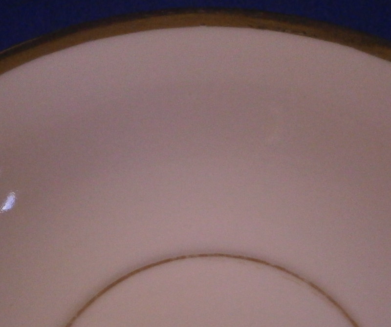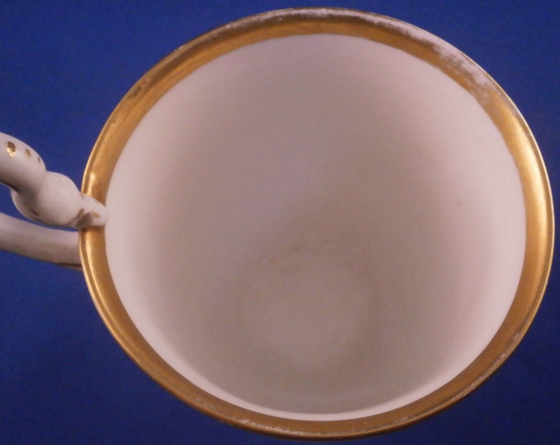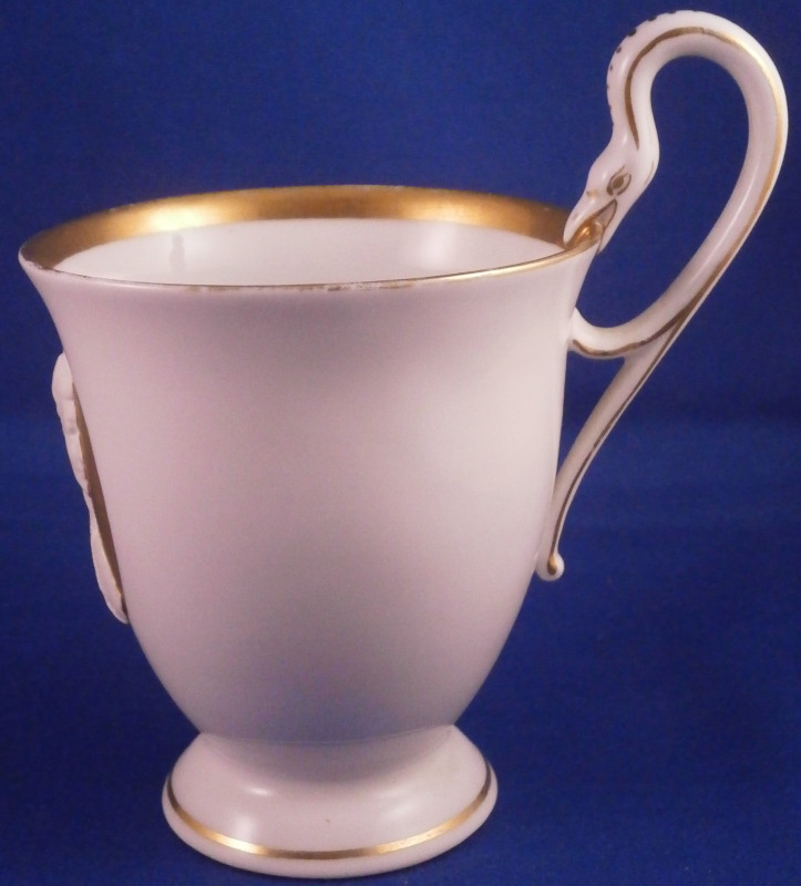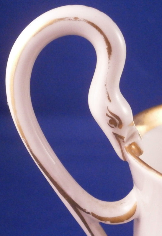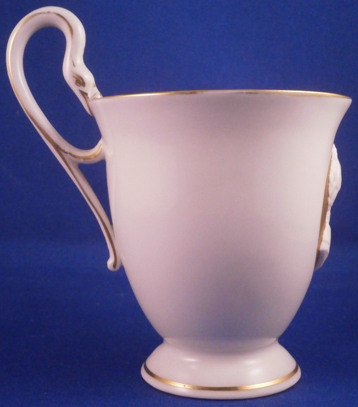 This is a nice cup and saucer made by KPM in the early 20th century around WWI. The cup has the relief portrait bust of Kaiserin ( Prussian Queen ) Augusta Victoria of Schleswig-Holstein the first wife of Kaiser Wilhelm II . She lived from 1858 until 1921. A hard to find set that has a snake shaped handle to the cup, gold trim to the handle as well as edges of the cup and saucer and gilding behind the portrait. A really nice looking set! The saucer is in superb condition with some minor wear to the gold trim around the well, the cup has wear to the inside gold trim and a chip to the edge of the snake right by where it meets the rim and a hairline going from there to the other side. The handle is perfectly stable since it still has two more attachment points and the chip is not obvious at all! The set displays very well. The saucer is 0.875 inches tall and has a diameter of 5.5 inches. The cup is 3.375 inches tall and has a diameter of 3 inches. The handle sticks up another 1.125 icnhes over the rim. Both pieces are is marked underneath with the under glaze blue scepter and the usual imrpessed numbers. The saucer also has an iron cross to it. Pieces that were just gilded and not painted were jsut starting to have the red orb mark around this period which explains why the saucer does not ahve one yet - it is first choice however. The cup has a faint cut aross the scepter and is thus a second choice piece. Both have the usual impressed marks common to these pieces during this period. Please email me for more information or other pictures.
