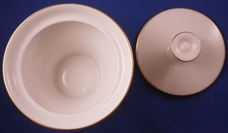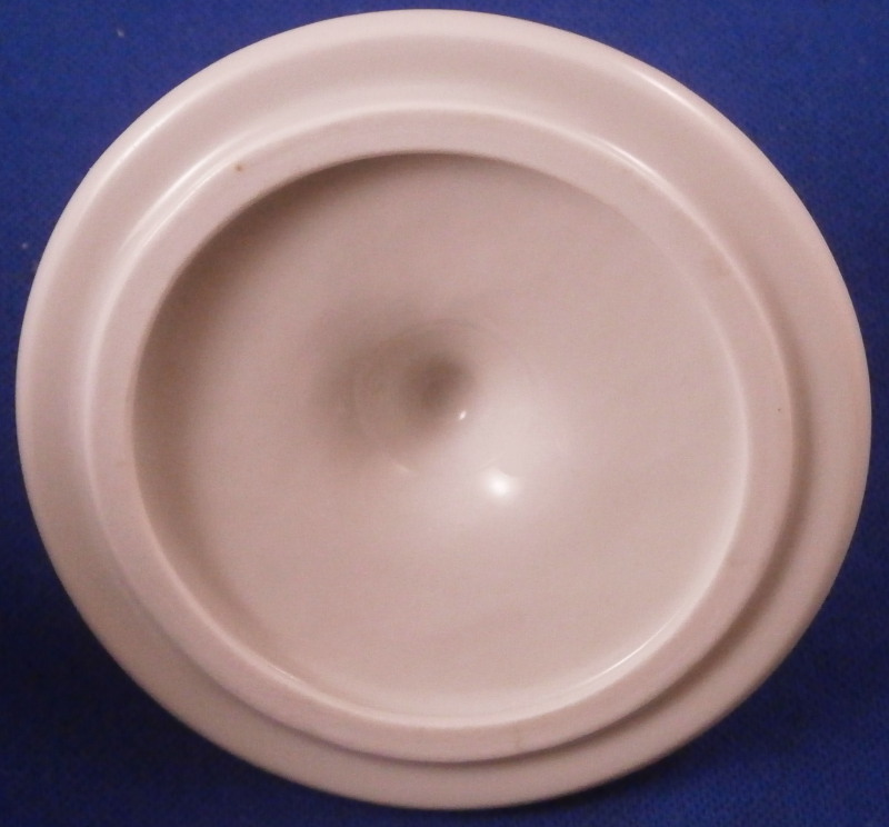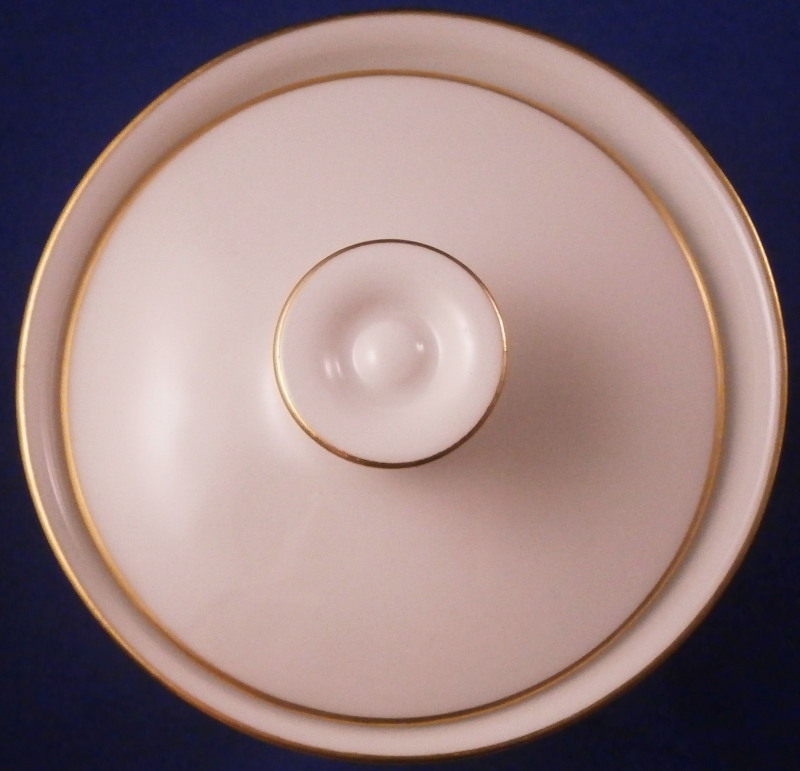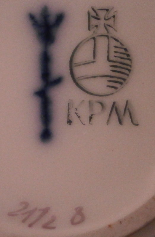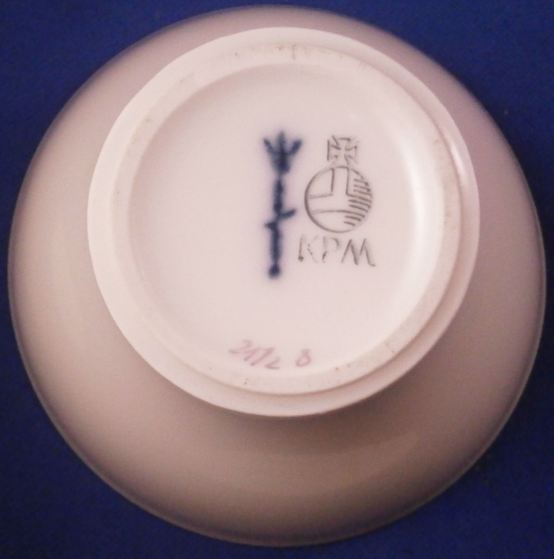 This is a nice mocha / espresso sugar dish with its lid made by KPM in the mid 20th century. It is called the Krokus design which has a superb shape that is very elegant! This service was first designed by Hubert Griemert in the middle of the 20th century. This sugar pot was made around this time period since it is slightly ivory colored instead of bright white. It has a gold trim to the edges and the finial edge. Both pieces are in perfect condition! Themain body is marked underneath with the under glaze blue scepter, the green orb mark for the gilding as well as some black letters and numbers as shown. The pot with the lid in place is about 3 inches tall and has a diameter of 3.125 inches. Please email me for more information or other pictures.