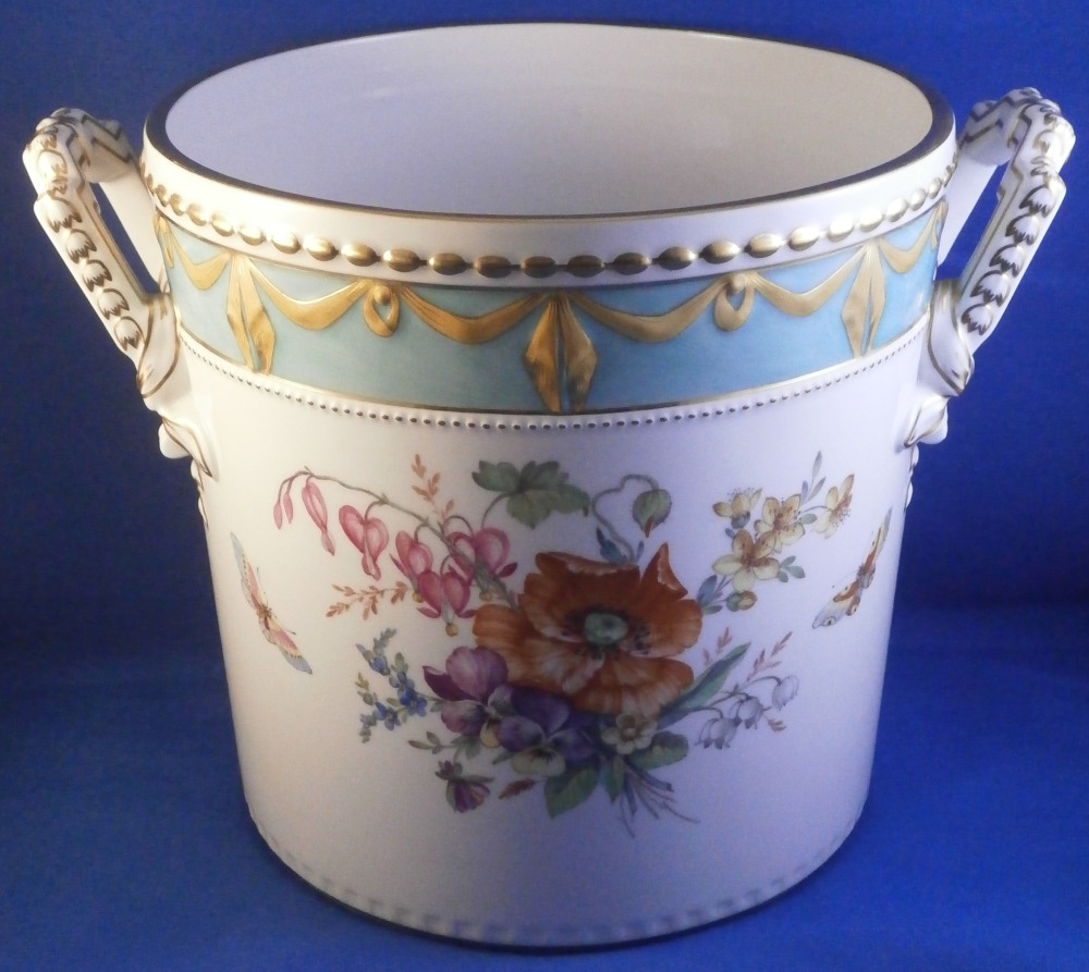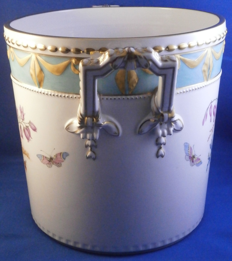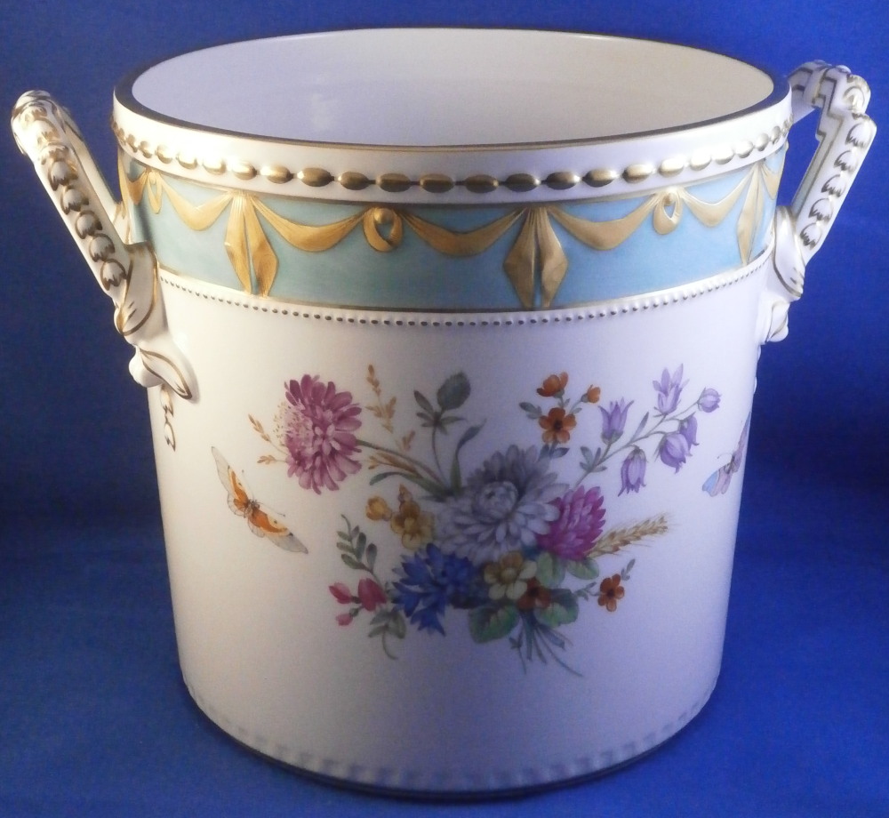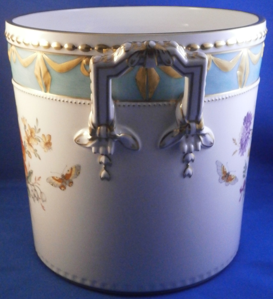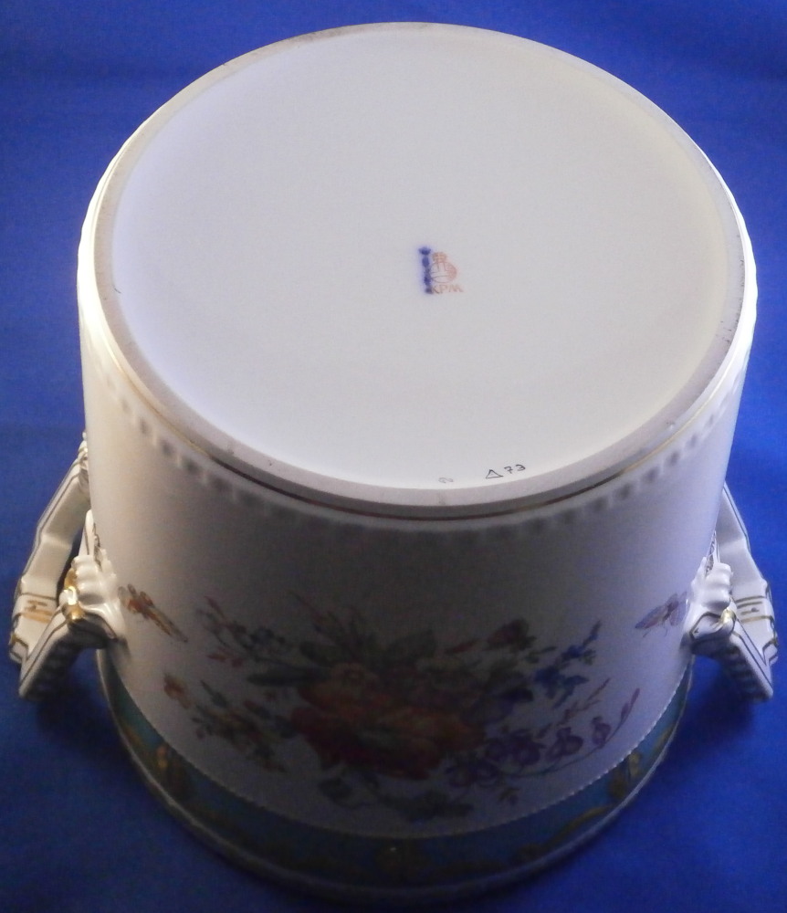 This is a very hard to find and truly superb piece from the Kurland service in the decoration 73 made by KPM in the 20th century. The Kurland pattern is always nice but the decor 73 is their top of the line and extra nice. It is one of my favorite patterns and looks very stunning when in use or on display. Hard to get these unusual dishes on the open market. The ice pail / fruit cooler was originally used to cool fruit with ice being added to the top of the lid and to the inside with a third bowl like pieces holding the fruit. On modern pieces this central bowl does not exist anymore. It is used more as an ice pail for a bottle of champagne and the lid as decoration when put on display. The main body is hand painted with a superb and large floral arrangement to the front and back with a butterfly to each side of each arrangement. There is a handpe to eack side that is very detailed and highlighted with gilding. The top edge as well as the lid edge have the tell tale turquoise ground trim color to it with the relief design fully gilded with some tooled details to it. A handle is sticking out from the center of the lid with some nice relief details to it and gold highlights. The inside of the top of the lid has four more butterflies painted on it. A truly stunning looking piece! The lidded cooler is in perfect condition. It measures about 10.625 inches tall and 7.375 inches in diameter. The handles stick out about 1.125 inches on either side. It is marked underneath with the under glaze blue scepter, the red orb as well as some black artist mark and decor number 73 as shown. Please email me for more information or other pictures.