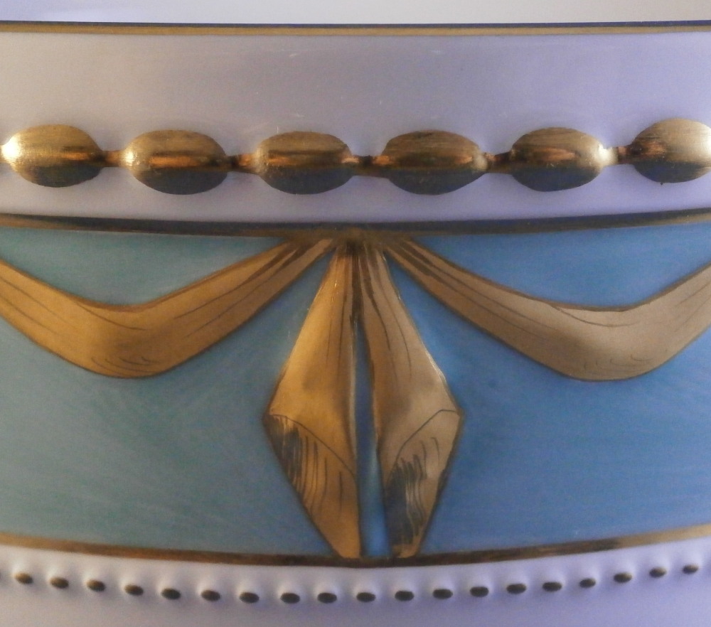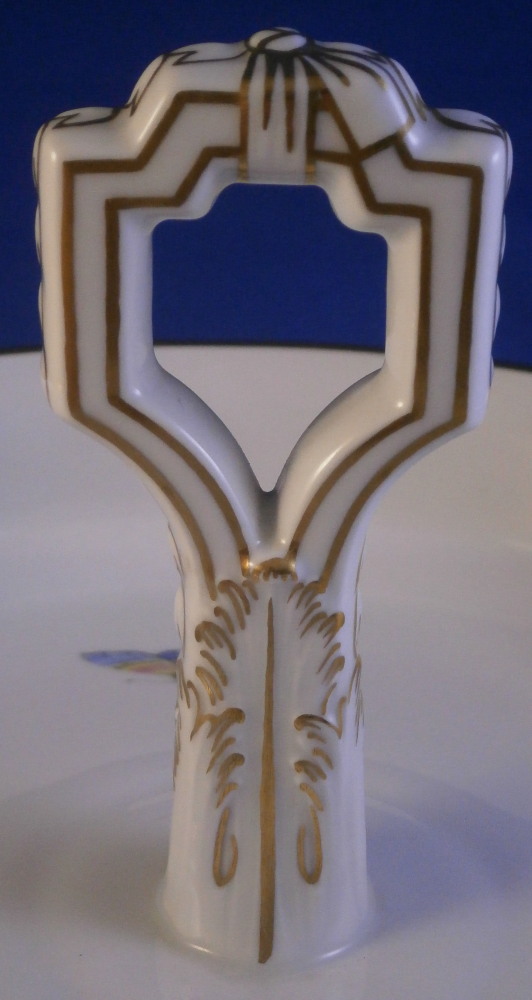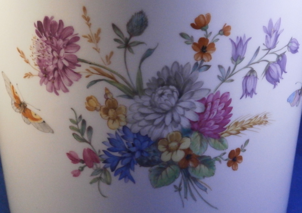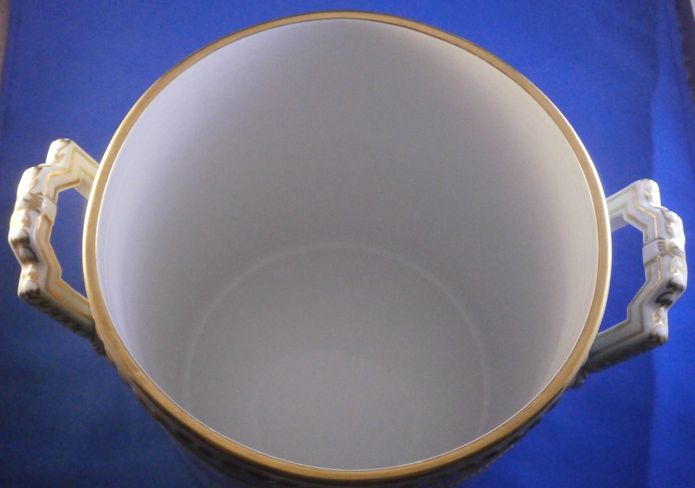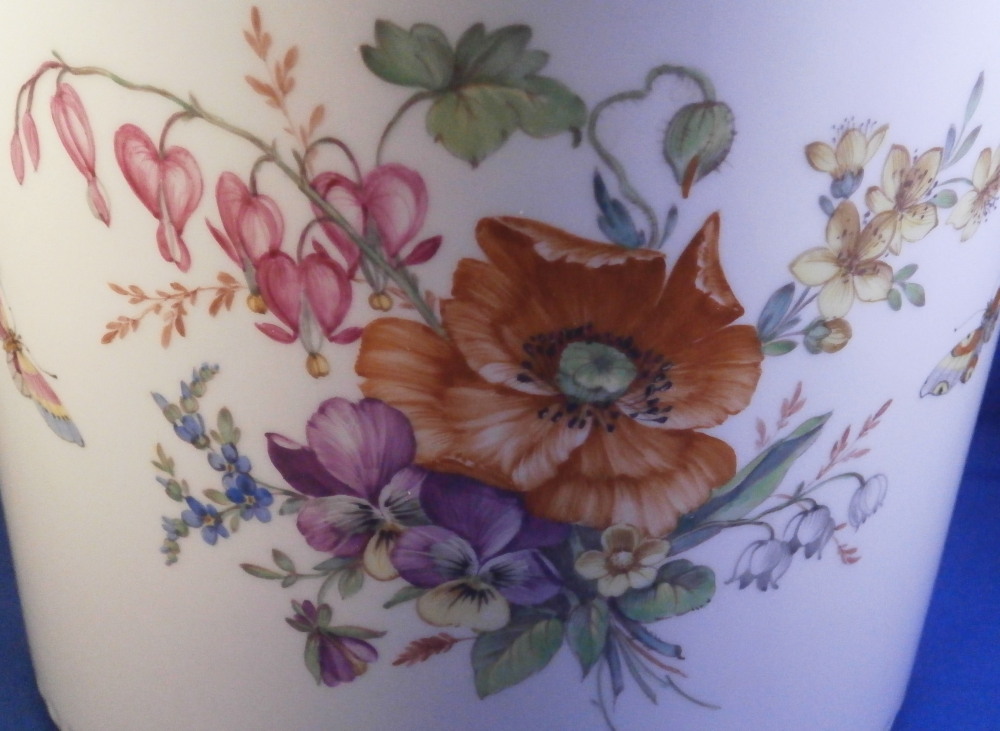 This is a very hard to find and truly superb piece from the Kurland service in the decoration 73 made by KPM in the 20th century. The Kurland pattern is always nice but the decor 73 is their top of the line and extra nice. It is one of my favorite patterns and looks very stunning when in use or on display. Hard to get these unusual dishes on the open market. The ice pail / fruit cooler was originally used to cool fruit with ice being added to the top of the lid and to the inside with a third bowl like pieces holding the fruit. On modern pieces this central bowl does not exist anymore. It is used more as an ice pail for a bottle of champagne and the lid as decoration when put on display. The main body is hand painted with a superb and large floral arrangement to the front and back with a butterfly to each side of each arrangement. There is a handpe to eack side that is very detailed and highlighted with gilding. The top edge as well as the lid edge have the tell tale turquoise ground trim color to it with the relief design fully gilded with some tooled details to it. A handle is sticking out from the center of the lid with some nice relief details to it and gold highlights. The inside of the top of the lid has four more butterflies painted on it. A truly stunning looking piece! The lidded cooler is in perfect condition. It measures about 10.625 inches tall and 7.375 inches in diameter. The handles stick out about 1.125 inches on either side. It is marked underneath with the under glaze blue scepter, the red orb as well as some black artist mark and decor number 73 as shown. Please email me for more information or other pictures.