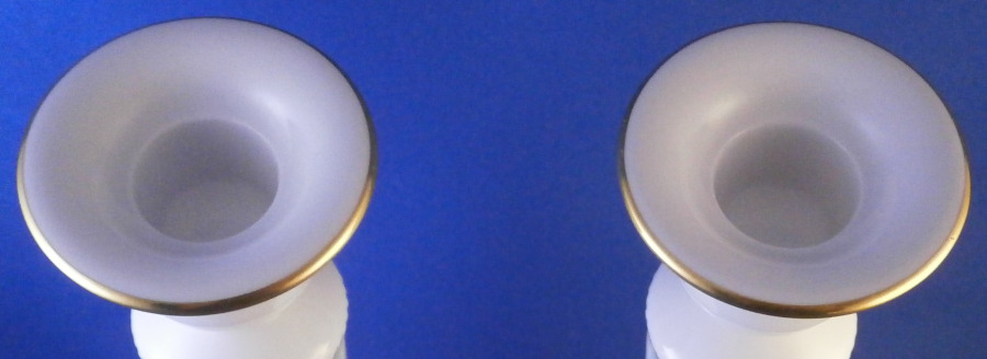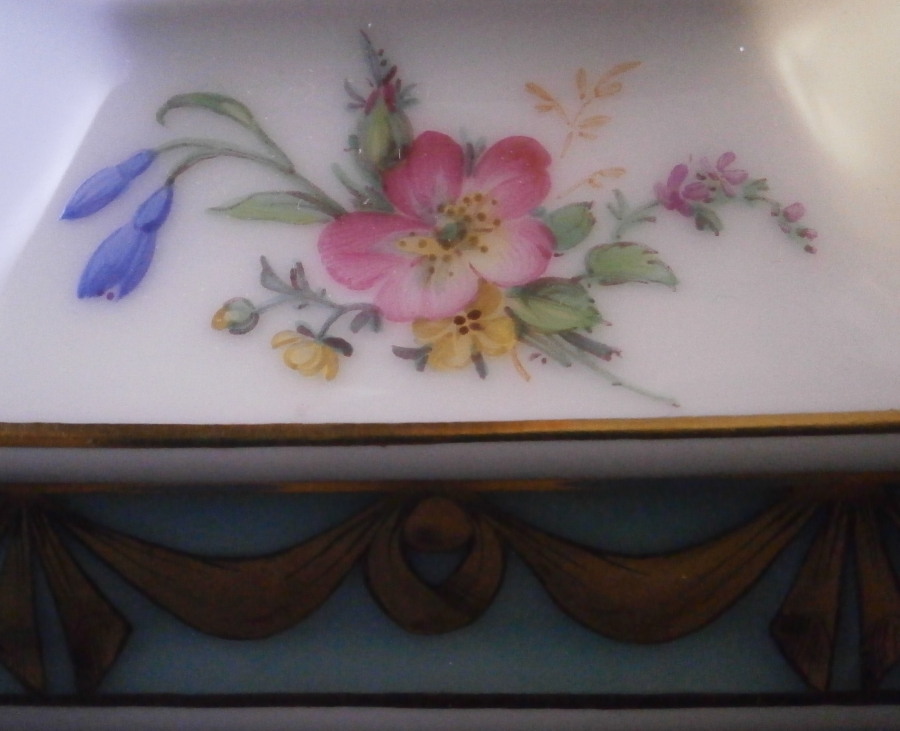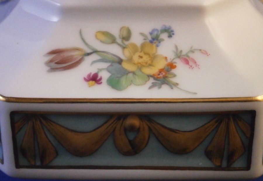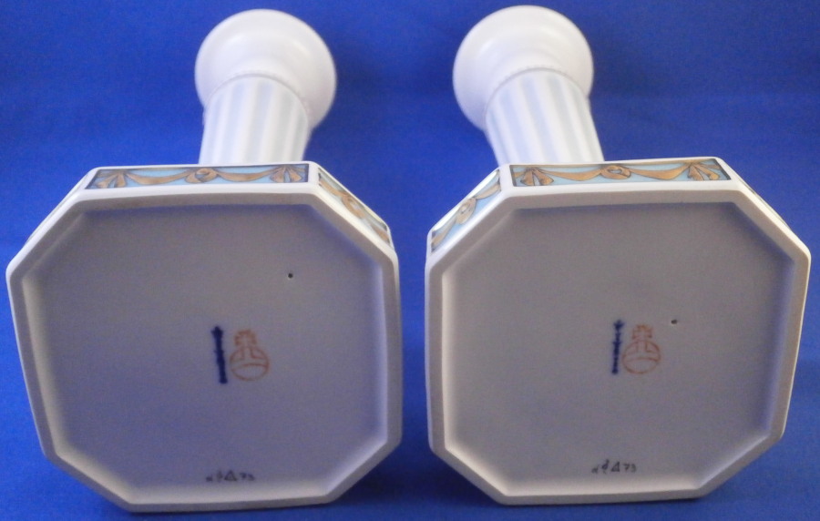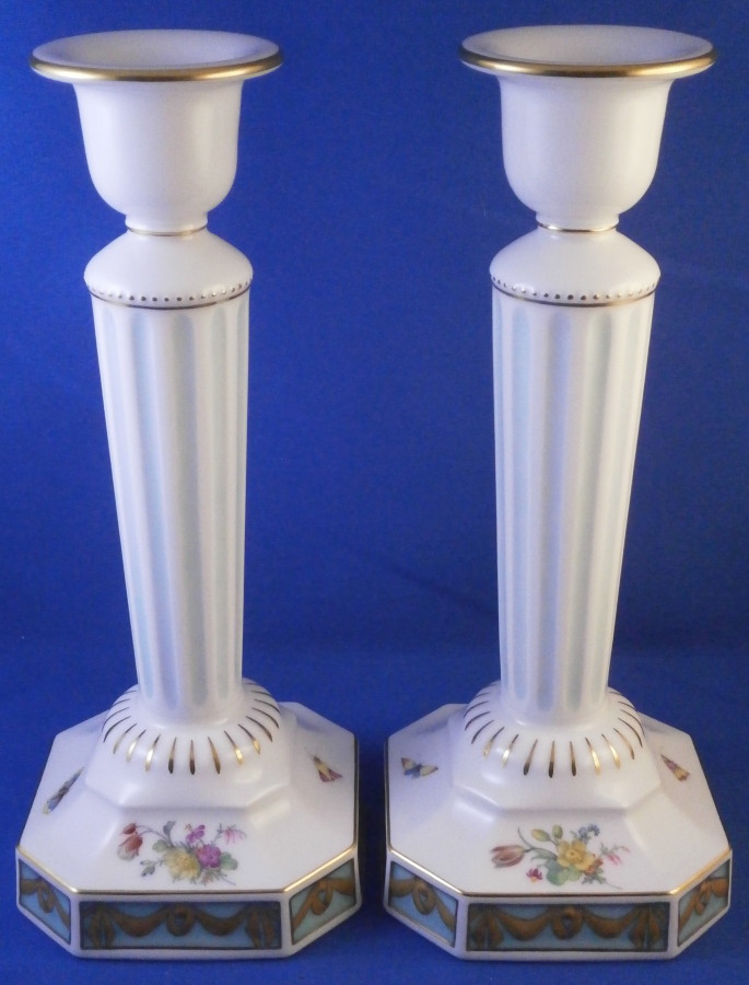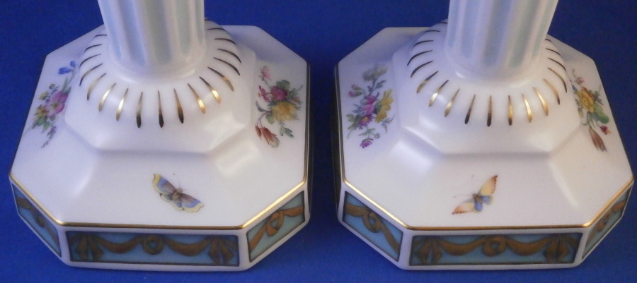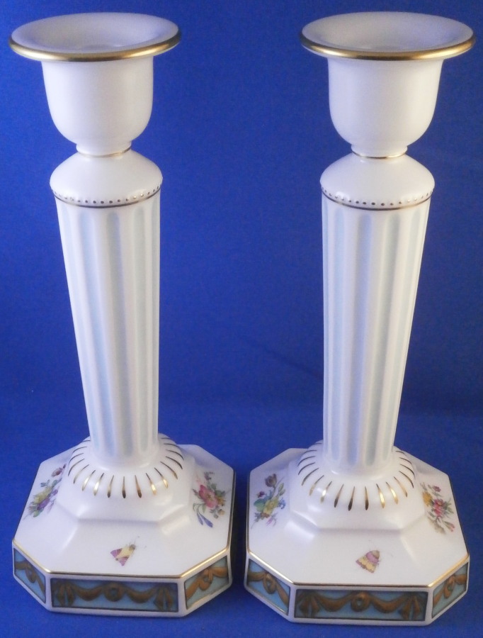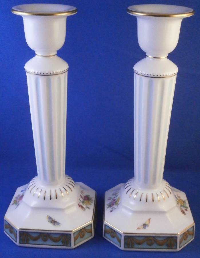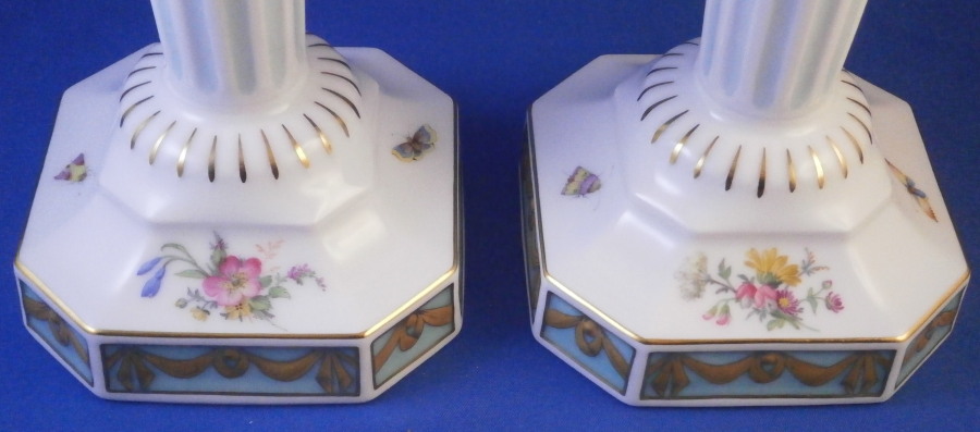 This is a rare pair of cnadlesticks from the famous Kurland service made by KPM in the late 20th century. This is one of the best and most popular services of the 20th century and a personal favorite of mine. The pair is decorated in the Decor 73 with the turquoise ground color under the golden garlands all around the base. Each has a floral arrangement to the top of the base on two sides and a bug / butterfly on the two others. The column has alternating white and turquoise colored sections and there is a bit of gold trim to the edges as well. Really a stunning pair of candleholders and not one you see often at all. The set is in perfect condition. They are just under 8.5 inches tall and about 3.5 inches at the widest part of the base. Each is marked underneath with the under glaze blue scepter, the red orb as well as the usual artist marks of the period. Please email me for more information or other pictures.