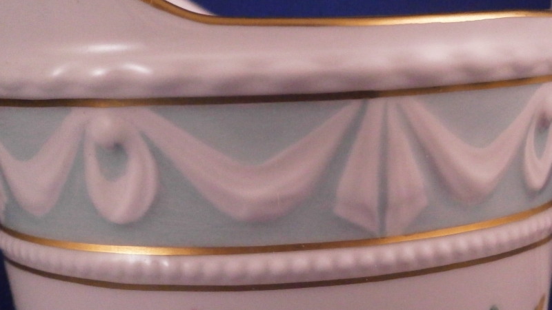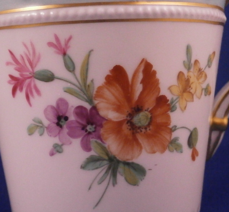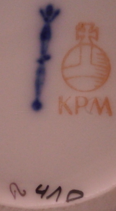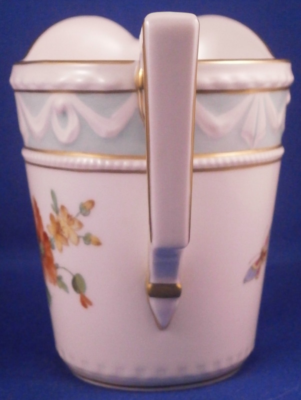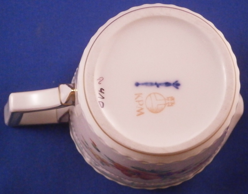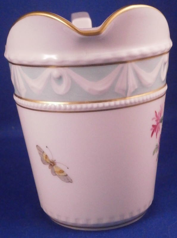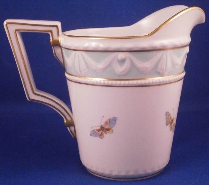 This is a creamer in the Kurland pattern , Decor 41 made by KPM in the 20th century. It is one of my favorite patterns and looks very stunning when in use or on display. Luckily I just bought a whole load of different pieces from this service! Decor 41 is also one of the most expensive versions of Kurland with the greenish / turquoise & gold trim with the flowers. I believe this is one of the best designs ever for a service. The creamer is decorated with a hand painted large floral arrangement as well as some butterflies and off course the raised white swags on turquoise ground and gold trim. Typical handle shape which is one of my favorites and has its origins in the late 18th century. The creamer is in perfect condition and marked underneath with the under glaze blue scepter as well as the red orb and some other marks from this period as shown. The piece is 3.875 inches tall, 2.875 inches deep and 4.625 inches wide including the spout and handle. Please email me for more information or other pictures.