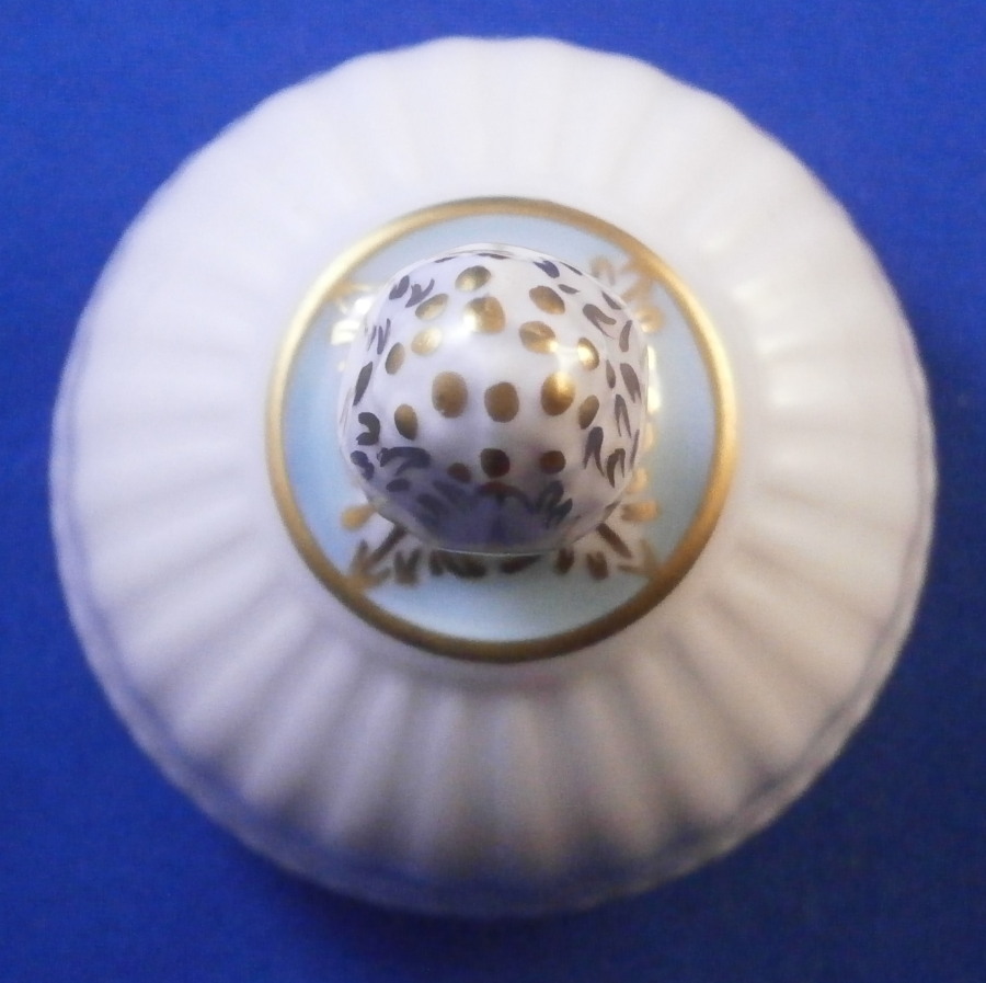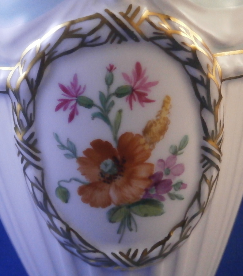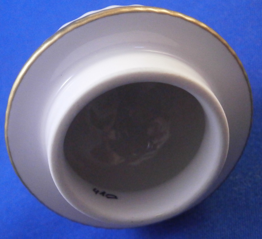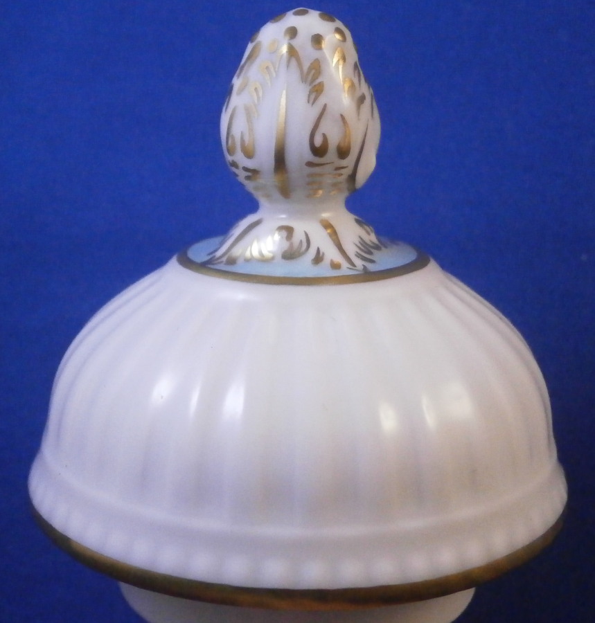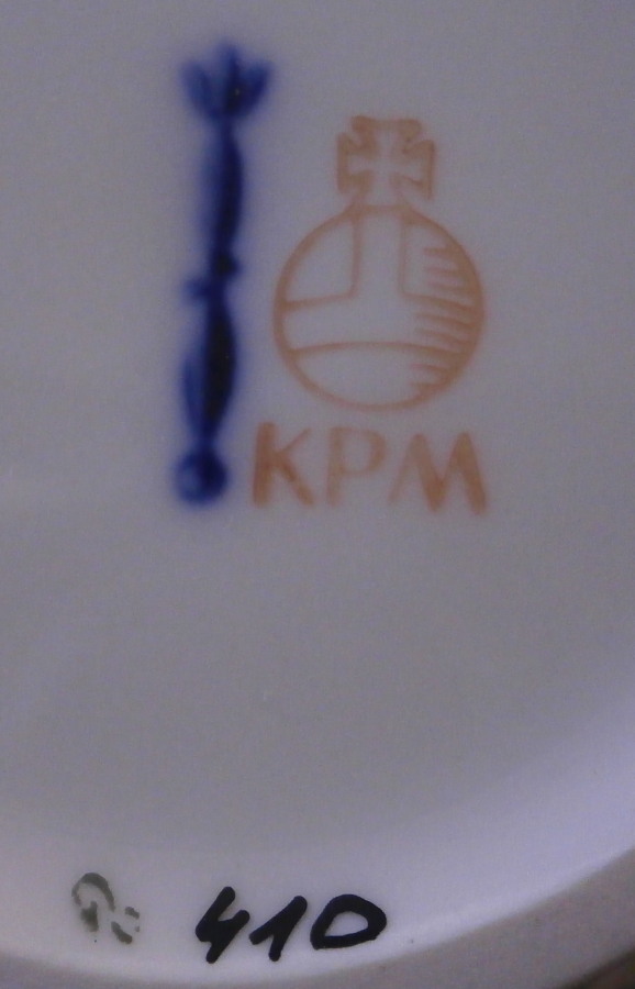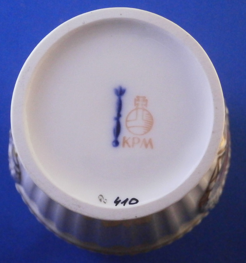 This is a te acaddy / jar in the Kurland pattern , Decor 41 made by KPM in the 20th century. It is one of my favorite patterns and looks very stunning when in use or on display. Luckily I just bought a whole load of different pieces from this service! Decor 41 is also one of the most expensive versions of Kurland with the greenish / turquoise & gold trim with the flowers. I believe this is one of the best designs ever for a service. The caddy is decorated with a hand painted large floral arrangement to the front and back surrounded by a relief wreath highlighted with gilding and off course the raised white swags on turquoise ground and gold trim. Nice finial to the lid. The piece is in perfect condition and marked underneath with the under glaze blue scepter as well as the red orb and some other marks from this period as shown. The jar with its lid in place is 6.5 inches tal and 3.25 inches in diameter. Please email me for more information or other pictures.