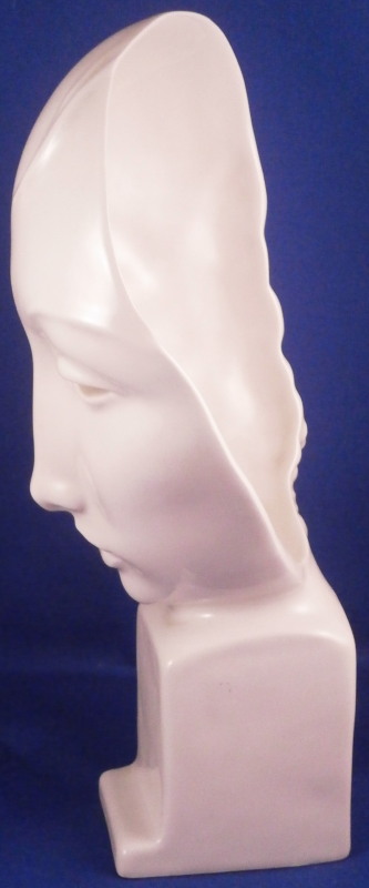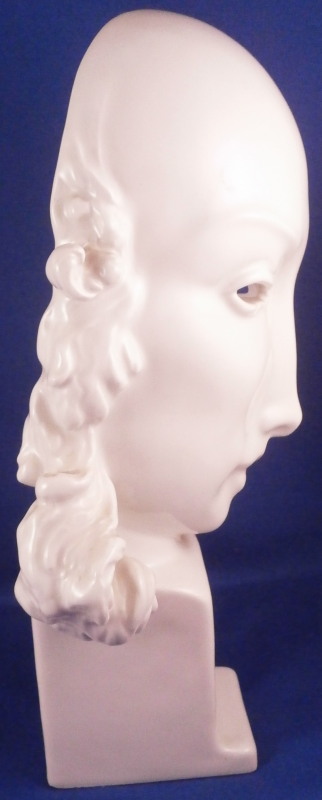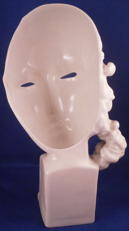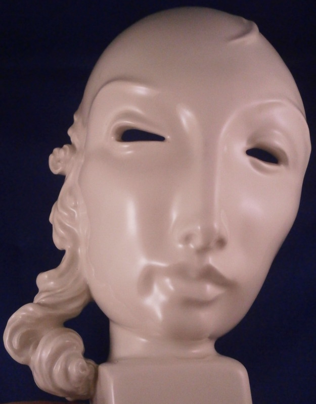 This is a superb mask made by KPM in 1937 if I read that date code correctly. So right around when it was first designed in 1930 by Hermann Hubatsch who is quite the famous guy in porcelain circles! The bust is of a lady's face designed as a mask with a very modern feel to it standing on a simple base that is signed in the back Hubatsch 1930. The piece is in perfect condition! I always wanted to have this piece as it is just superb! Marked underneath with the under glaze blue scepter mark as well as the usual impressed marks of this period! The piece is 8.75 inches tall and 5 inches wide with a depth of about 3.375 inches. Please email me for more information or other pictures.
