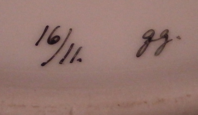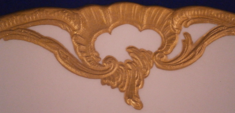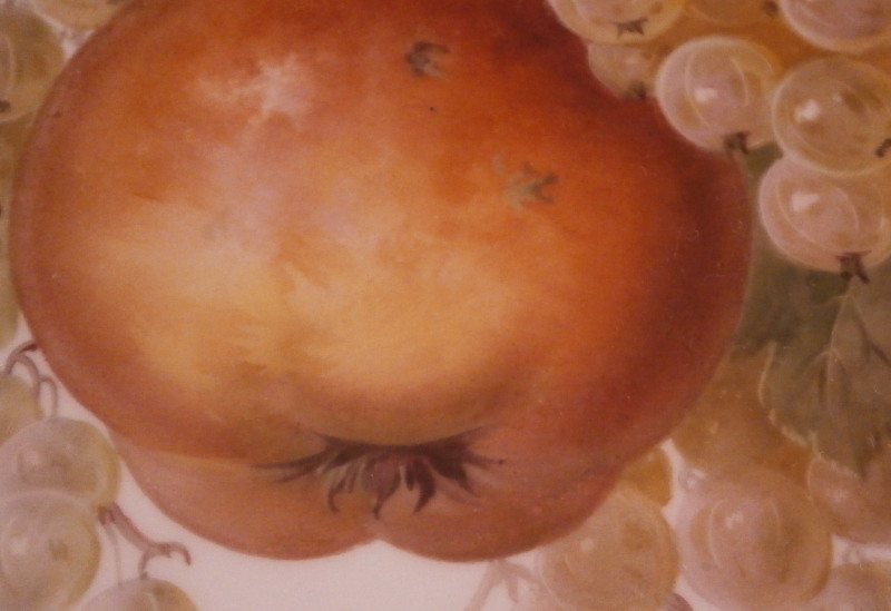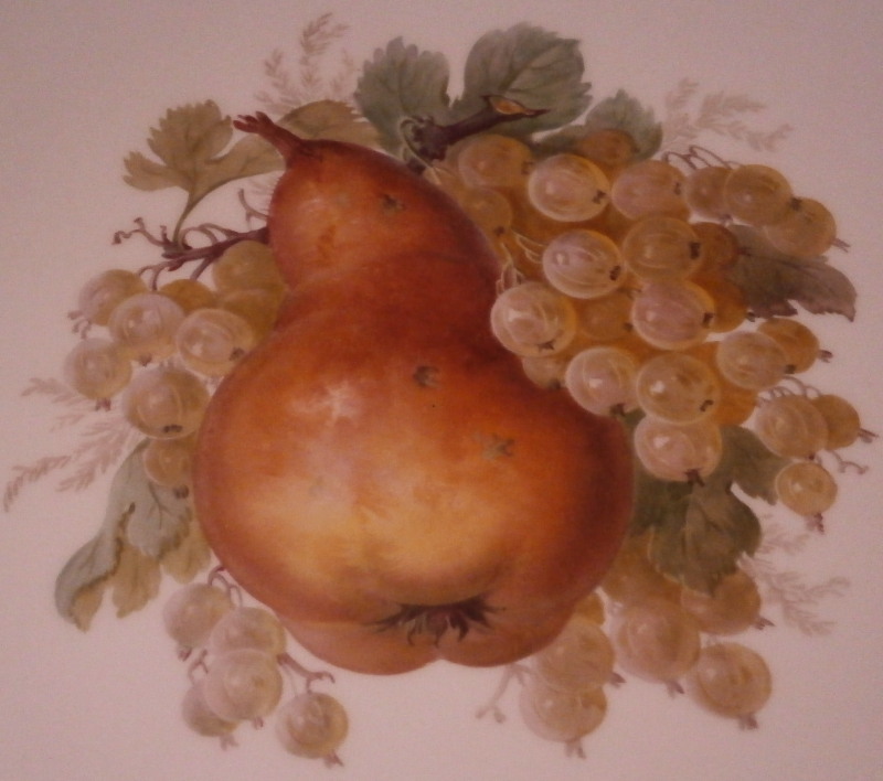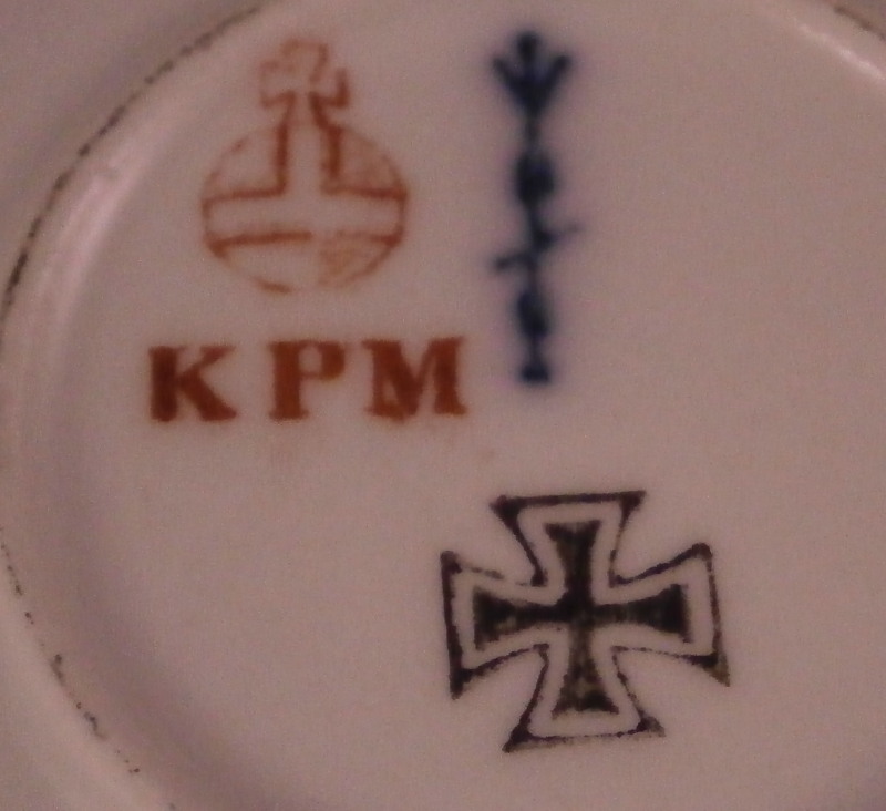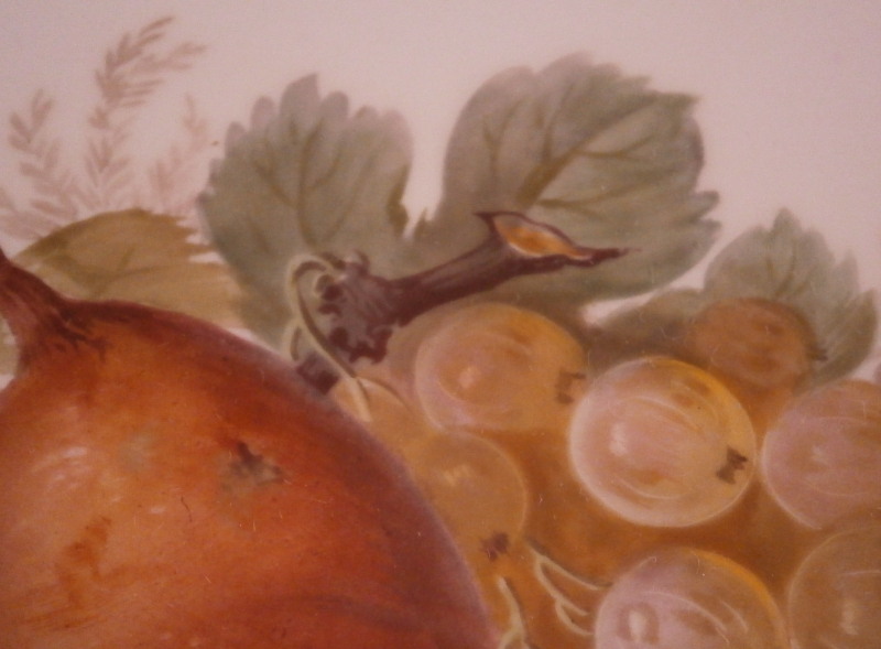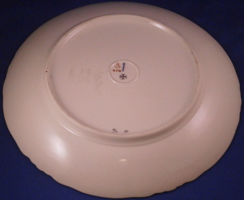 This is a rare Neuzierat dinner plate made by KPM in during WWI. It is hand painted with a superb fruit still life scene in the center including some white currants and a pear along with some leaves that is just amazingly detailed! The rim itself is painted with gold on a raised design. A stunning plate that is very elegant and fun to look at! The plate is in perfect condition. It is the super rare dinner plate size which is very very hard to find unlike the smaller versions of this design! The piece is 11 inches in diameter and 1.25 inches tall. The plate is marked underneath with the underglaze blue scepter, the red orb mark, the black iron cross, some black numbers and letters, a black painter's mark and the usual impressed marks of this period. Please email me for more information or other pictures.