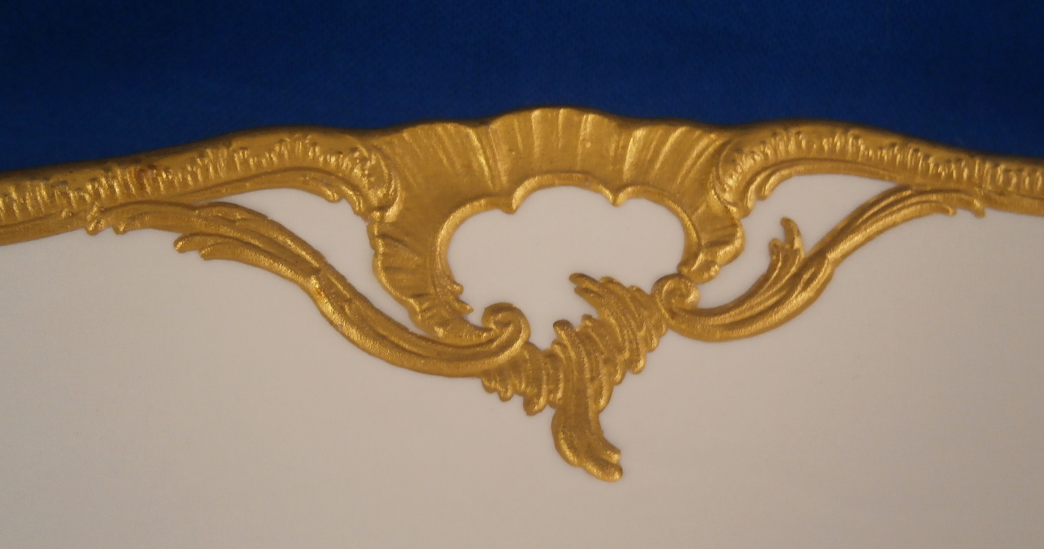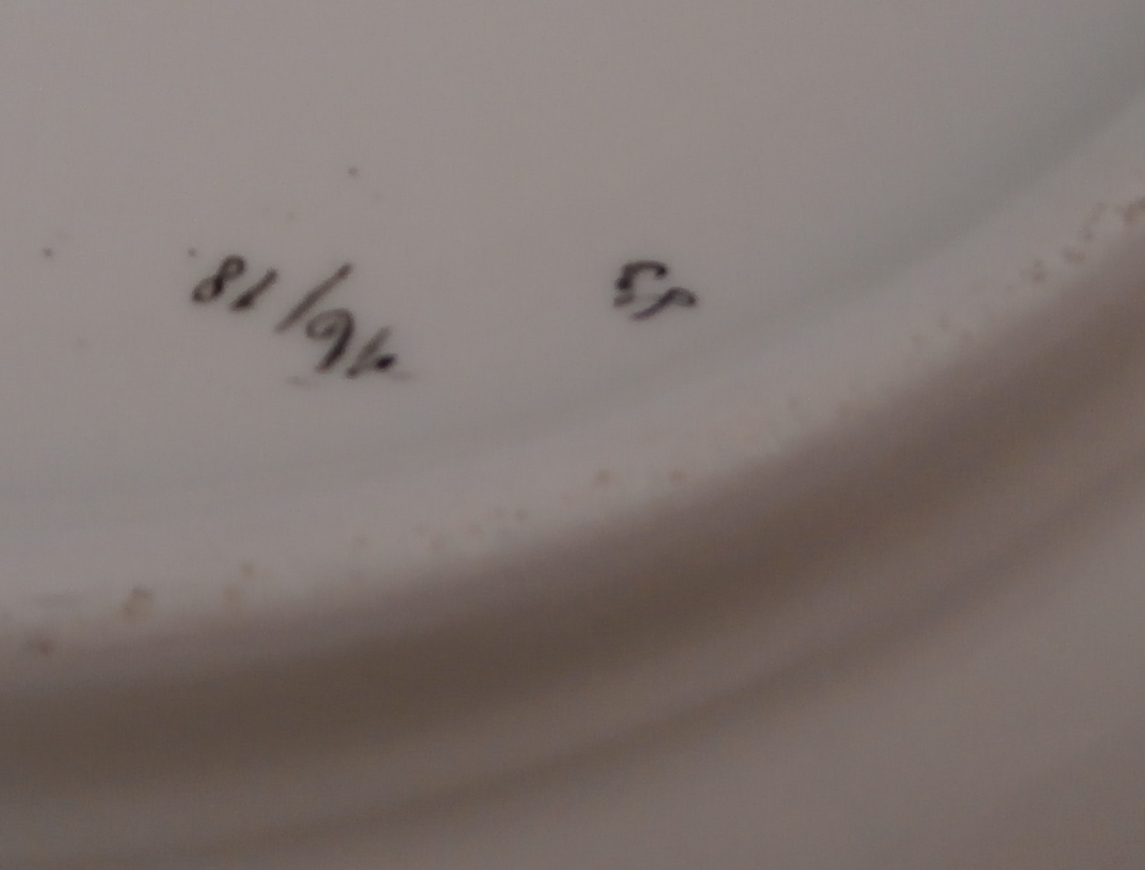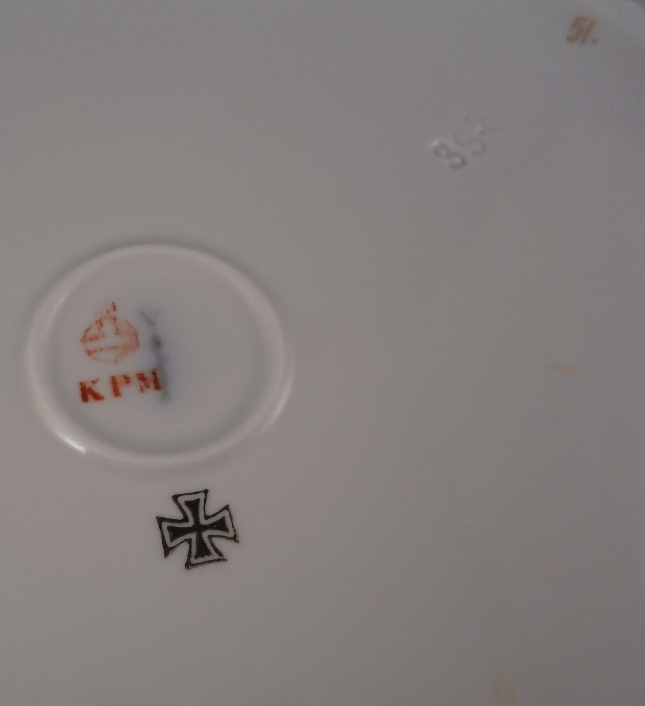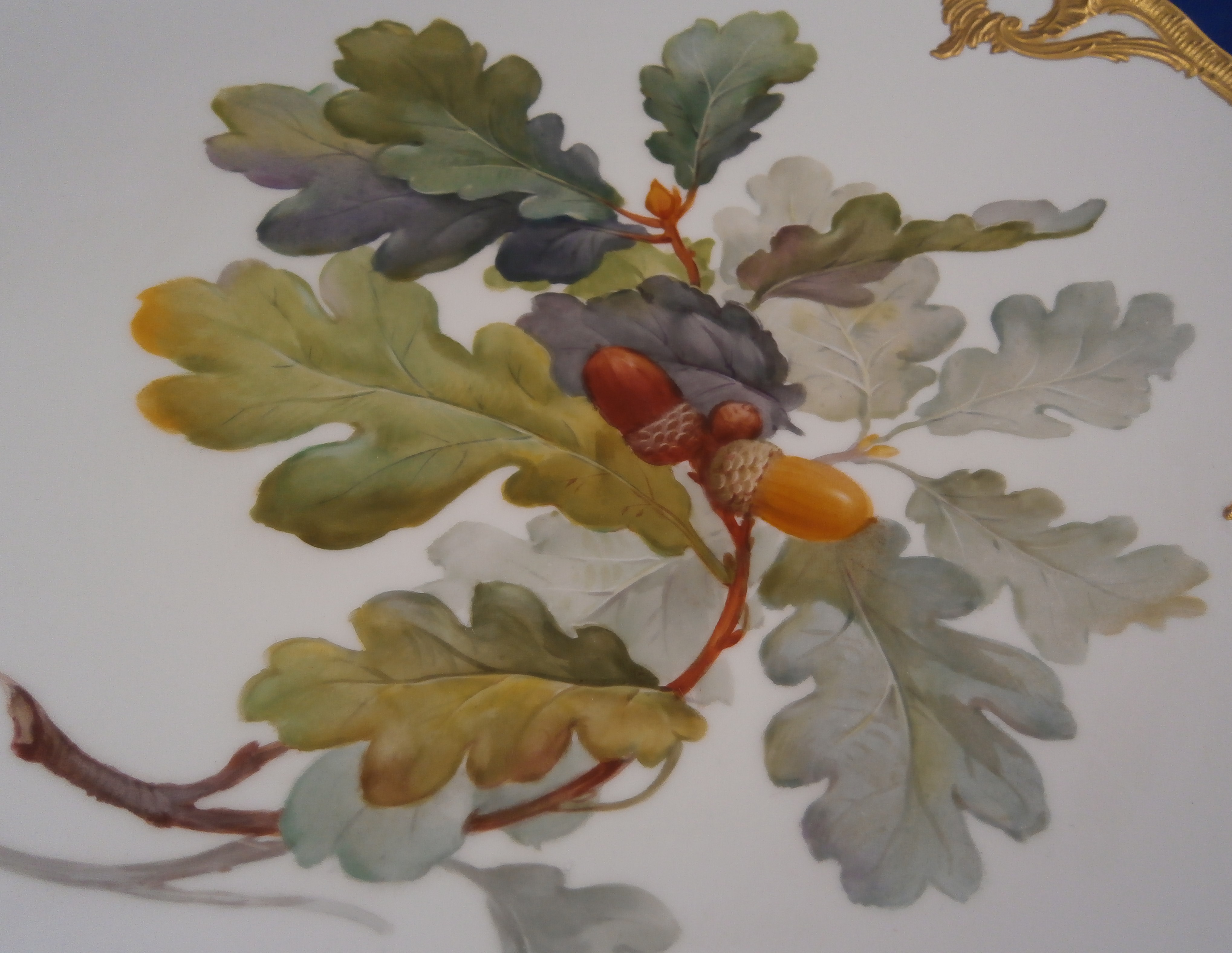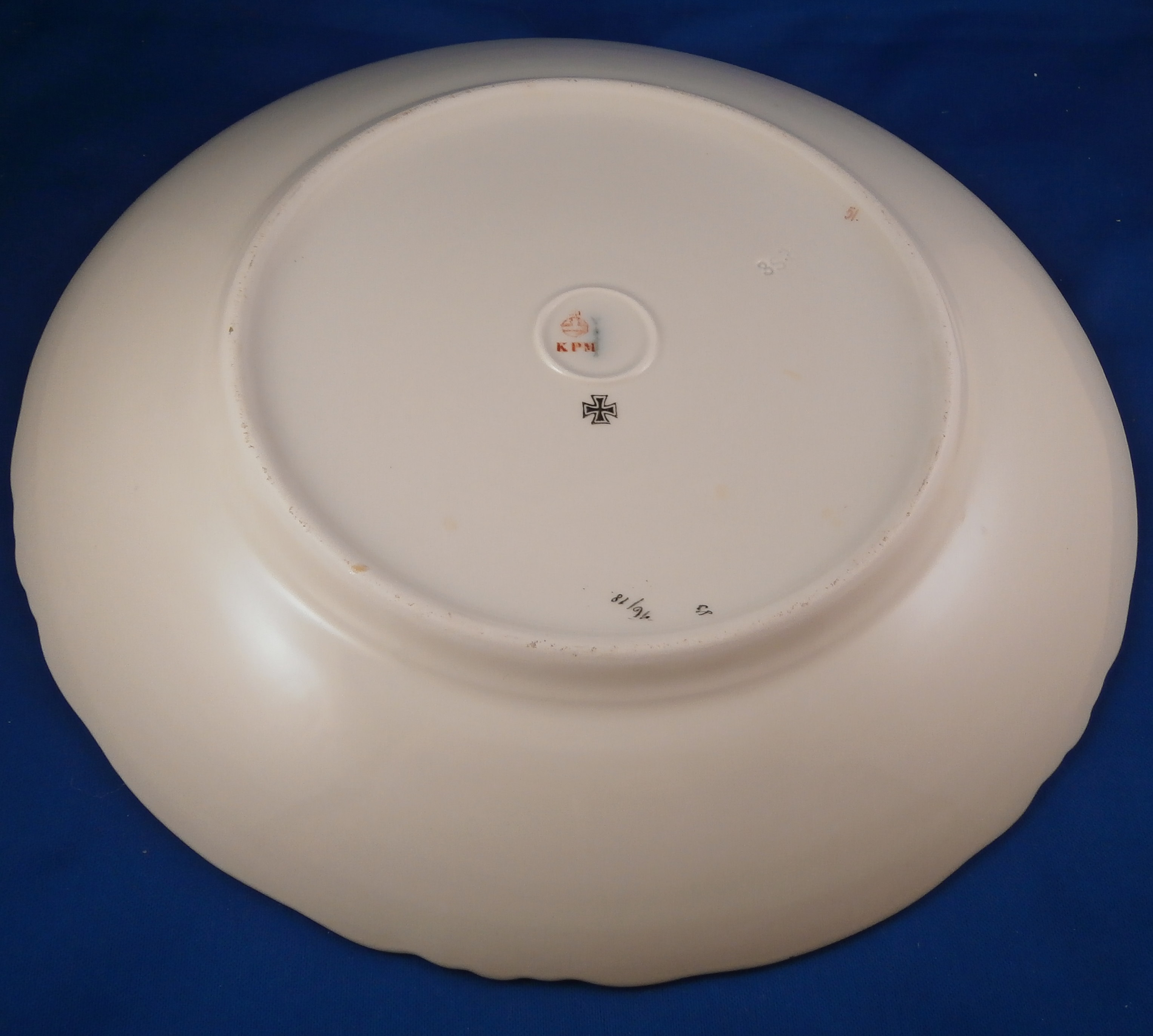This is a plate made by KPM in during WWI. It is handpainted with the rarest design on these plates of this style - the tree branch / leaf motif. This one is of branch of an oak tree with the branch, the leaves and the seeds shown. Kind of the German version of the Flora Danica :) Just an amazingly detailed painting. The rim itself is painted with gold on a raised design. The plate is in perfect condition. It is the super rare dinner plate size which is very very hard to find! 11.125 inches in diameter and 1.375 inches tall. The plate is marked underneath with the underglaze blue scepter, the red orb mark, the black iron cross, some black numbers, a gold painter's mark and the usual impressed marks of this period. Please email me for more information or other pictures.