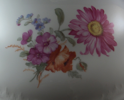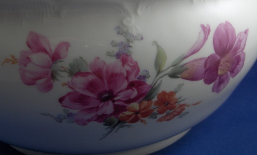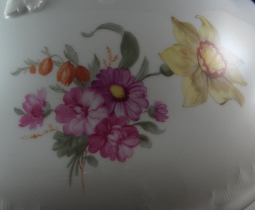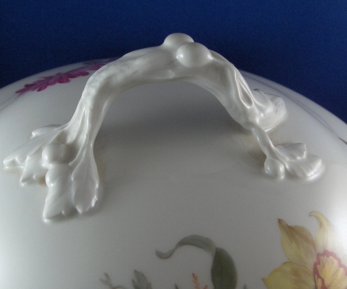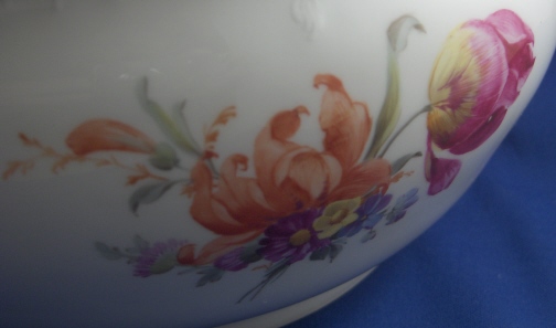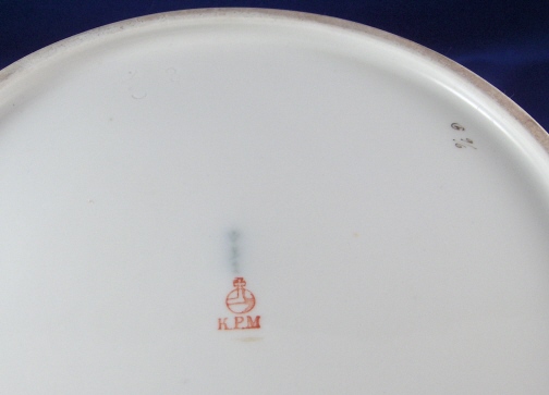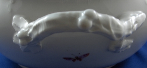 This is a lidded tureen made by KPM in the beginning of the 20th century. It is handpainted with two large flower arrangements on the lid as well as the main body. These are superbly done to say the least. Nice relief trim to the rim areas as well as branch, leaf and berry handles. Marked underneath with the underglaze blue scepter mark as well as the overglaze red KPM orb mark showing it was painted by KPM. There is an incised line underneath the red orb mark which I read somewhere represented painting by a not yet fully trained new painter! The piece including lid is about 9 inches tall and 9.5 inches in diameter. The tureen as well as the lid are in perfect condition. Please email me for more information or other pictures.