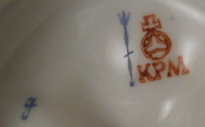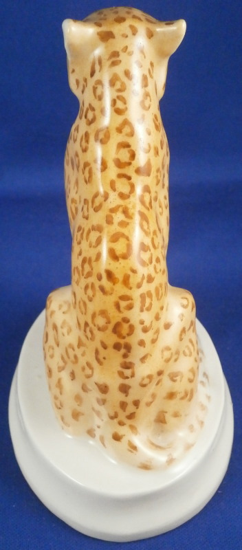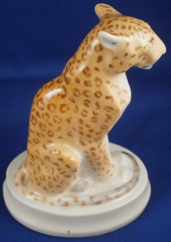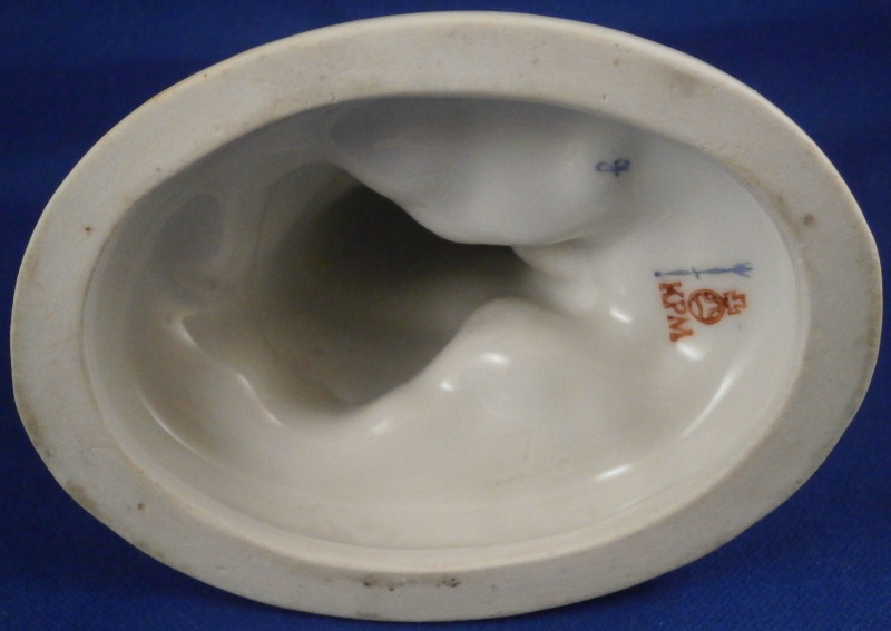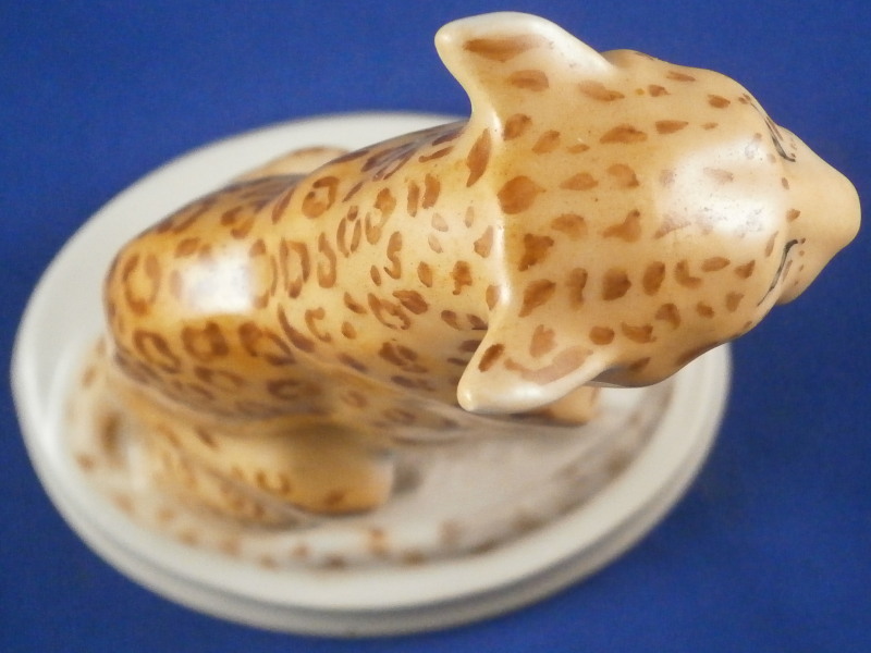 This is a rare figurine of one of the great cats made by KPM in the 20th century. It looks to be in the same style as the pieces from the early 20th century in the Art Nouveau period but I am not quite sure from when this piece is. It is of a leopard that is sitting on a oval base. Superbly modeled and hand painted with piercing green eyes - just fantastic! I have been trying to find out more about it but have not been able to find another one at all. So definitely not something you will come across often. The figure is in great condition with some manufacturing flaws but it is still a first choice piece which is a bit odd. The only flaw that really is visible when on display is a firing flaw to the side of the base where an impurity burned out and left a black hole. Otherwise the piece is superb! The figurine is about 4.5 inches tall, 2.5 inches wide and 3.5 inches deep. It is marked underneath with the underglaze blue scepter, their red orb, a painter's mark as well as an unusual impressed mark which I cannot make out - looks a bit like a Roman numeral V with a name in script under it but it is impossible to see properly. Please email me for more information or other pictures.