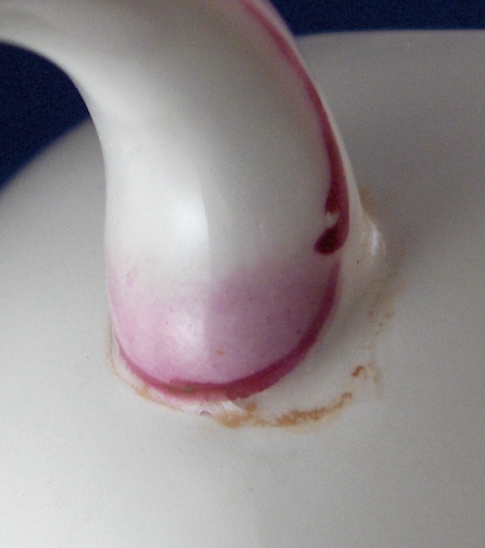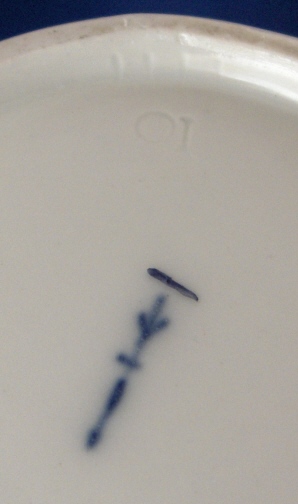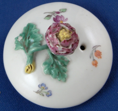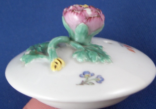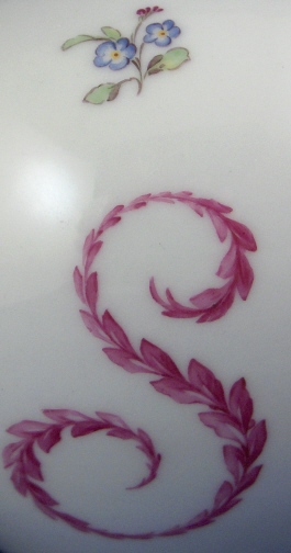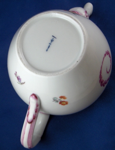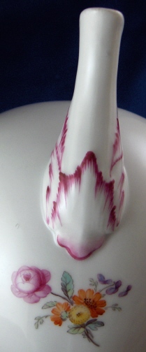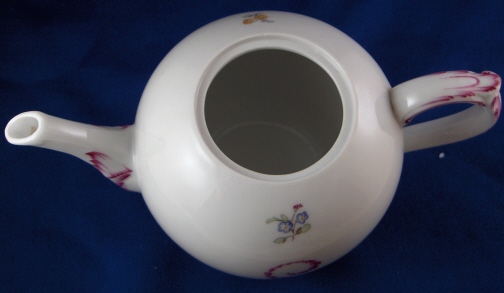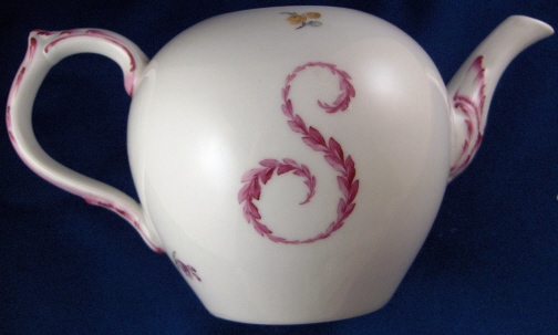 This is a teapot made by KPM in the late 18th century. KPM used no painters mark like the red orb yet during this period thus you only have the blue scepter and impressed marks most of the time. It is handpainted with the letter S made up of puce leaves on both sides as well as some small polychrome flowers and puce trim to the spout and handle. Nice floral finial to the lid. The pot is in great condition with some damage to the floral finial (stem was reattached, small chipping to petals of the finial and a flake to the green of one leaf), and a tiny chip to the teapot rim where the lid goes - the size of a needle tip so really tiny. An odd flaw where the top of the handle attached to the main body - looks like it was trying to come off on its own due to stress but didn't. The teapot is 4.25 inches tall and 4 inches in diameter. It is marked underneath with the underglaze blue scepter with a blue line above and an impressed number 10. Please email me for more information or other pictures.